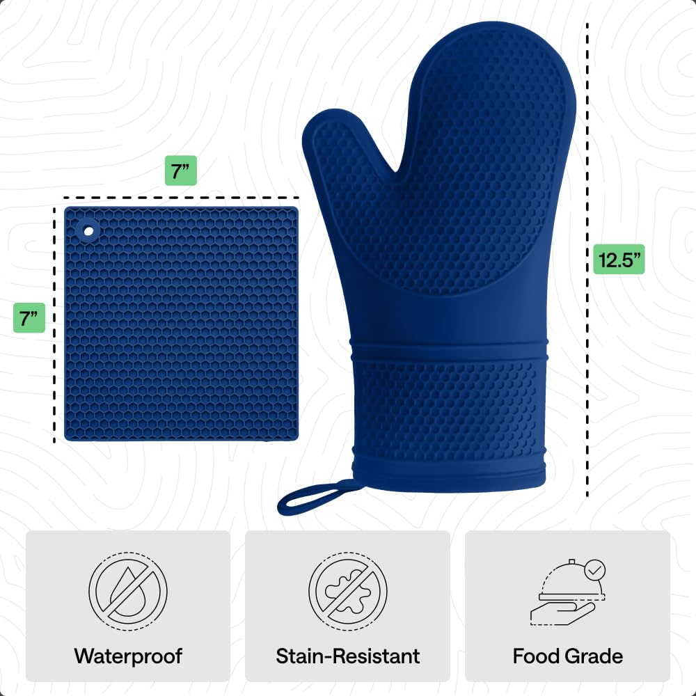 FOOD GRADE: tested to be safe for direct contact with food, these mitts are food grade and a perfect choice for any home; plus, oven mitt is 12.5 inches long and trivet is 7 by 7 inches long to allow for maximum coverage