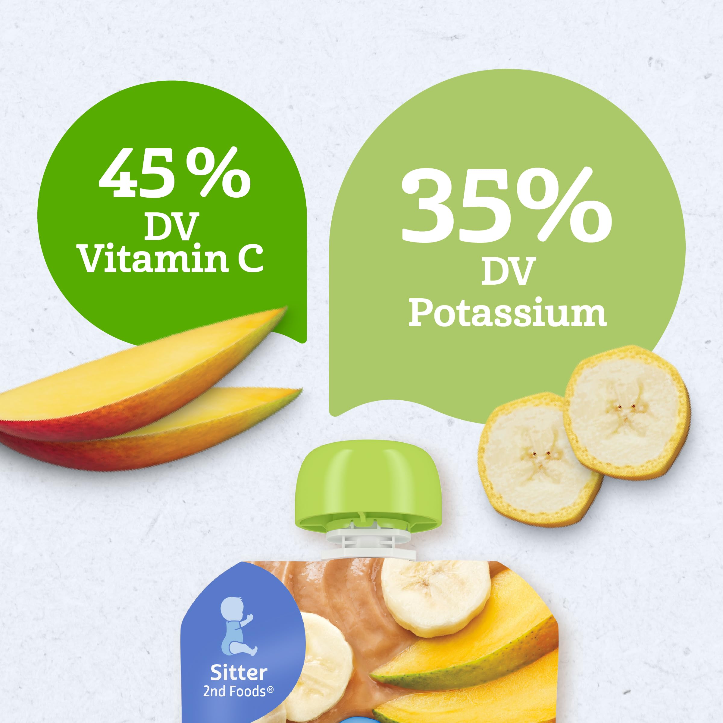 Our Gerber Organic Banana Mango Puree Pouch is crafted with wholesome ingredients, making it a premium choice for your little one. This fruit puree pouch has 45% of the daily value of vitamin C, 35% of the daily value of potassium and two servings* of superfoods. These stage 2 Gerber baby food pouches are designed for babies who are ready to explore new textures and flavors, making them a great addition to your baby's diet. Gerber baby food understands the importance of providing wholesome food as your baby grows and develops. Our Gerber baby food fruit puree is ideal for parents who seek quality in their baby's diet. *2 servings superfoods fruit (banana, mango). 1 fruit serving is 3 tbsp for babies