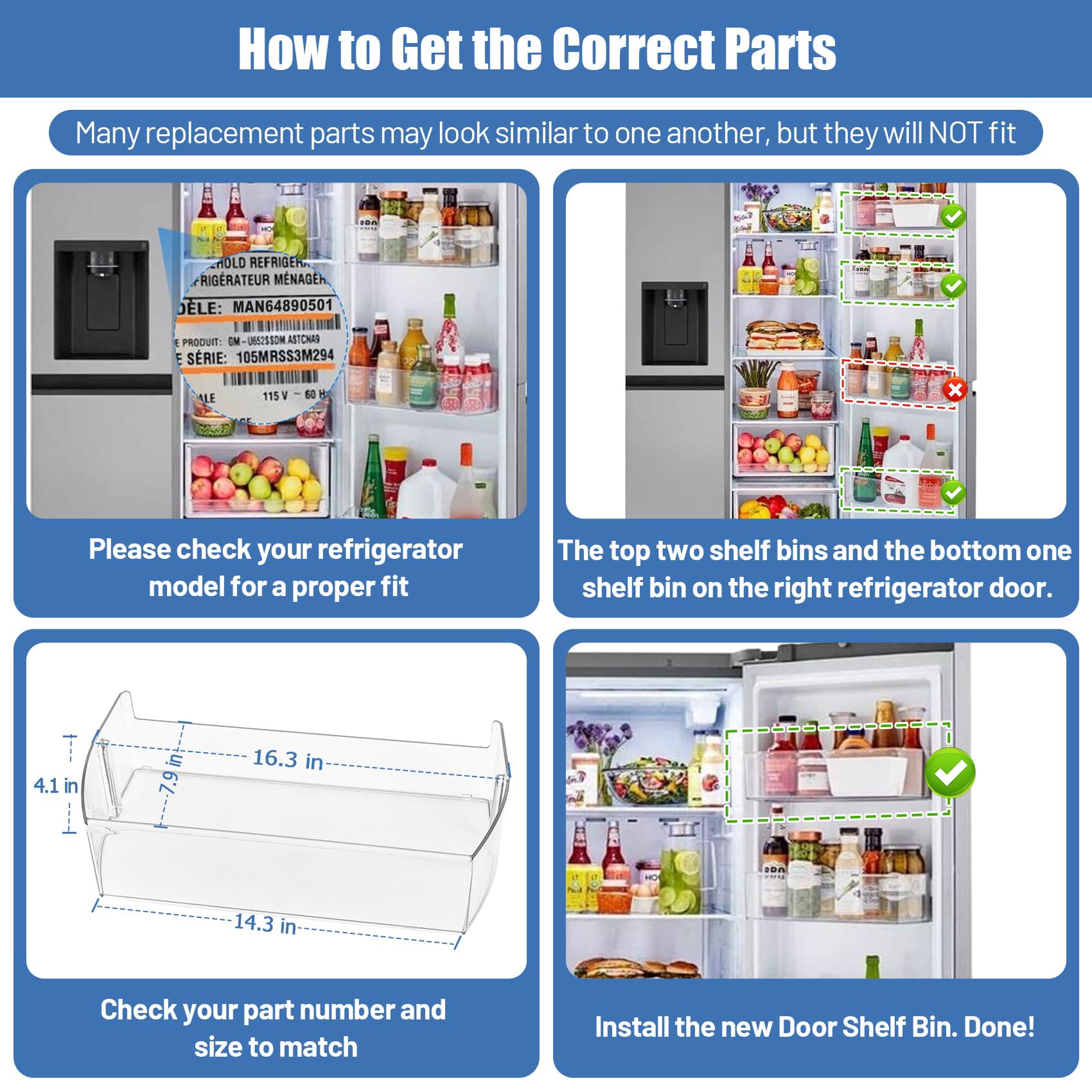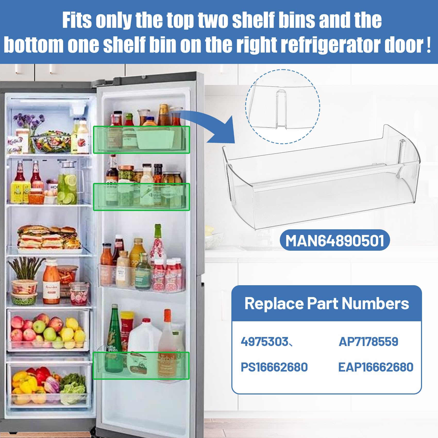 Pre-Purchase Notes: NOTE!! The MAN64890501 fridge door shelf bin is only compatible with the top two bins and the bottom one on the right door of LG refrigerators.The MAN64890501 refrigerator parts measure 16.3(14.3) x 7.9 x 4.1 inches.(Here, 16.3 inches refers to the top length of the bin, and 14.3 inches refers to its bottom length) If the dimensions deviate by more than 1/8 inch, it will not fit your fridge. MAN64890501 refrigerator door shelf bin is compatible with LG refrigerator door bin