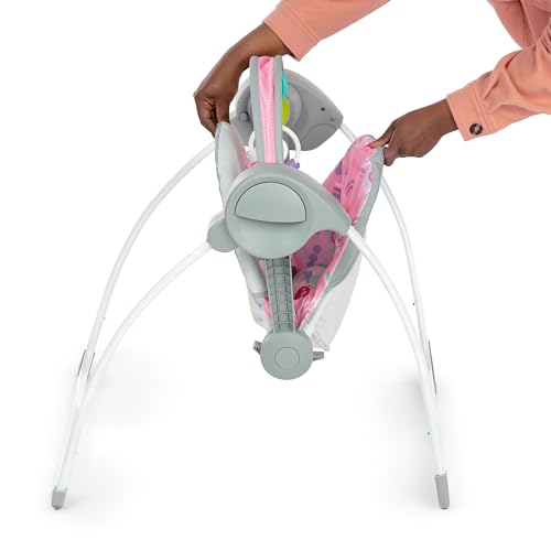 Bright Starts Pink Paradise Portable Swing features a lightweight & foldable design for storage or travel; easy to carry when on the go