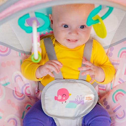 Treat baby to a breezy vacation state-of-mind with the Bright Starts Pink Paradise Portable Swing. Like palm trees swinging in the breeze, your baby will peacefully sway in this comfy seat or leisurely play with interactive toys. You’ll love knowing you can safely rest your little one securely in your sight. With its 2-position recline, this swing is sure to feel just right for baby’s preference. The 2 nature-inspired toys, cheerful rainbow design, and elephant and monkey friends will keep your baby in good swinging company. Features an easy-to-remove toy bar so you can easily access your baby. With 10 cheerful melodies, swing time is song time, and an adjustable five-point harness keeps baby snug in their deep comfortable seat. Compact as it is cozy, the lightweight and foldable design makes it easy to pack up this baby swing for travel or storage. This swing is packed with features: TrueSpeed technology means you can choose from 6 swing speeds, even as baby grows from newborn to infant. And with WhisperQuiet technology, the only sounds you’ll hear are the sweet sighs and babbles from your happy baby. Swinging and songs powered by 4 C batteries (not included).