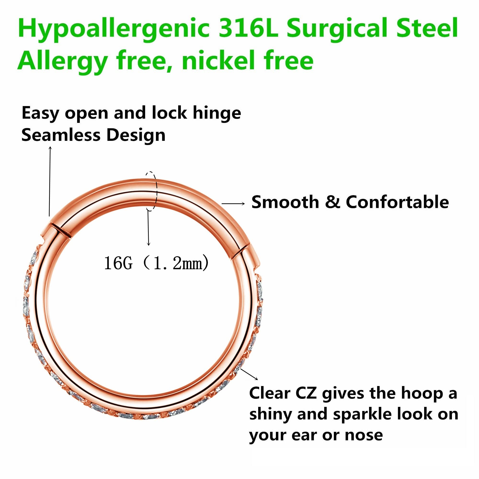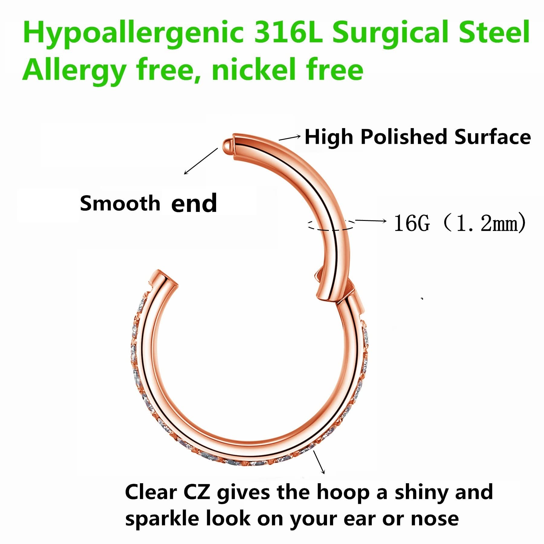 Hypoallergenic: Made of 316L surgical stainless steel(lead-free, nickel-free, and hypoallergenic,) won't infect your skin, sturdy and durable, can be safely used for a long time.Has a High polished smooth surface and void of sharp edges, no irritation to your skin, comfortable for daily use.Clear CZ gives the hoop a shiny and sparkle look on your ear or nose, the classic silver color and simple design can be used for any occasion.
