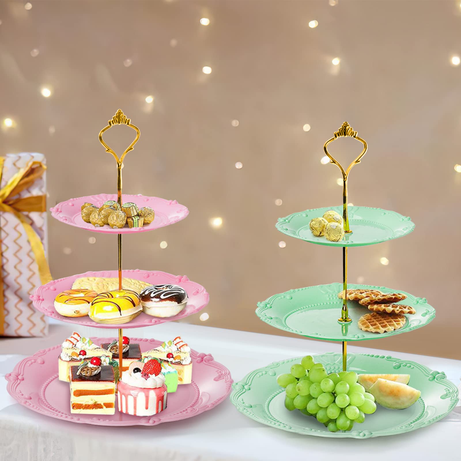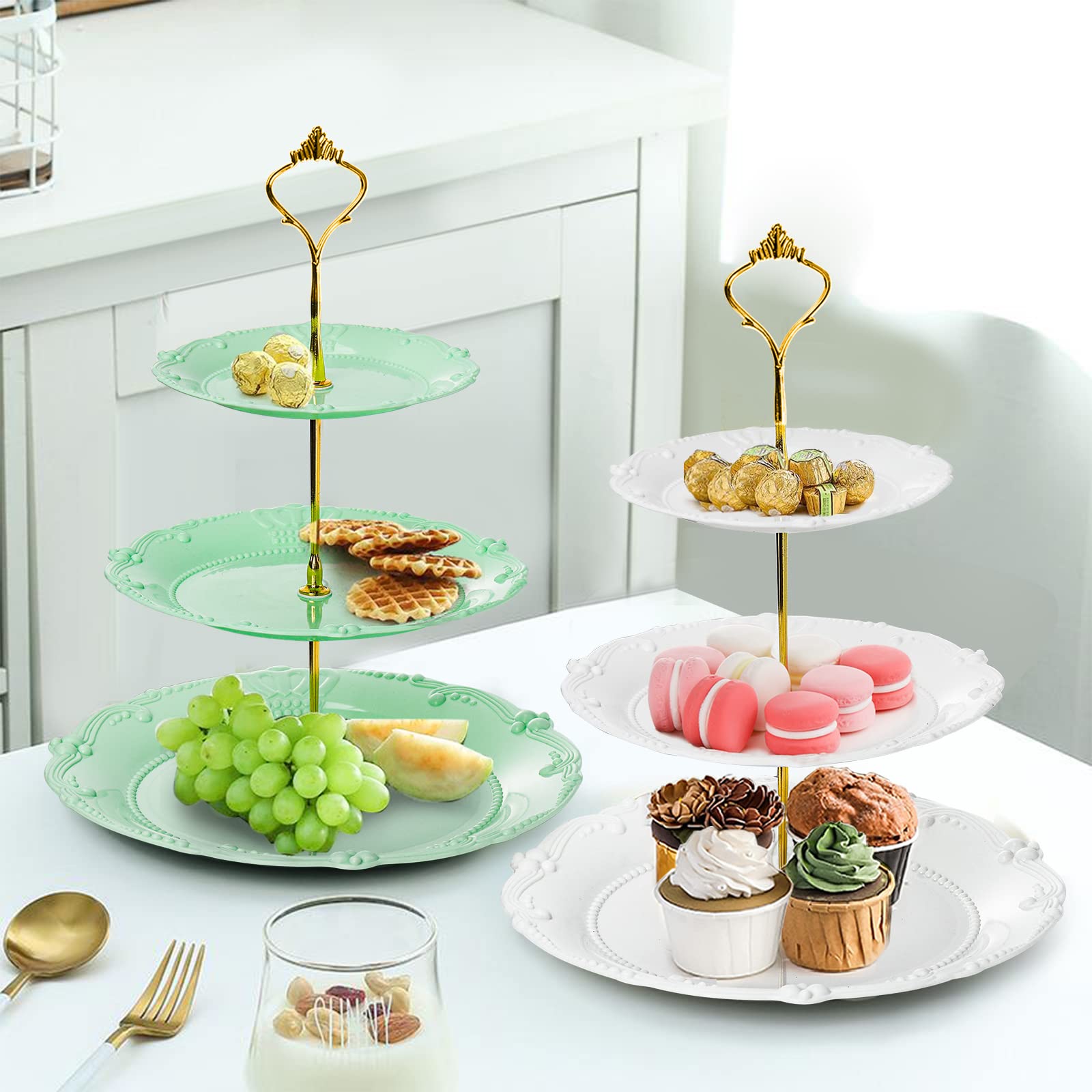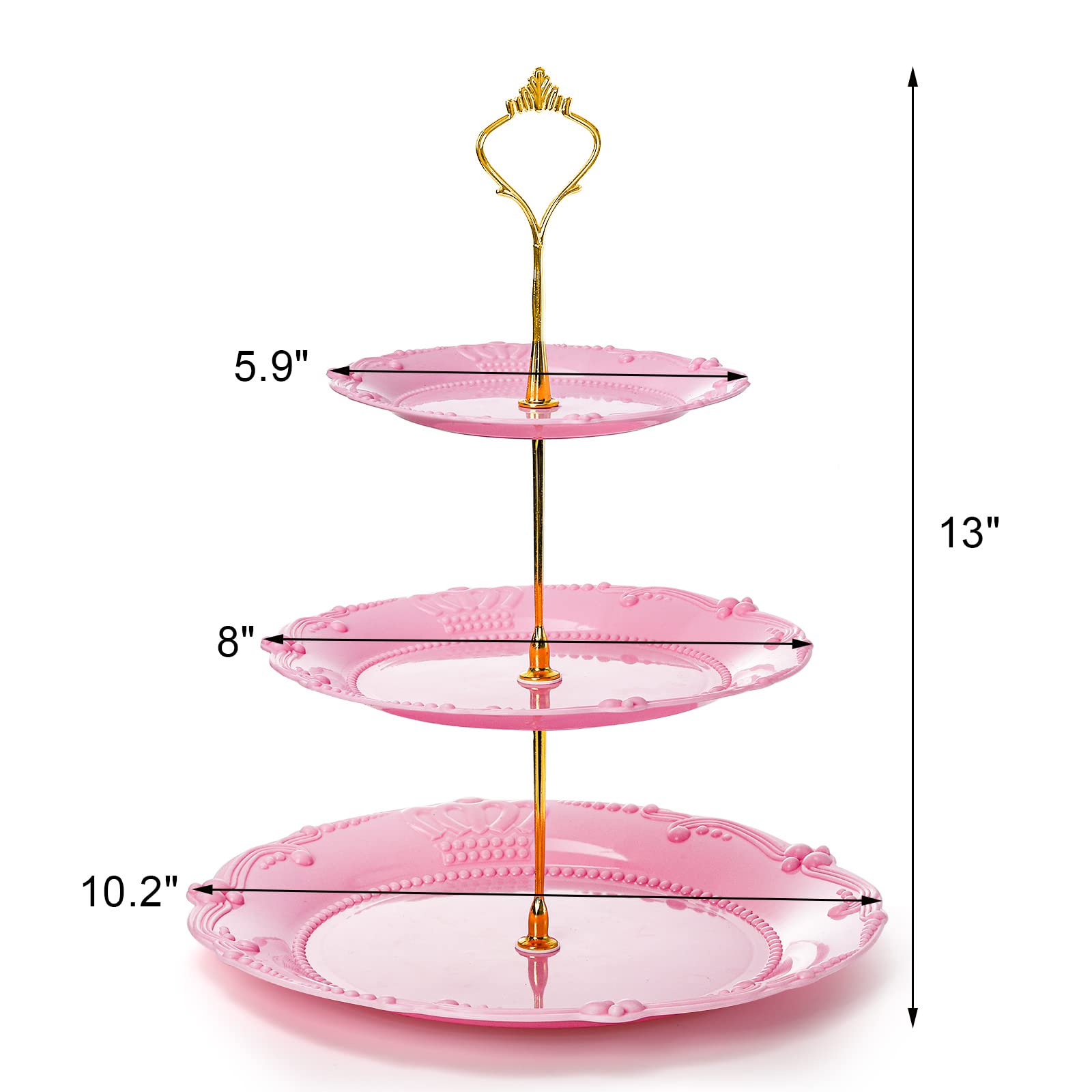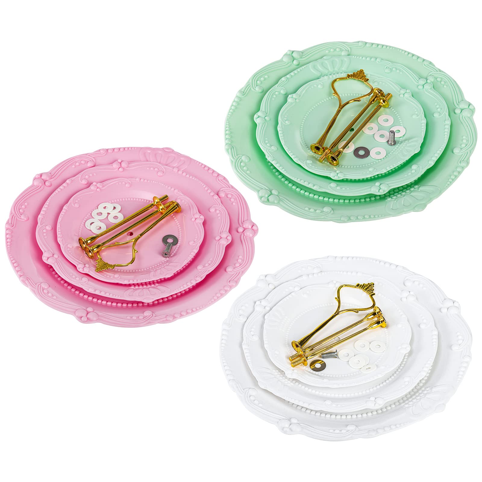 Package Includes: 3 Pack 3 tiers serving trays, white, pink, green, Total Height: 13"/33cm, Small Tray Diameter: 5.9"/15cm, Middle Tray Diameter: 8"/20cm, Bottom Tray Diameter: 10.2"/26cm