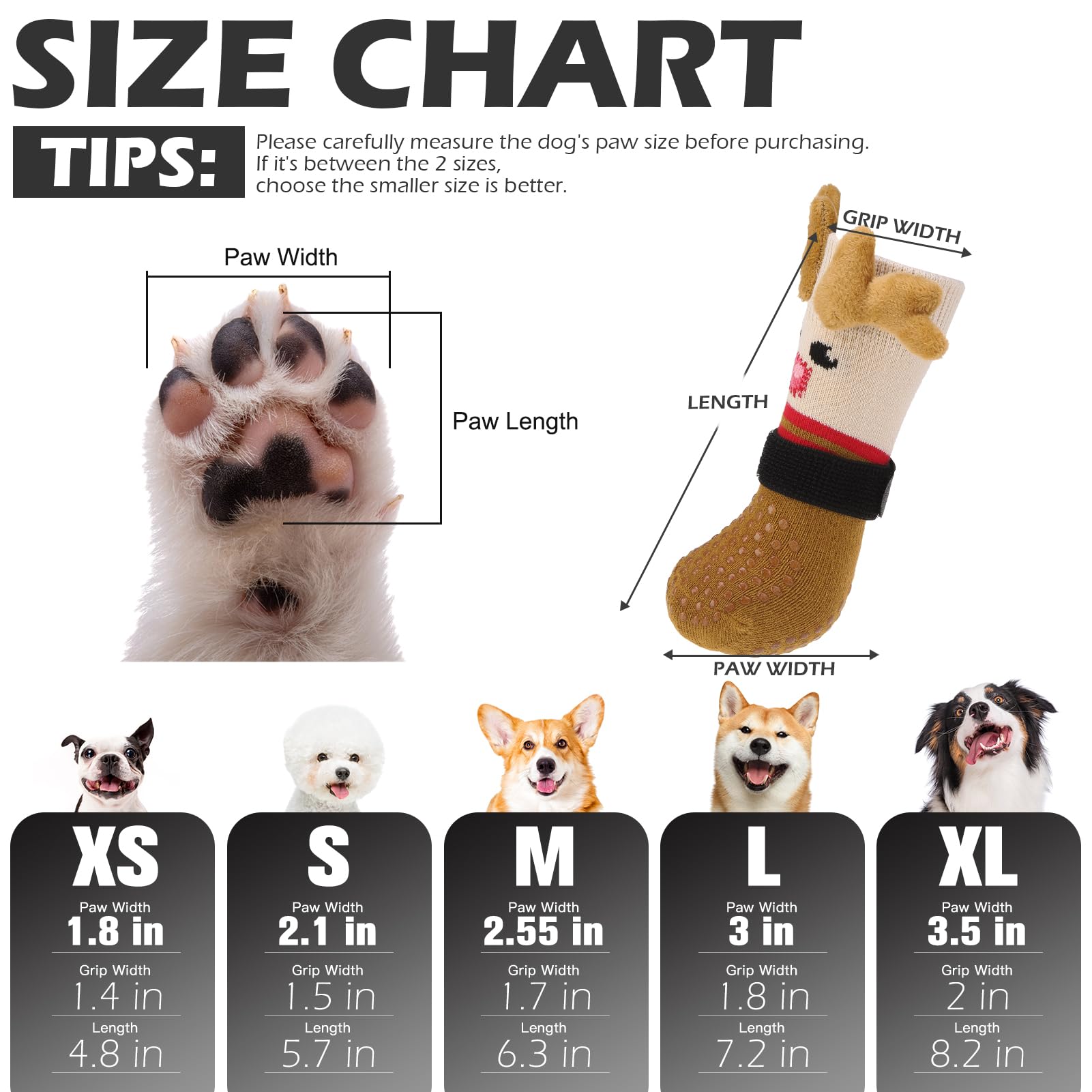 SUITABLE FOR SMALL BREED DOGS: Paw width 2.1", Length 5.7", Grip Width 1.5". Available in multiple sizes to fit a variety of pets. Be sure to measure your pet's paw before purchasing. If your measurements fall between two sizes, we recommend choosing the smaller size, as our socks are made from elastic fabric for a snug fit