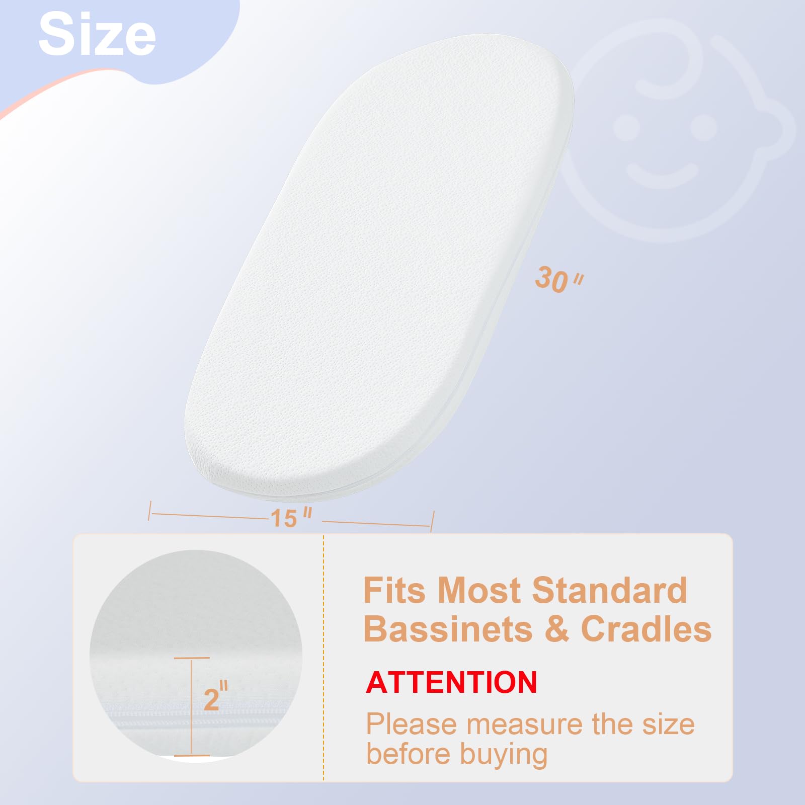 【Suitable for】This bassinet mattress compatible with Moses Basket, Dream On Me Lacy, Snoo, Fisher-Price Baby Bassinet. The bassinet mattress measures 30" x 15" x 2''. Please measure your bassinet mattress before you buy.