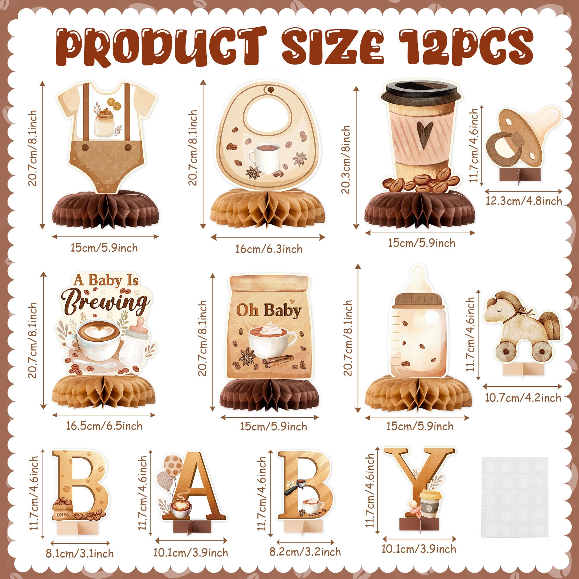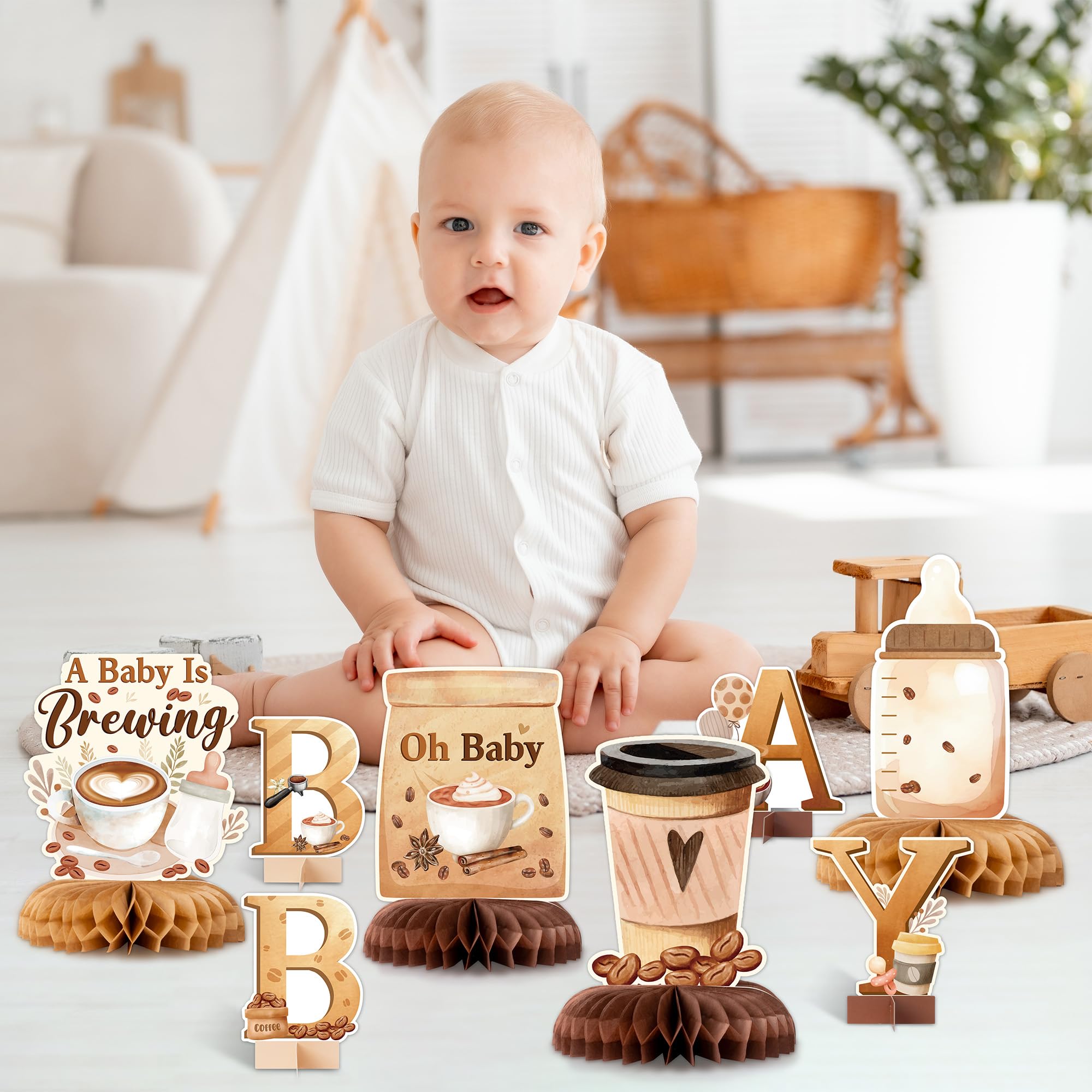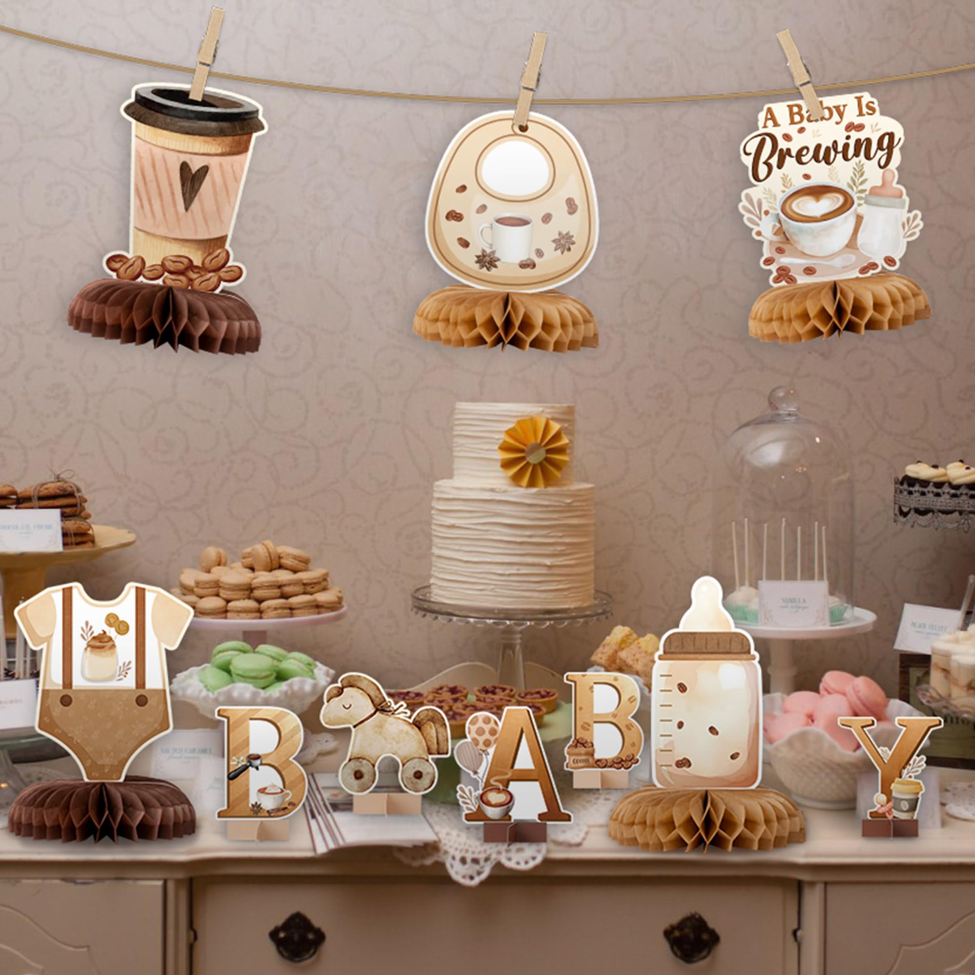 Coffee Brown theme: The coffee baby shower honeycomb centerpieces are mixed, which include 6 types such as coffee bean, a baby is brewing and oh baby letter printing on cardstock. The coffee table decorations can create a lovely atmosphere for coffee baby shower