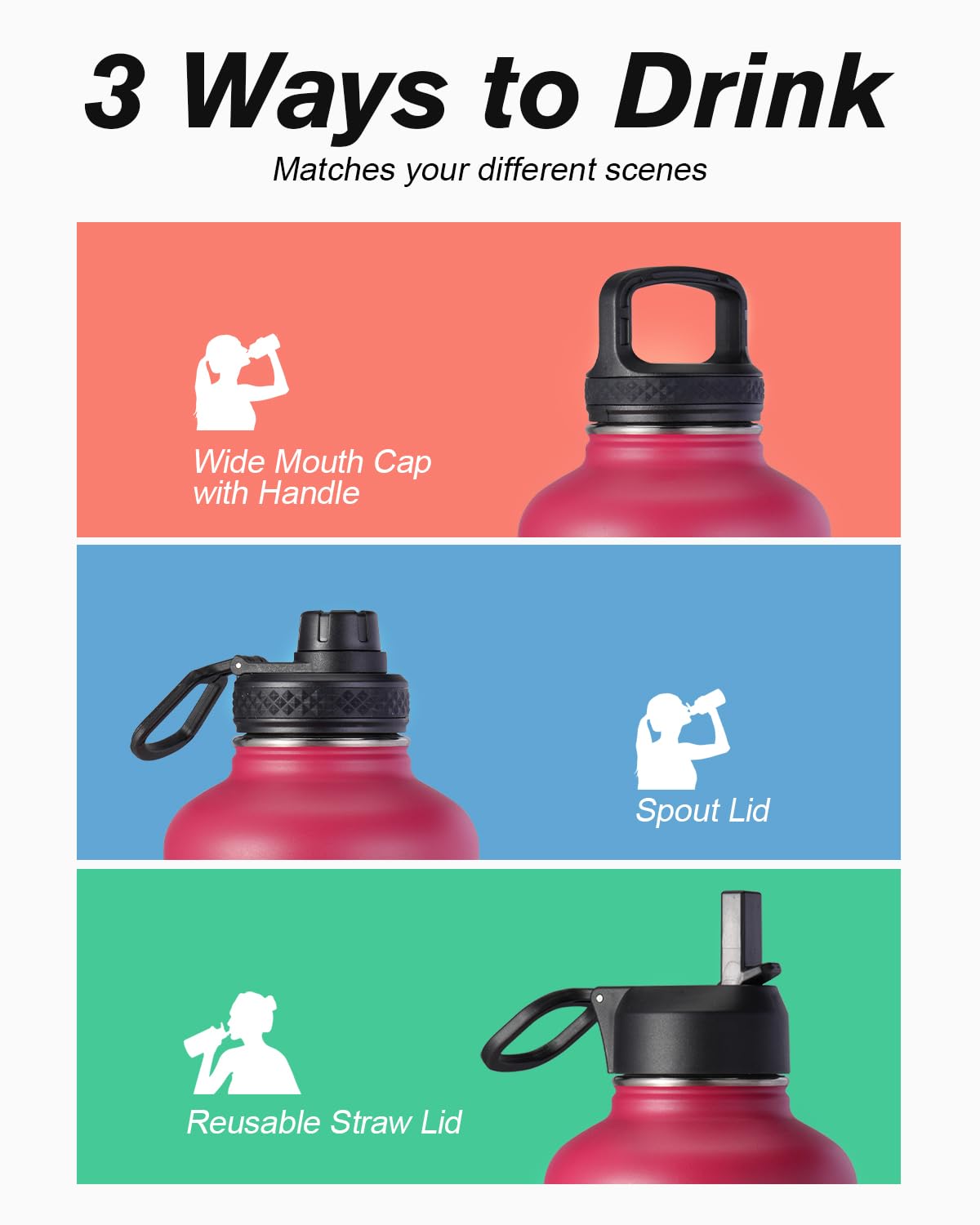 Flexible Drinking On-the-Go: This half gallon water jug comes with 3 different lids. The screw-on lid with flip-up handle is for easy ice refilling with superior portability; spout lid makes it convenient to drink hot liquid and straw lid for sipping cold.