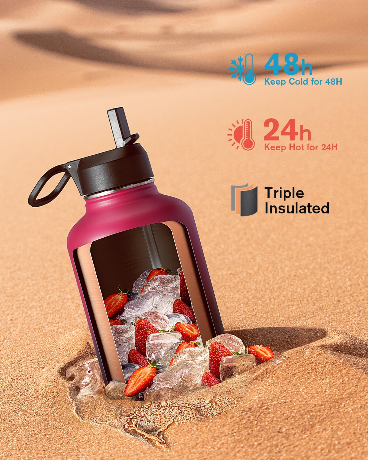 Travel Longer: With 64 oz large capacity, the large water bottle allows you to enjoy your trip easier with fewer refills, perfect for hiking, camping and sport events. It's easy to stay hydrated and refreshed on exciting adventures with such a versatile bottle.
