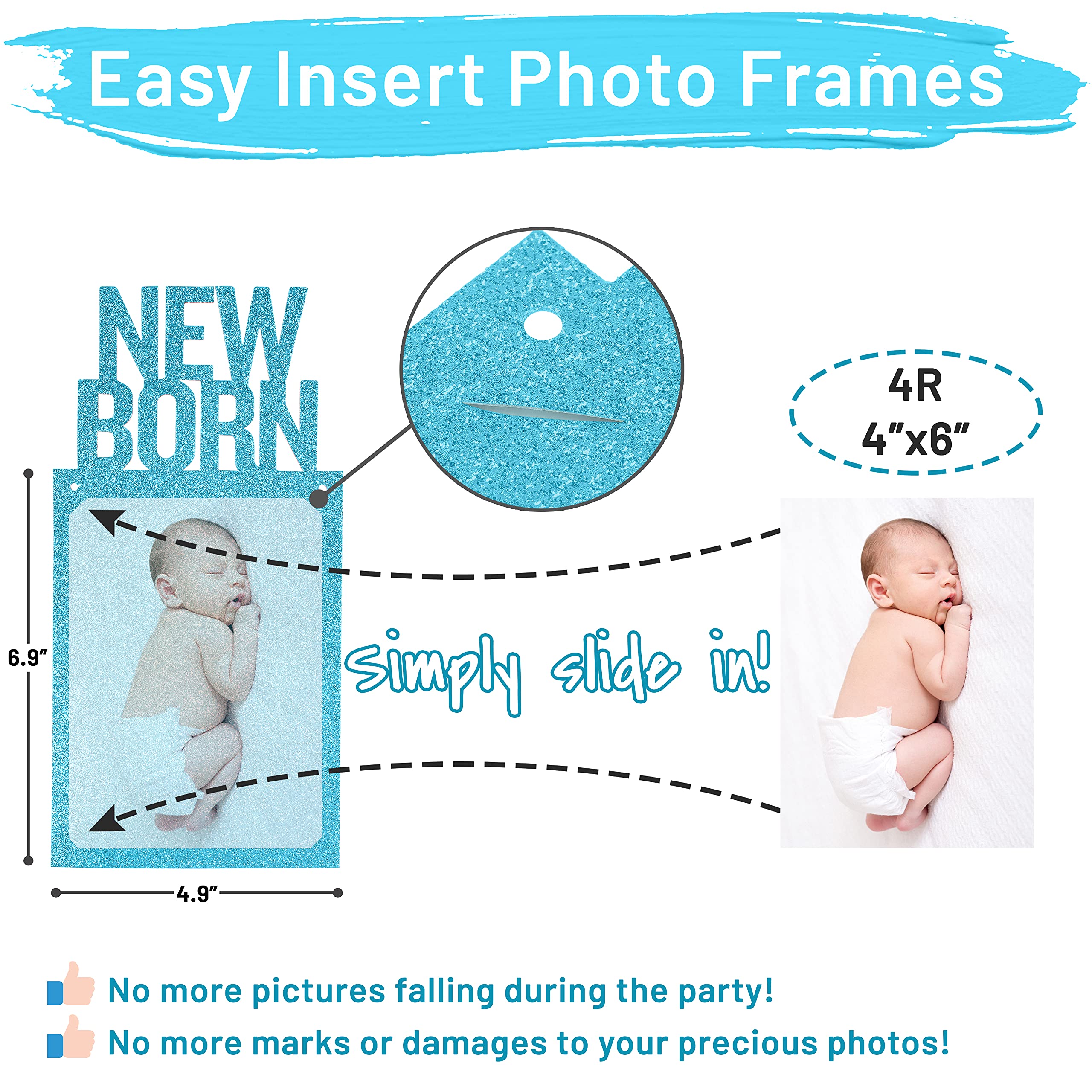 NO MORE FALLING PICTURES DURING THE PARTY – Our banner comes with photo insertion frames that will make your preparation simple and quick! Simply slide in the 4R photo (4"x6") to the frame and you're ready to show the beautiful banner with the cutest photos to your friends and family. (Others are giving glue to attach)