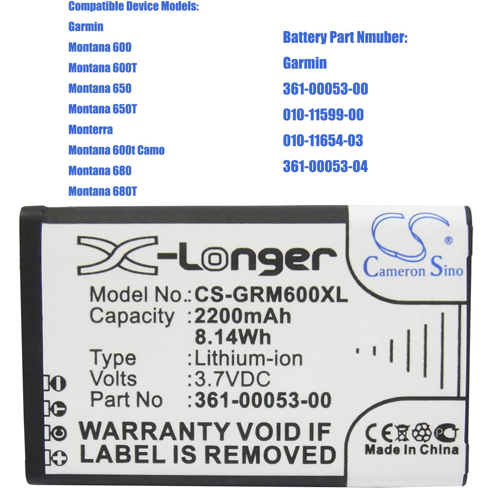 ➤Cameron Sino As a professional digital battery manufacturer, Cameron Sino focuses on the stability, safety and compatibility of replacement batteries. Cameron Sino has multiple circuit protection (overcharge, short circuit, high temperature and surge protection) and high quality fire resistant construction. ➤Fit Modelr Montana 600, Montana 600T, Montana 600t Camo, Montana 650, Montana 650T, Montana 680, Montana 680T, Monterra ➤Compatible Model 010-11599-00, 010-11654-03, 361-00053-00, 361-00053-04 ➤Notice Before Purchase - Be carefully check the model number of your device and the part number of your original Battery to see if this Battery is compatible with your device. - A new battery will achieve its best performance after 2 or 4 complete cycles of charge & discharge. - When you install it, be sure the connector has been properly connected to your device. - Do not use low quality third-party adapter charger to charge your device, that will shorten the battery's life.