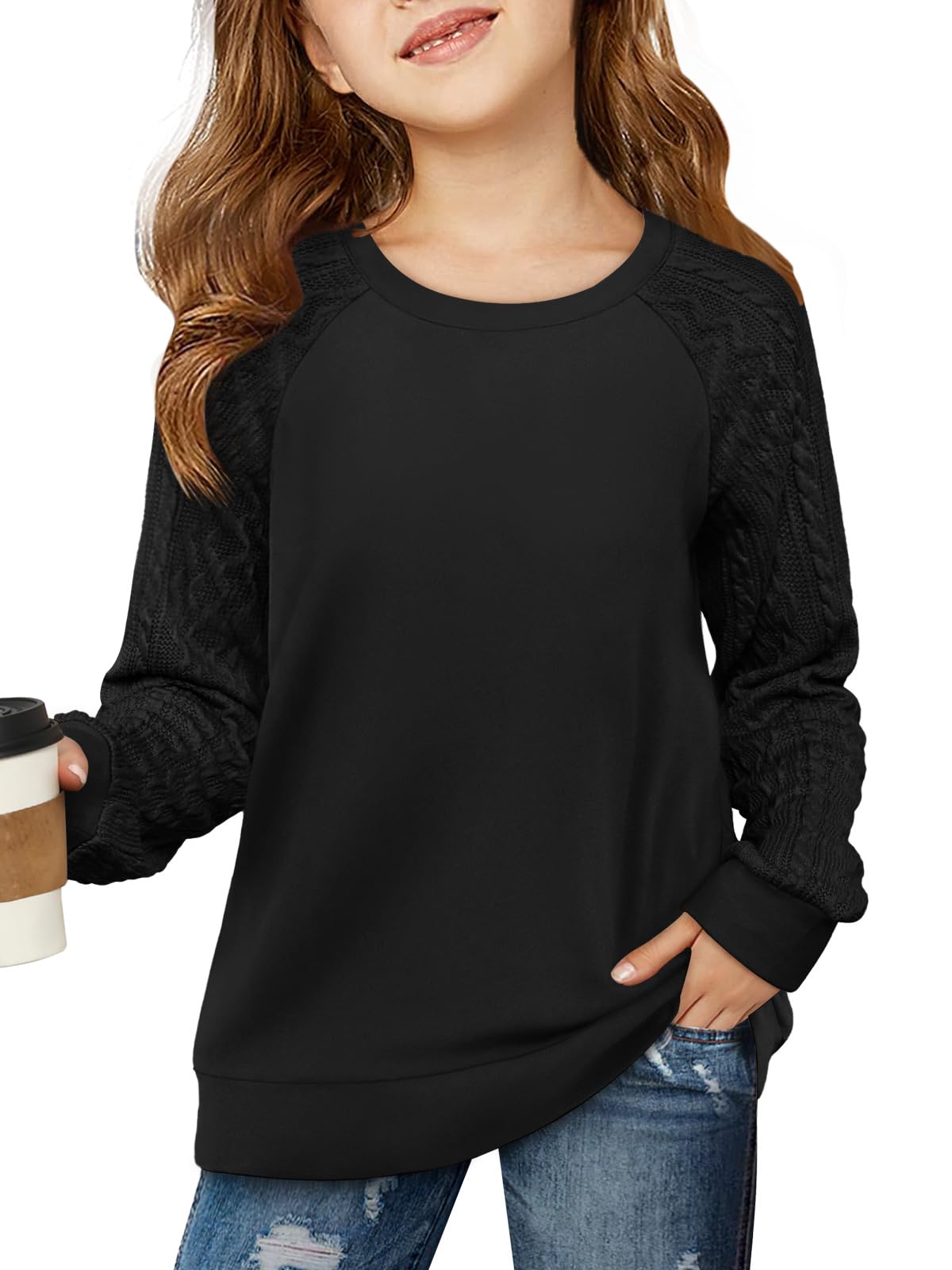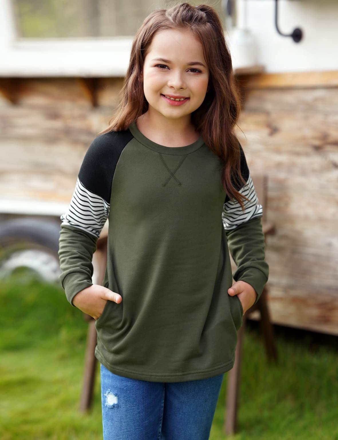 ♥ [Style]:The girls crew neck top with the regular fit can better suit your girl and modify your girl's shape.The top with side pockets is stylish and special for girls. Easy to pair with leggings and skirts