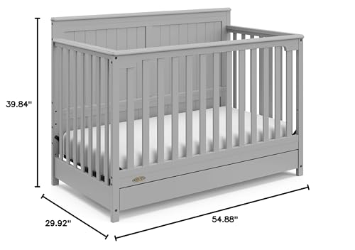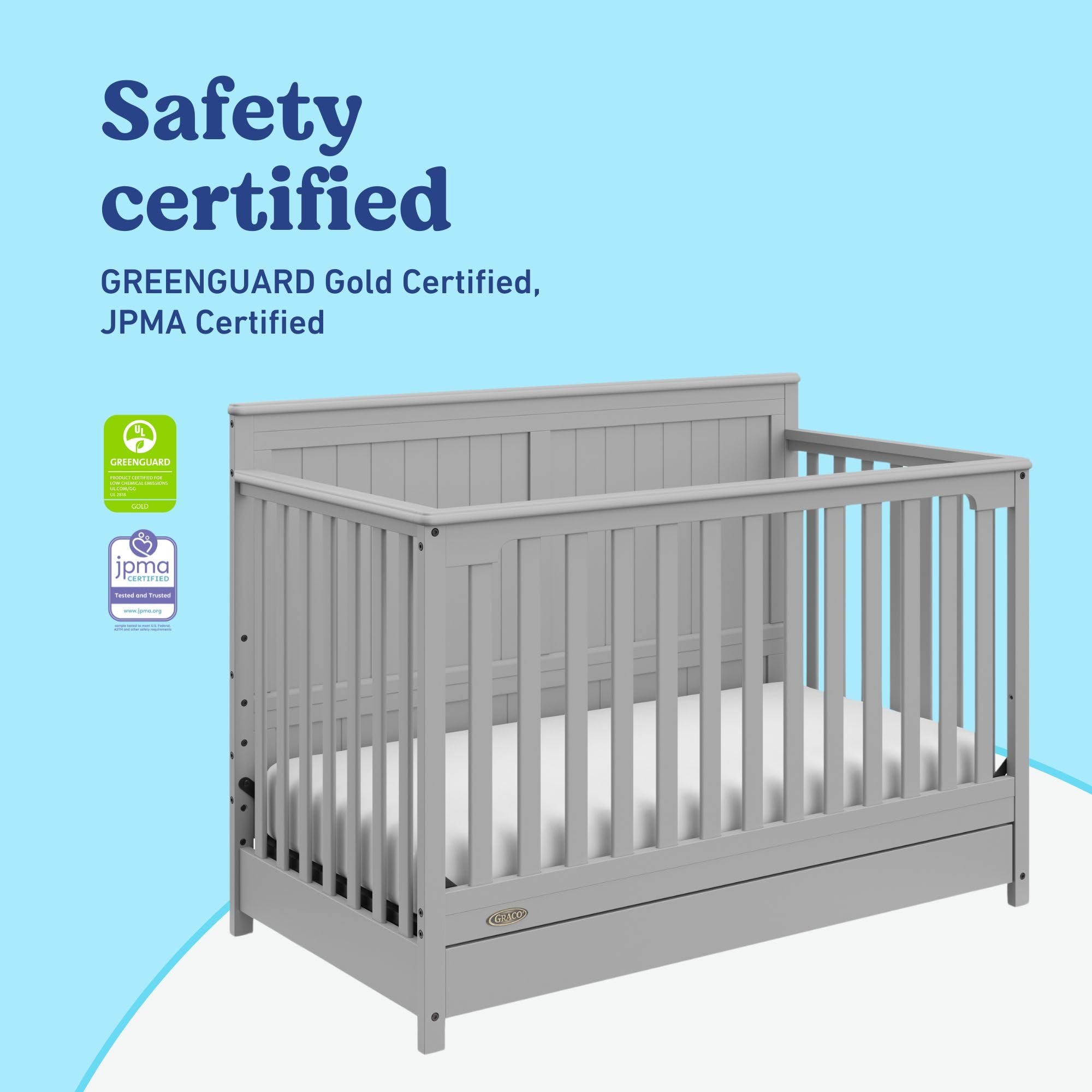 Bring your dream nursery to life with the Graco Hadley 5-in-1 Convertible Crib with Drawer. With its full-panel headboard, full-size under-crib storage drawer, and timeless design, the Hadley is the perfect addition to any nursery. The Hadley is crafted from pine wood, engineered wood, wood composites, and includes Euro drawer glides, and its applied finish has been tested to meet or exceed the applicable ASTM and CPSIA safety standards. Also, the Hadley is Baby Safety Alliance Verified β meaning it has been expert tested by third-party, accredited laboratories to meet or exceed all of the applicable category voluntary and mandatory safety standards. Designed to adapt to your growing baby, the Hadley is equipped with an adjustable mattress support base with 4 different height options, so the mattress support baseβs position can be lowered as your child grows [please note, this crib may only be used until your child can easily climb out or is taller than 35 inches (89 cm)]. To support your childβs journey from babyhood to toddlerhood and beyond, the Hadley can be converted from a crib to a toddler bed [compatible Graco Toddler Safety Guardrail (Slats) β 01350-30 Series sold separately)], daybed, and full-size bed with headboard and optional footboard (compatible full-size bed conversion kit sold separately). The Hadley is designed to accommodate any standard full-size crib & toddler mattress (mattress sold separately β we recommend any Graco crib mattress). Graco is the proud recipient of the Parent Tested Parent Approved (PTPA) Seal of Approval for nursery and childrenβs bedroom furniture, and the 2021-2023 Women's Choice Award for 9 out of 10 Recommended Baby & Kids Furniture. Backed by a 1-year limited manufacturerβs warranty. Assembly required. Mattress, guardrail kit, and full-size bed conversion kit each sold separately.