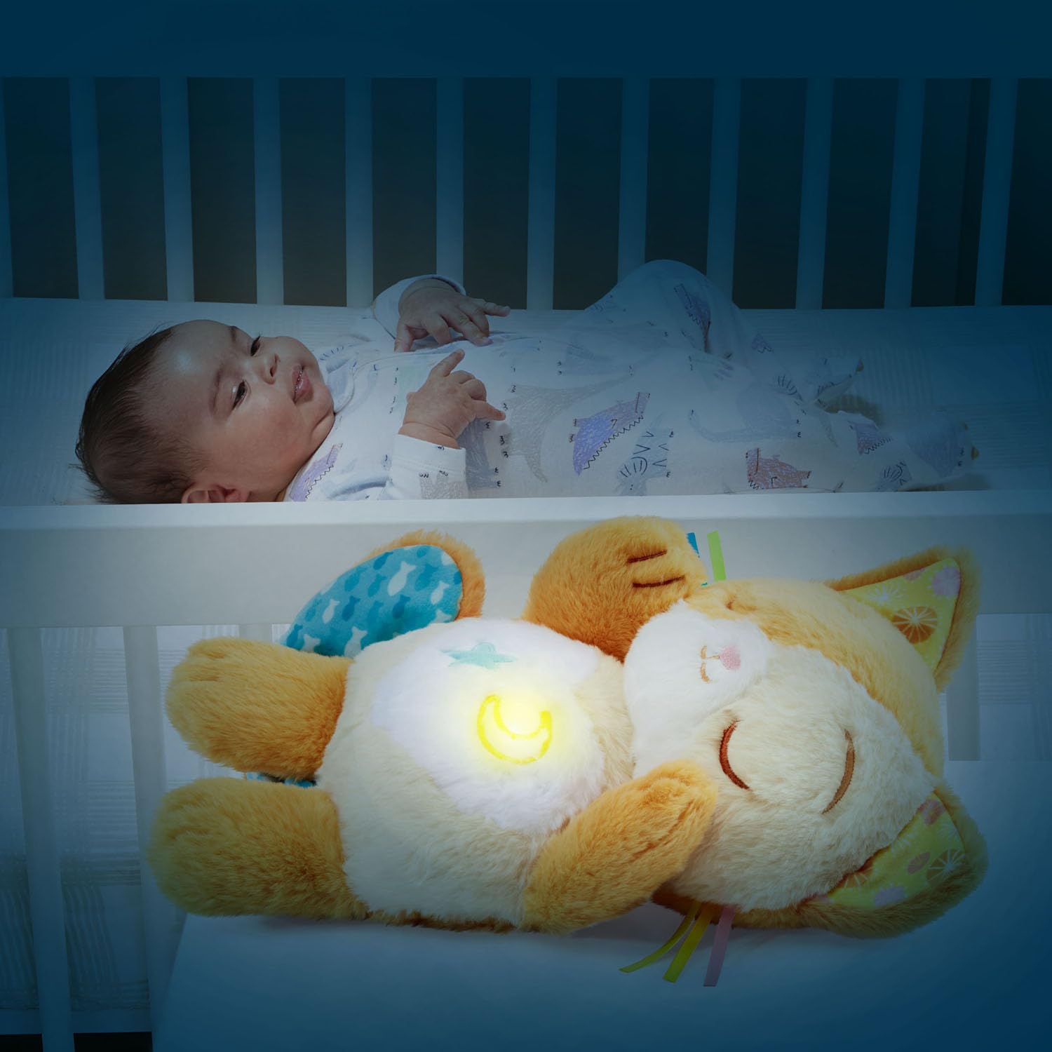 Purrfect for catnaps and bedtime, this plush kitty cat will help little dreamers self-soothe as they snooze. Set the feline friend next to the crib and help babies feel comforted while drifting off, letting the calming motions lull them to sleep. Take a deep breath: the rhythm of the head, nose and tummy movements can be adjusted. Other customizable features include changing the brightness of the moonβs glow and whether melodies, nature sounds and purrs should play for 15, 30 or 45 minutes. Kitties love to be clean! The head is surface washable and body is hand washable. Sweet dreams! Intended for ages birth+. Requires 4 AA batteries. Batteries included for demo purposes only. New batteries recommended for regular use.