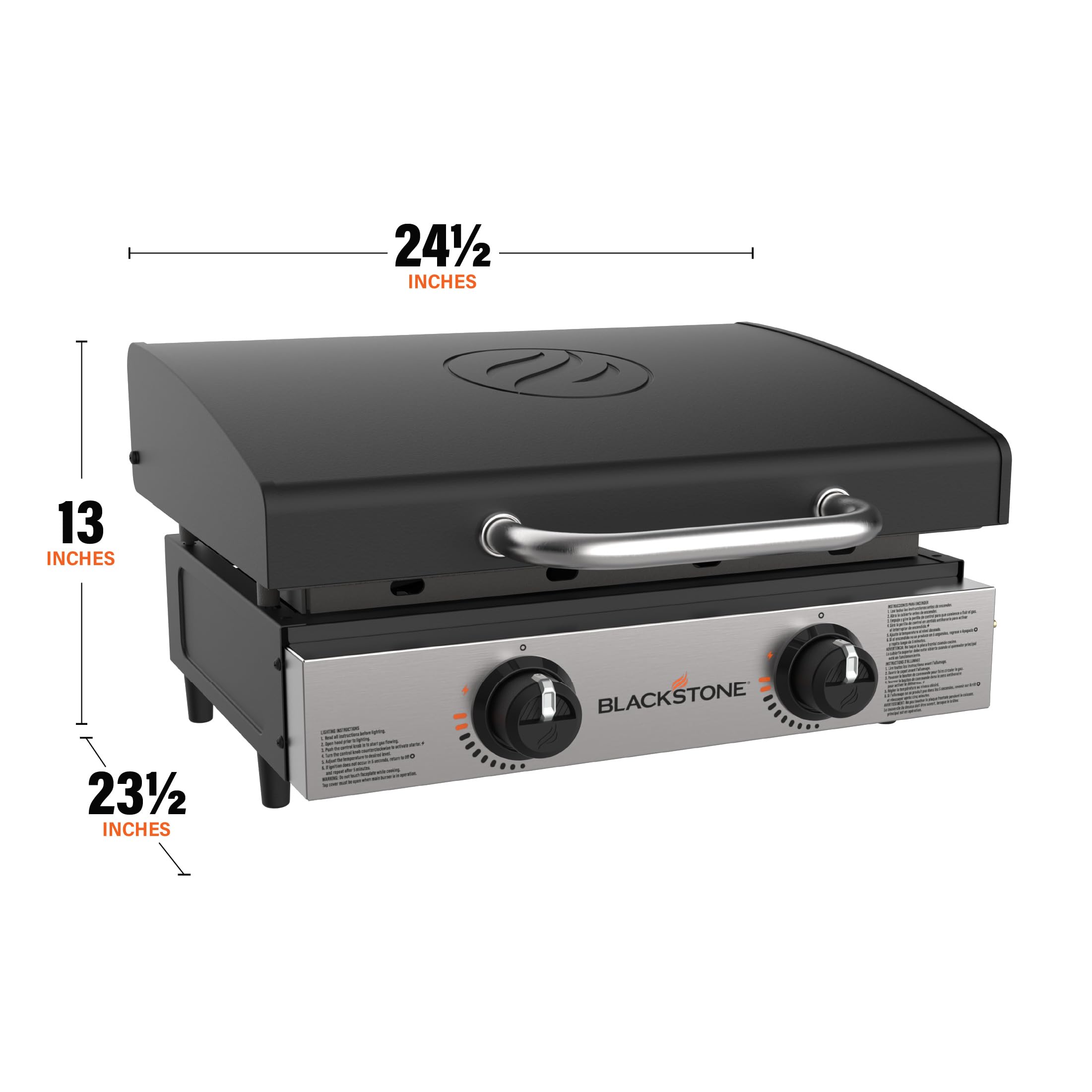Improve your outdoor cooking experience with this Blackstone 22” Tabletop Griddle. The compact, portable design of this griddle makes it perfect for taking with you whether to the tailgate, campsite, park, or beach. Enjoy cooking on a versatile griddle top that is powered by 24,000 BTUs through two H-style burners that evenly heat the whole cooking surface. Make breakfast, lunch, or dinner and enjoy an easy cleanup with the Blackstone-patented Rear Grease Management System. Use the hood to protect your griddle top during travel or storage so it is always ready for the next adventure. Cook outdoors without compromising on quality with this Blackstone 22” Tabletop Griddle.