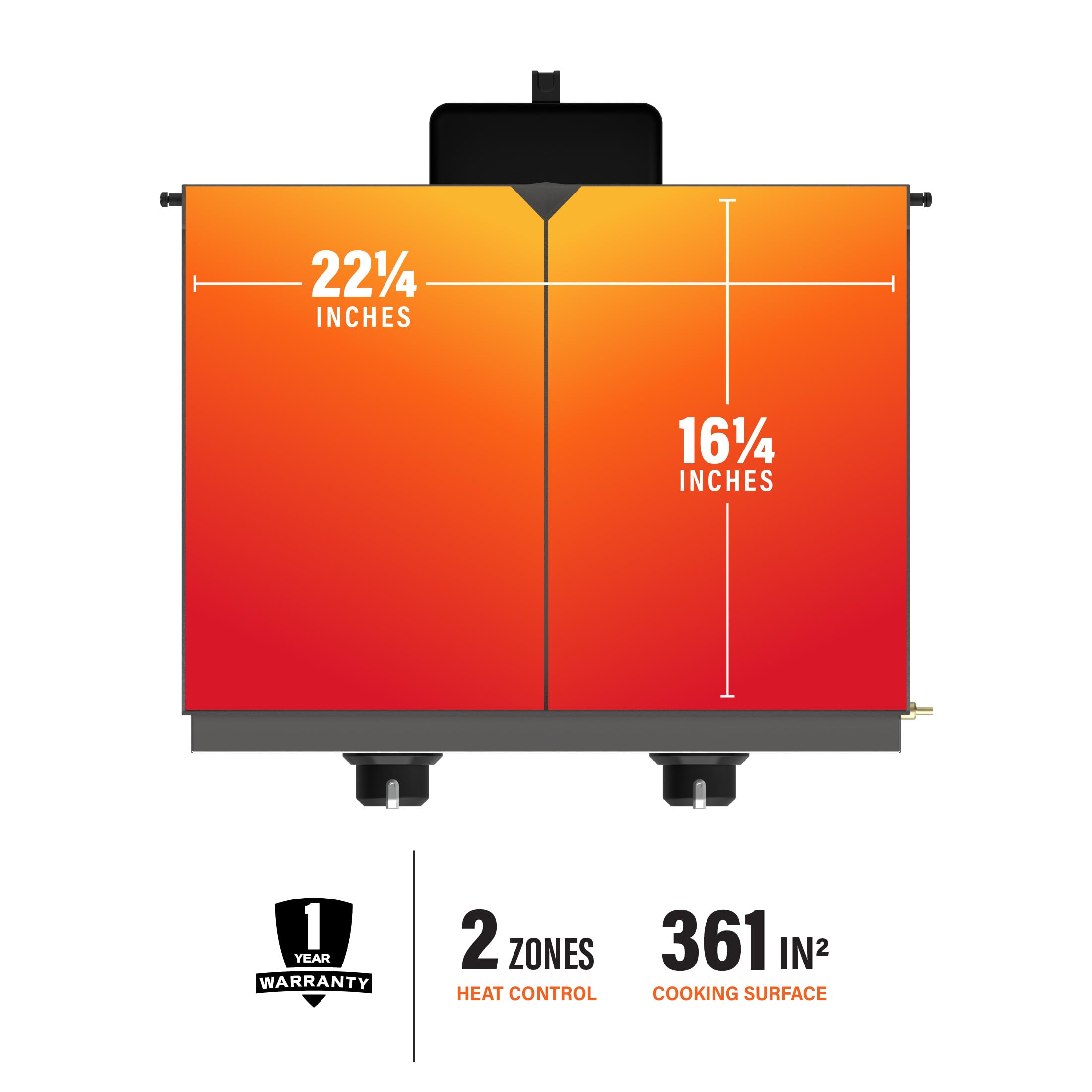 Surprisingly Spacious Cooking Area: This compact griddle is more spacious than you would think. Cook up to 14 burgers at a time on the 22” griddle top with 361 square inches of cooking space.