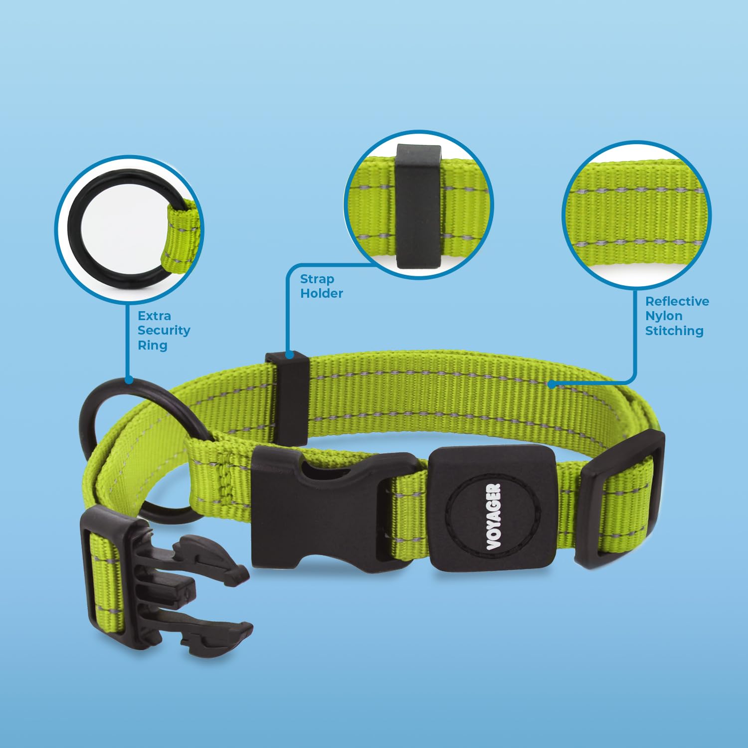 Must-have dog safety features including a security ring to prevent escaping from a loose collar, a swivel hook to avoid tangling, and a quick release buckle for ease of use