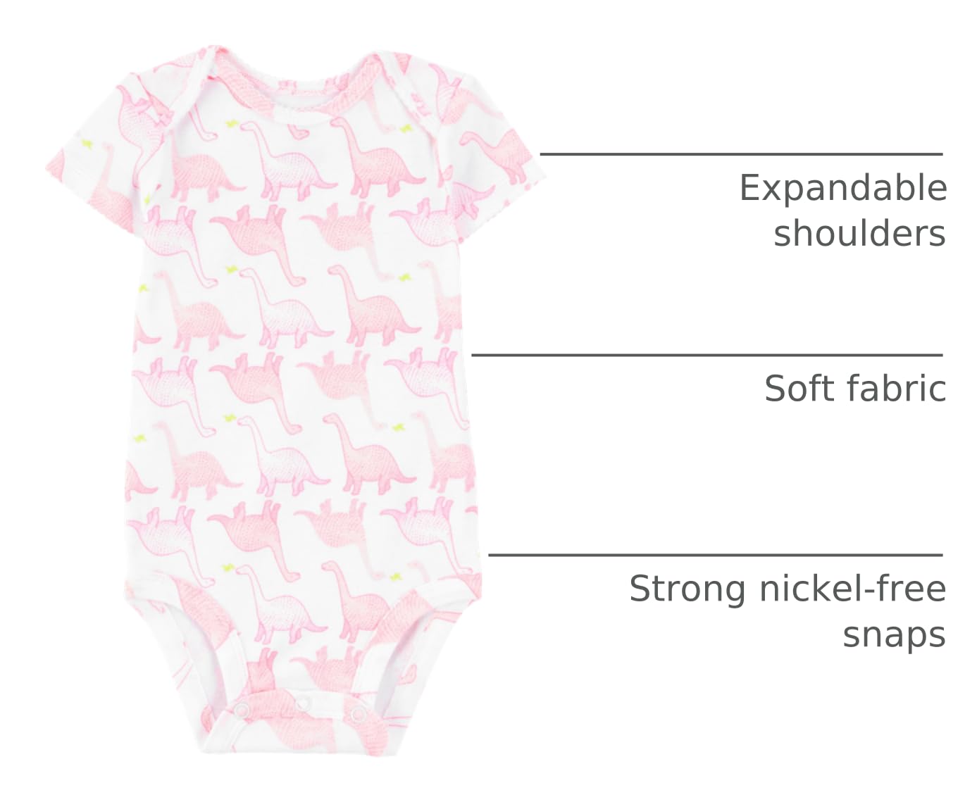 Description Simplify dressing your baby girl with this 6-pack of short-sleeve bodysuits from Simple Joys by Carter's. Each bodysuit features expandable shoulders that make it easy to slip over your baby’s head, while the strong, nickel-free snaps ensure quick and hassle-free diaper changes. Made from soft fabric, these bodysuits are gentle on your baby's skin and perfect for everyday wear. The tagless design eliminates irritation, keeping your baby comfortable all day long. With OEKO-TEX Standard 100 certification, you can trust that these bodysuits are safe and free from harmful substances. Available in a convenient 6-pack, these bodysuits provide exceptional value and are designed to mix and match easily with any outfit. Simple Joys by Carter's delivers high-quality, stylish clothing at affordable prices, making this 6-pack a smart choice for parents looking for both quality and value.