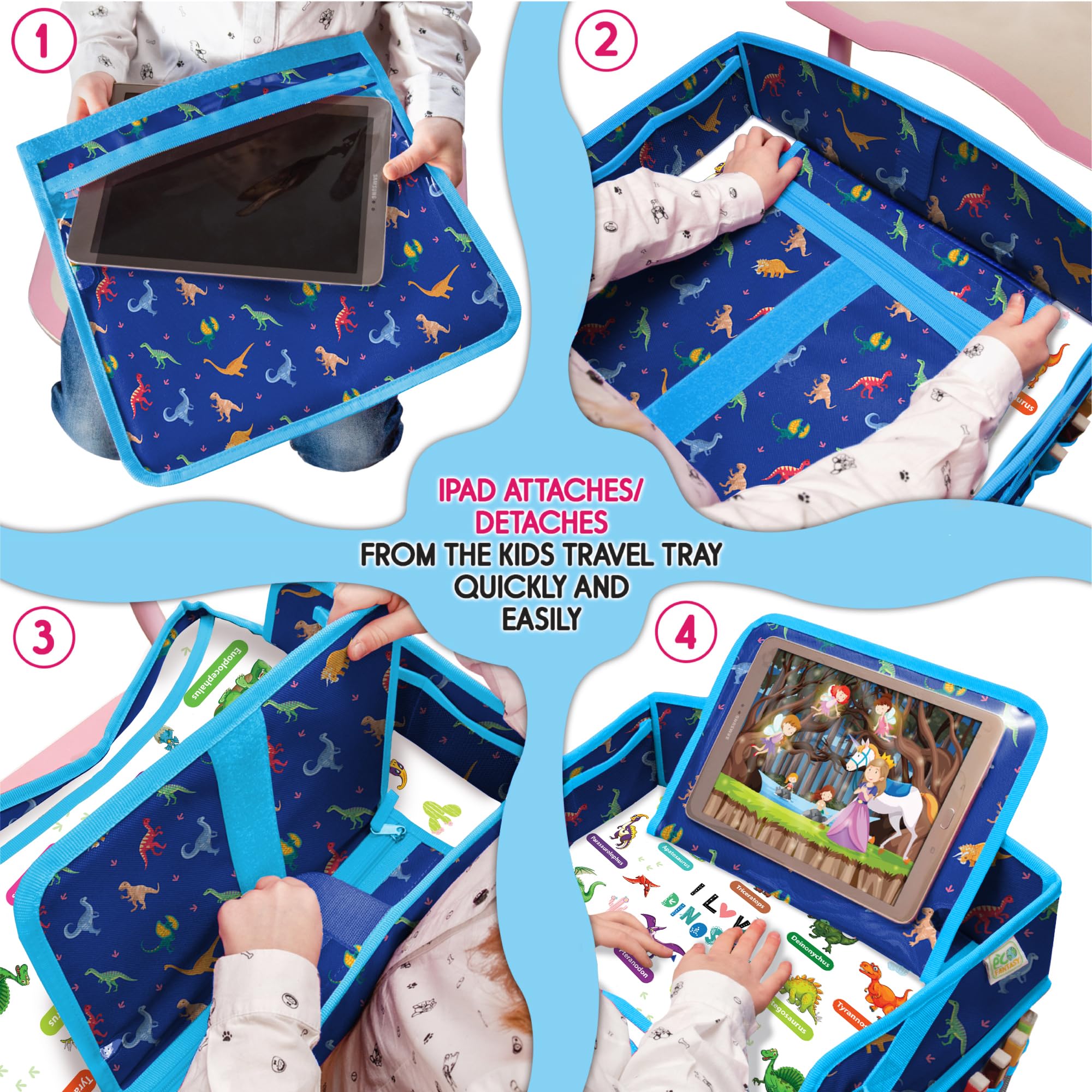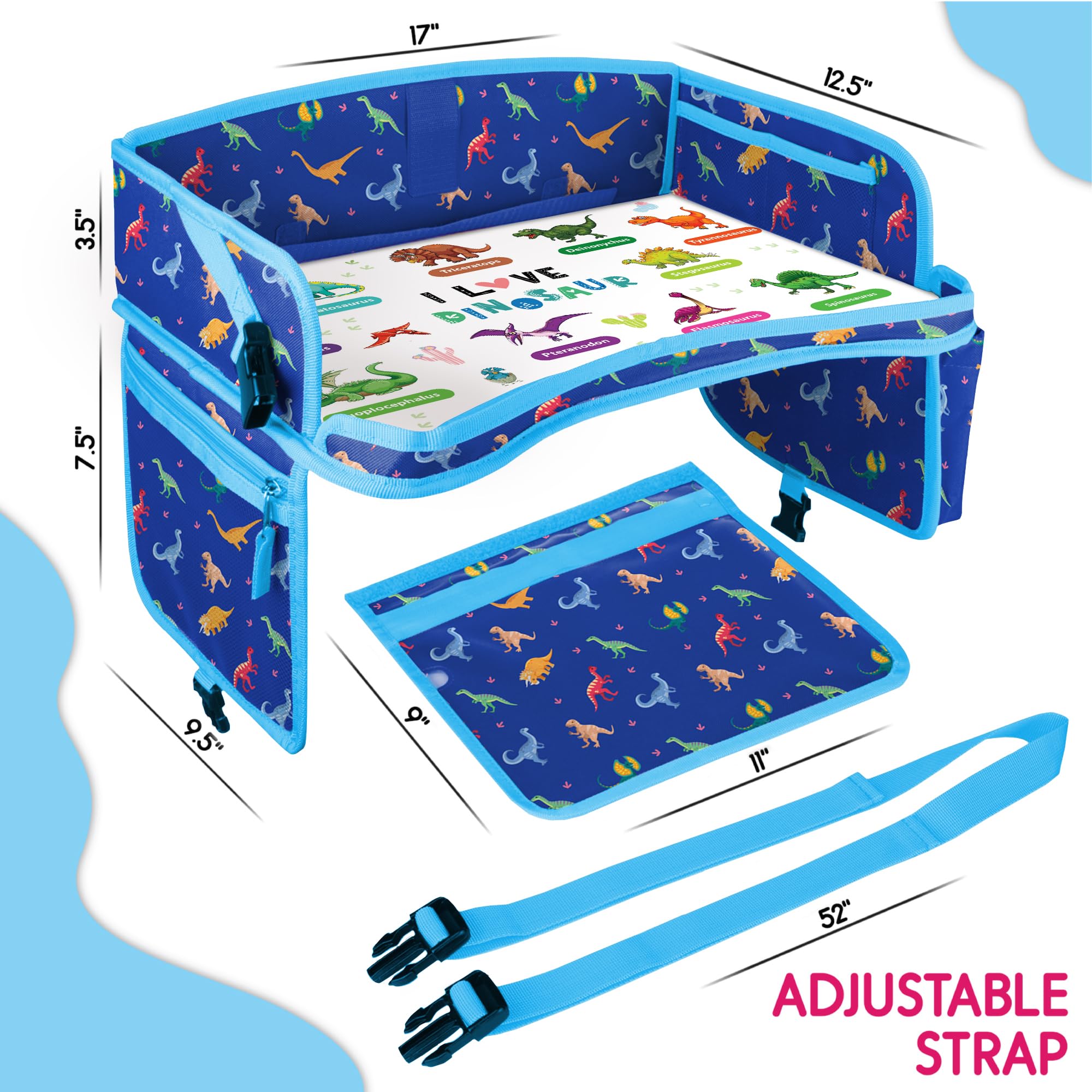 Portable Kids Travel Tray Organizer - We designed our car lap tray for kids with Dinosaurs illustration which coupled with the wide design provides the perfect spot for kids to learn, play, eat snacks when flying a plane, riding cars, train, or bus. It keeps toddler travel toys organized and within reach, perfect as car travel essentials for long trips. Stay organized on the go!