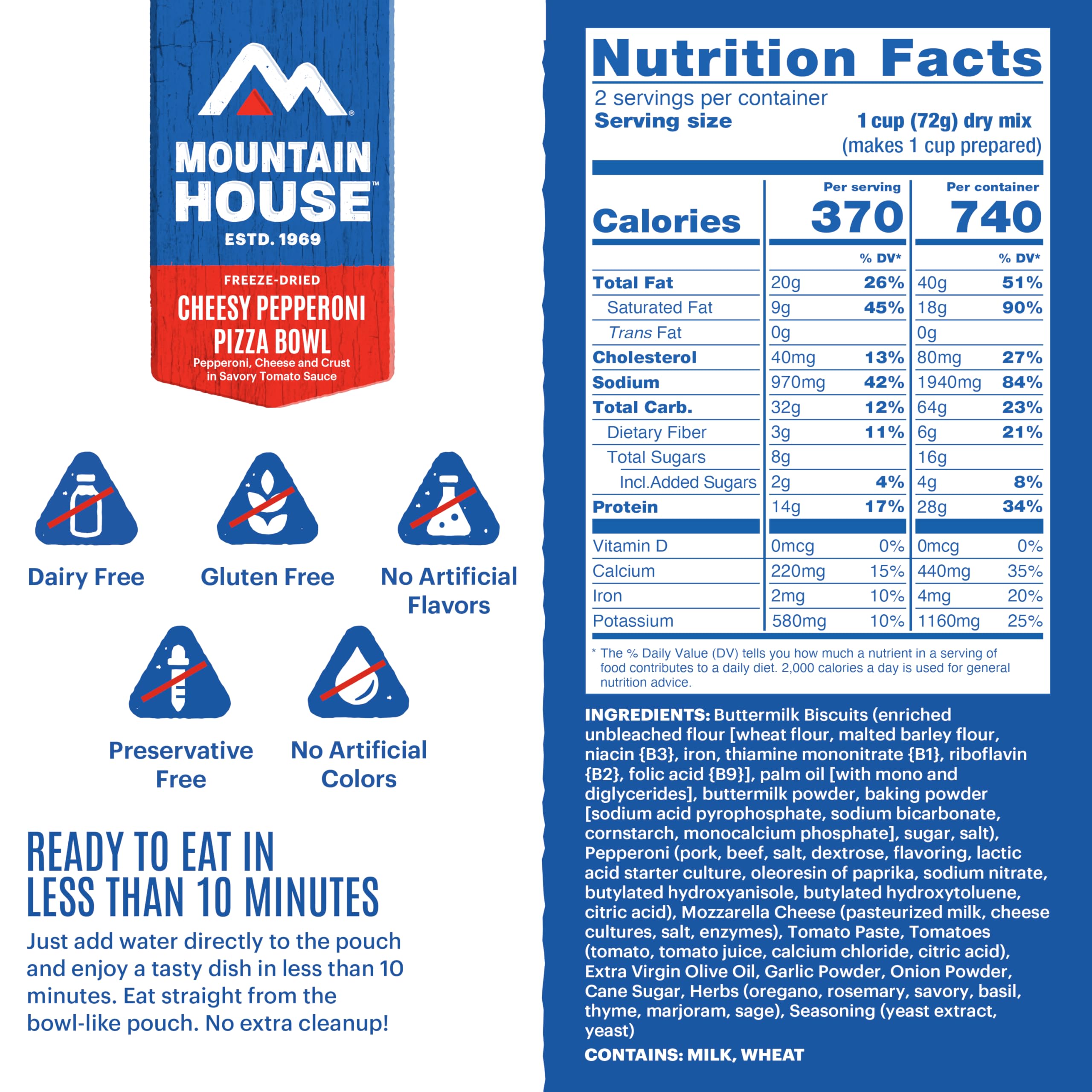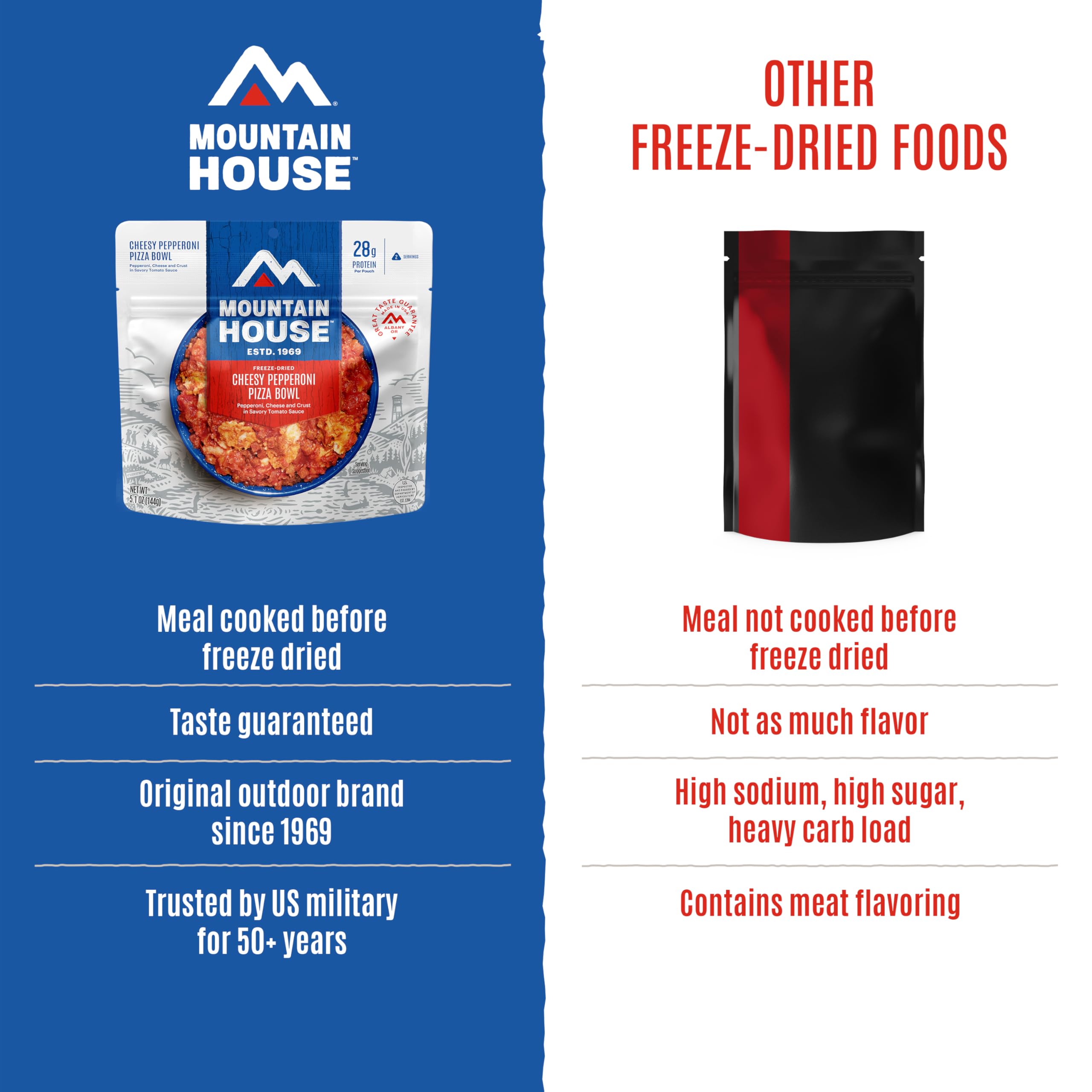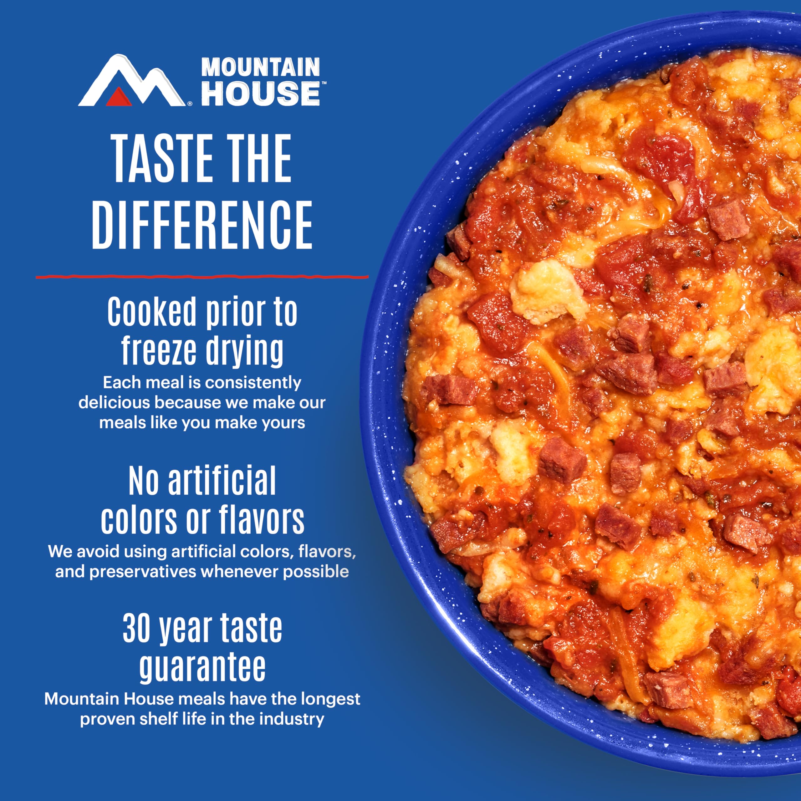 Since 1969, Mountain House has been the trusted leader in freeze-dried meals for camping, backpacking, hiking, and emergency food storage. Known as the original and best-tasting brand, Mountain House makes comfort food that feels like home—even when you’re miles away on the trail. Every pouch is lightweight, portable, and easy to prepare—just add water and enjoy a hearty, ready-to-eat meal in minutes. Perfect for outdoor enthusiasts, thru-hikers, campers, and families, our meals won’t weigh you down and make fueling your adventure simple and satisfying. Unlike other survival food and emergency rations, Mountain House focuses on taste first, delivering classic recipes and comfort food flavors that keep you energized and happy wherever you are. Backed by our Taste Guarantee and a shelf life of up to 30 years, Mountain House is also the go-to choice for preppers and long-term emergency food supply storage, giving you peace of mind that your pantry is always stocked for the unexpected. Whether you’re conquering a summit, planning a weekend camping trip, or building a reliable survival kit, Mountain House ensures you’re ready for every adventure—because with us, it’s always adventure made delicious.