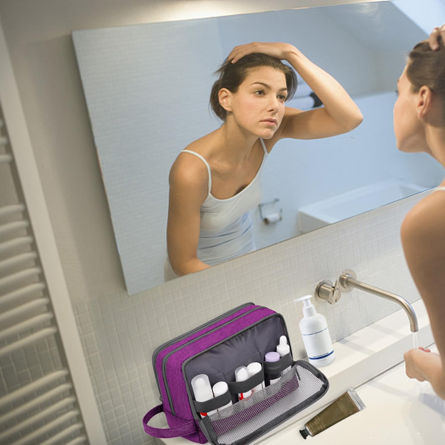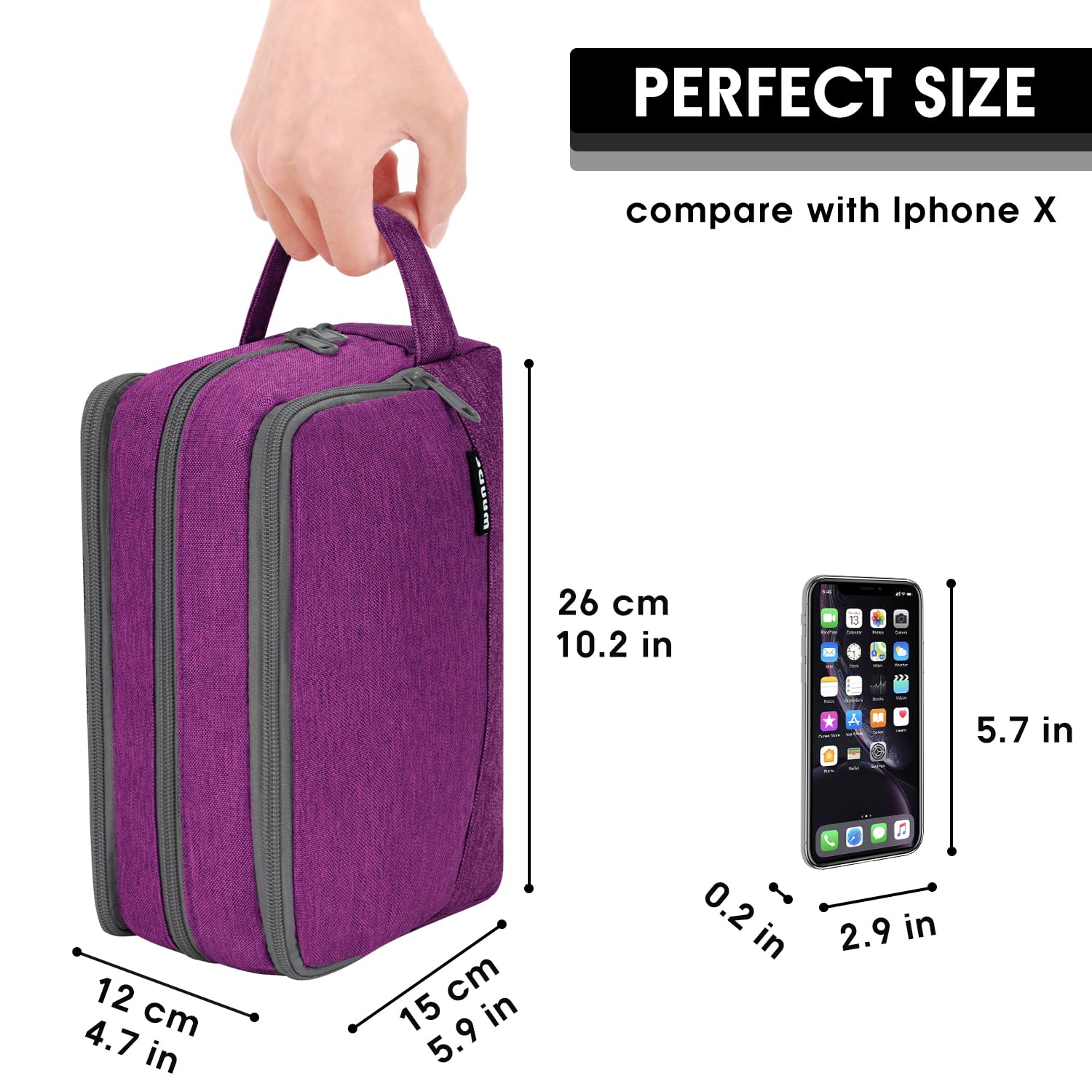 【EASY TO CARRY】 --- The side handle not only makes the travel bags for toiletries easy to carry but also can be used for hanging. Access toiletries easily and quickly!