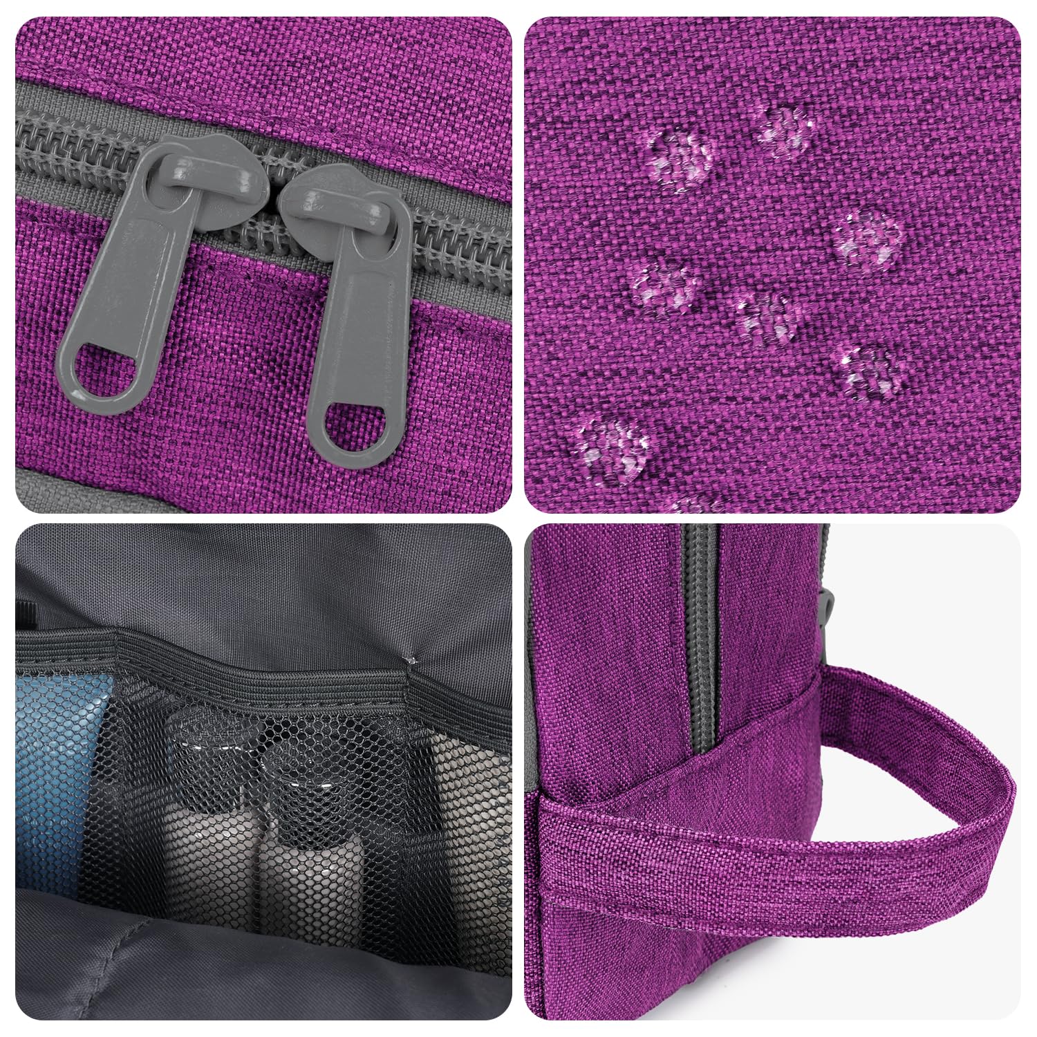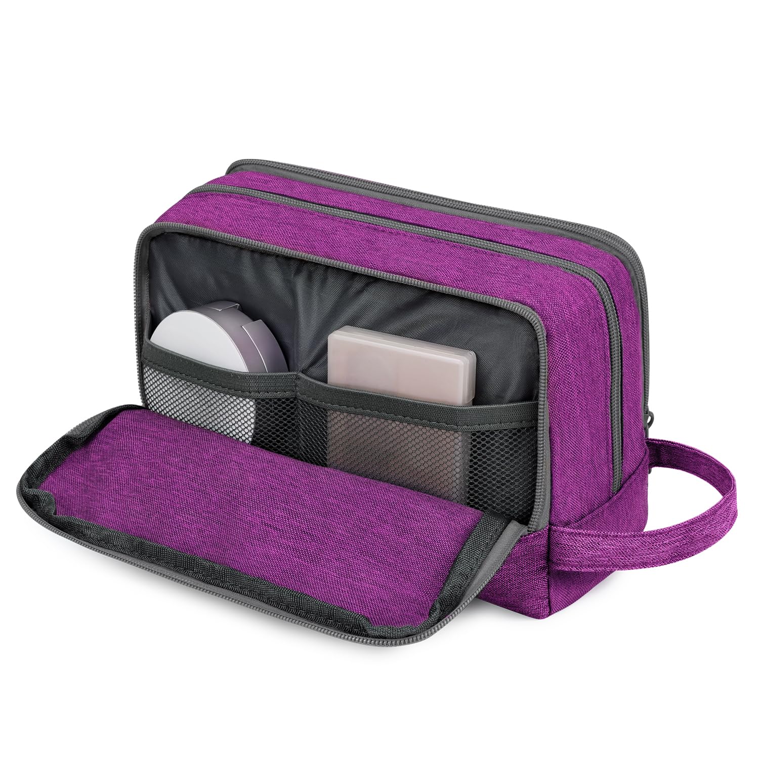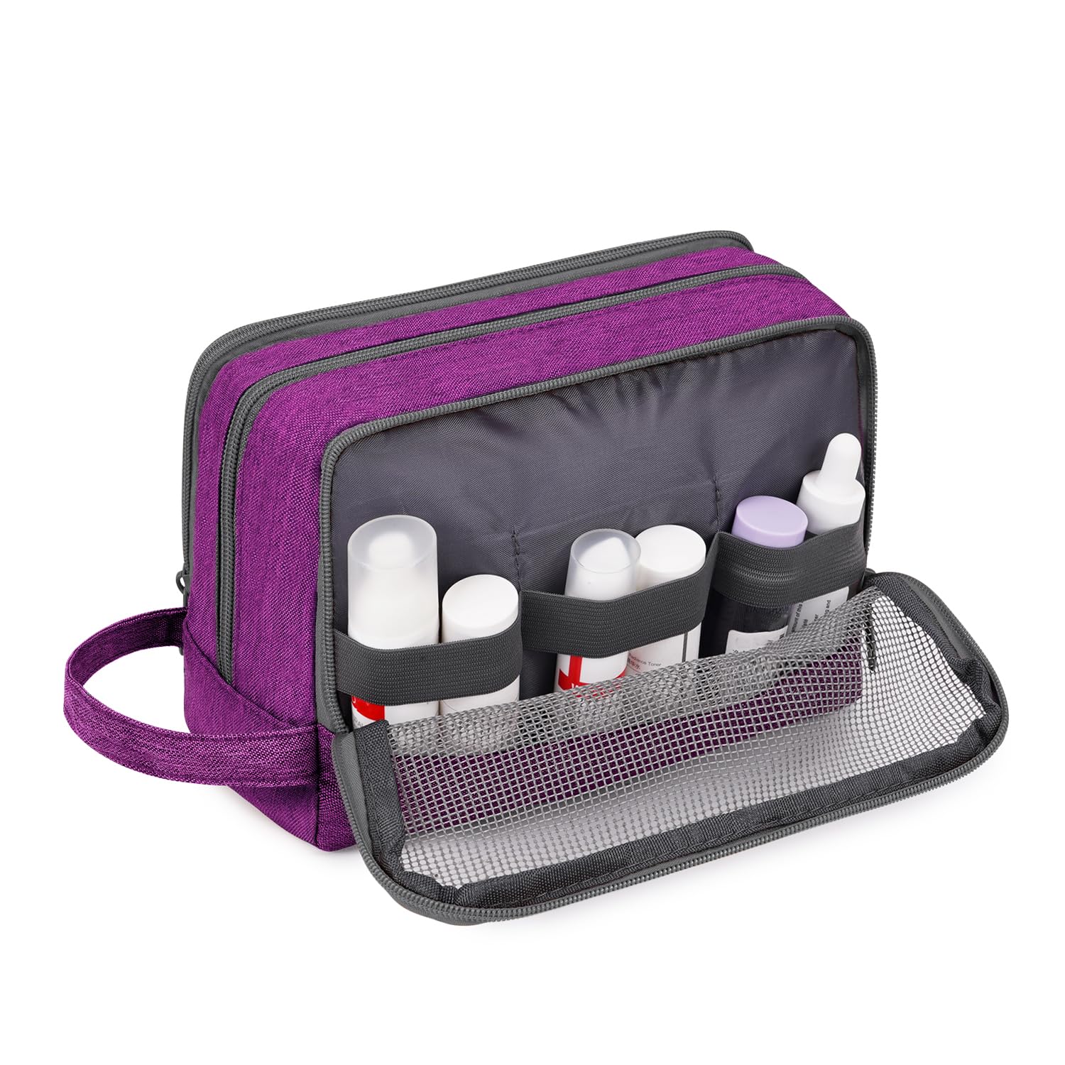 【ORGANIZED COMPARTMENTS】 --- Main compartment that holds larger items such as shampoo bottles or shaving cream. One zippered mesh pouch that keeps your smaller toiletries and cosmetics in a place visible and breathable. Other side front zipper pocket that provides extra storage with easy.