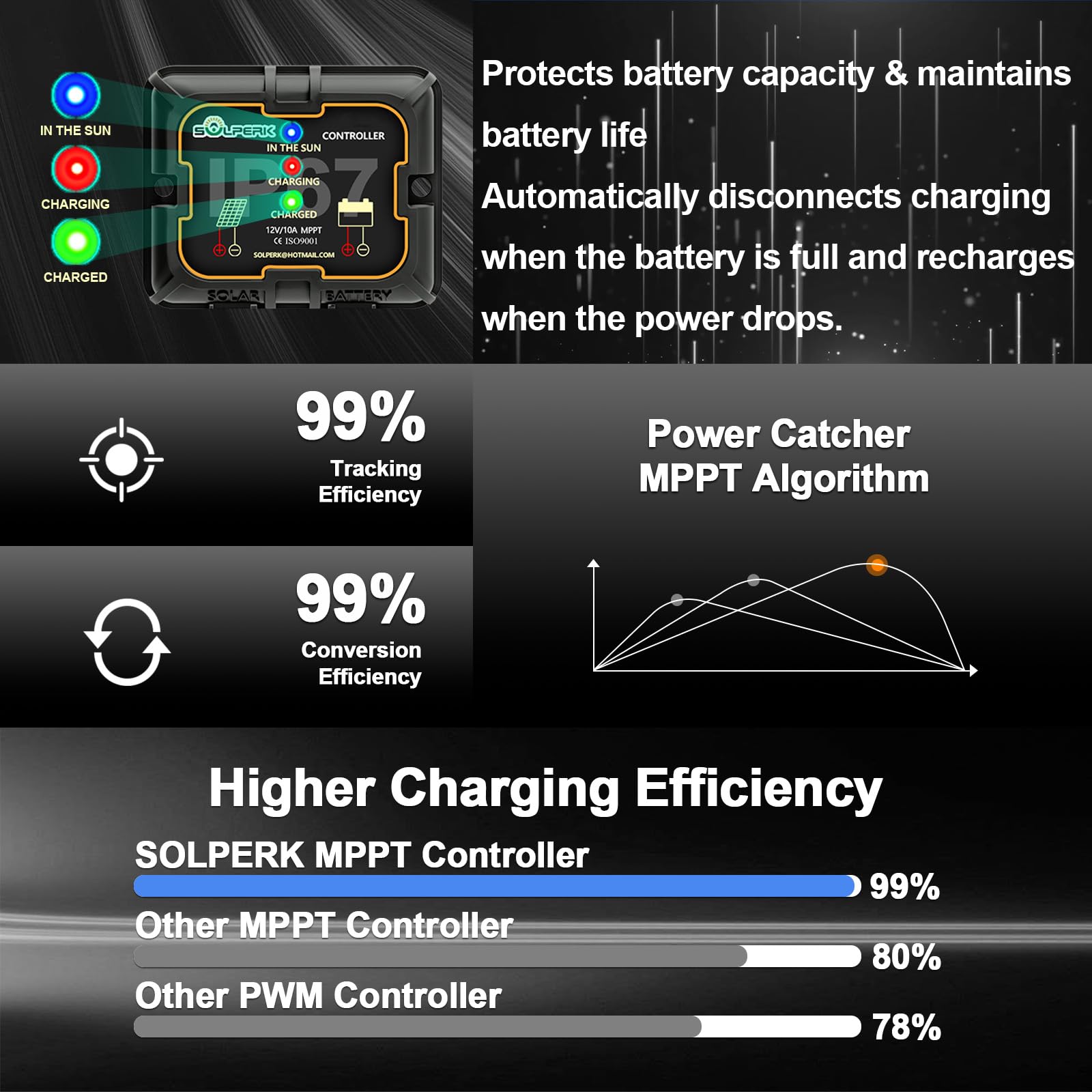 【Smart Charge Controller】The charging efficiency of this upgraded 8A controller is 20%-30% higher than other controllers on the market. Its intelligent three-stage charging design effectively prevents the battery from overcharging, over-voltage and short circuit. It takes no power from the battery. You will clearly know the charging status of the battery through the two indicator lights on the controller