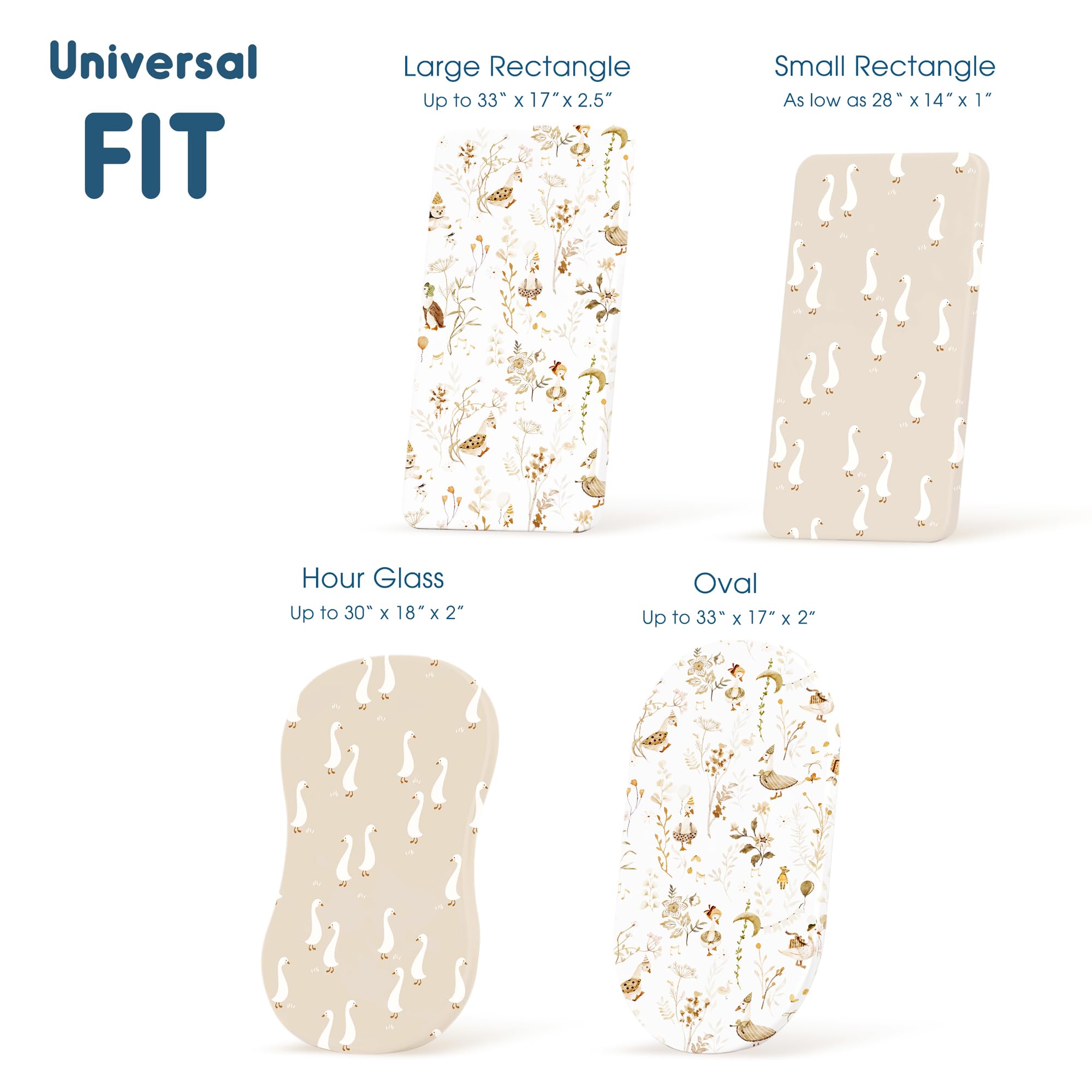Universal Fit – Measuring 32" x 16" x 5". Our bassinet sheets fit almost all standard oval, round, rectangle, hourglass shaped bassinet mattresses or changing pads. Each bassinet mattress pad cover comes with an elastic band encased at the bottom for safety.