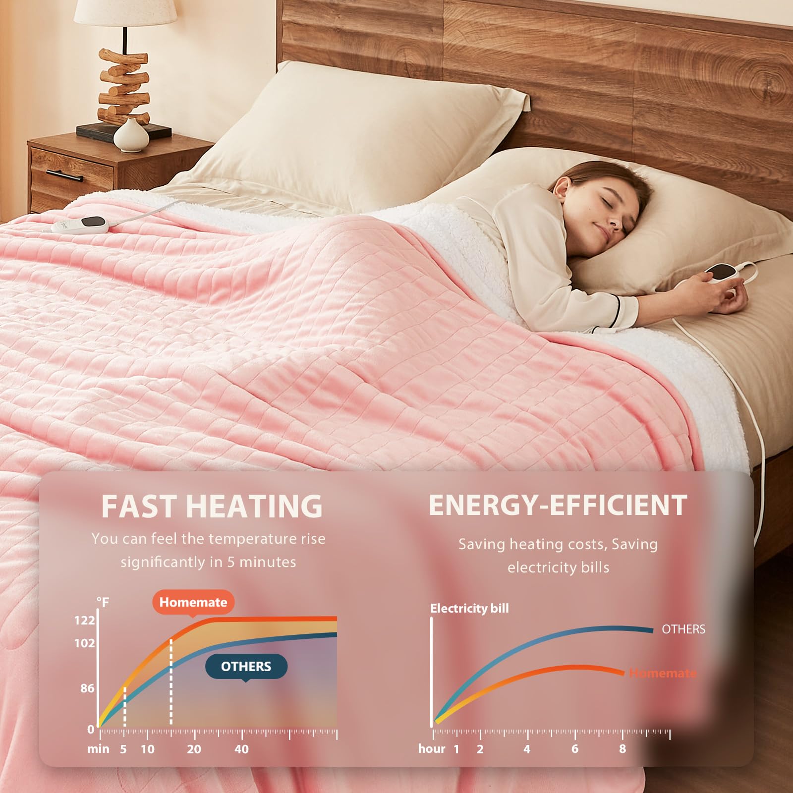 ENERGY SAVING: Homemate heated blanket use the intelligent temperature adjustment technology.When the temperature rises,the heated blanket will automatically adjust the temperature according to the surrounding environment,which can always provide users with a comfortable feeling and is conducive to energy saving.Compared with air conditioner,using Homemate heated blanket is more energy efficient,and you can save more heating costs in winter.