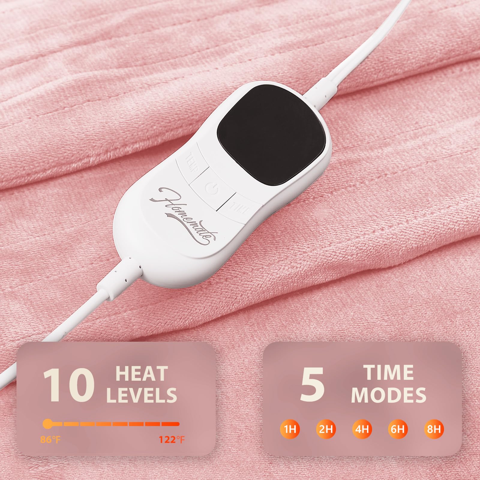EASY TO USE: Homemate heated blanket have 10 heat levels,1/2/4/6/8 hours auto shut off.Temperature range is 86-122°F.Very convenient to use,even the elderly,the sick,and the disabled can use it easily.Power Cord is 16.7 feet,this long cord makes the use of the blanket more flexible,can be used on the bed,on the sofa,can be used in the study and office,very convenient.