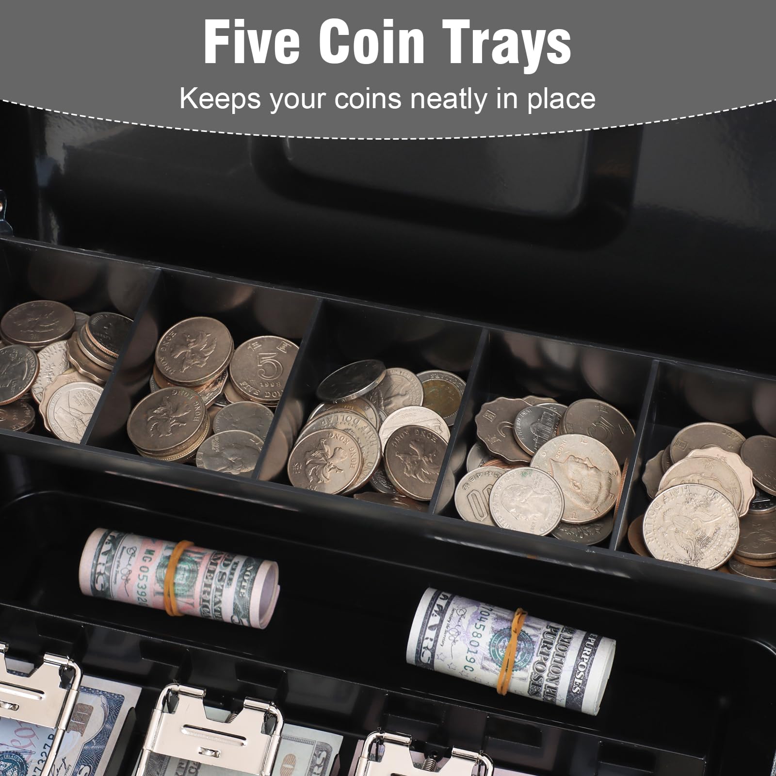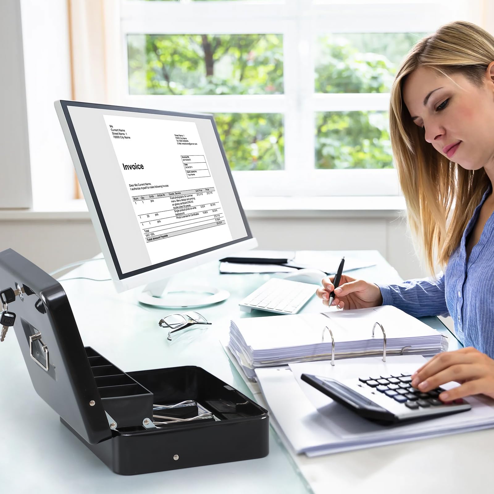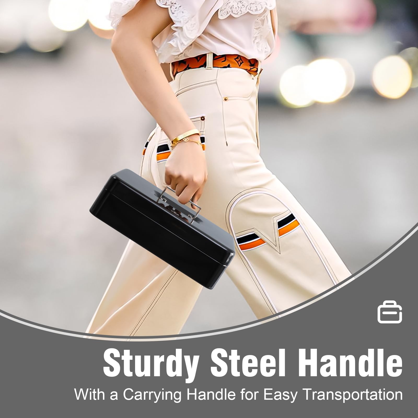 PETTY CASH BOX: This lock boxes is constructed of durable steel which is solidly built and won't simply burst open if dropped.For indoor and outdoor use. Such as School, Supermarket, Storage Lockers, Cabinets, Family, Yard Sale and so on. Suitable to store bills, coins, checks and receipts.