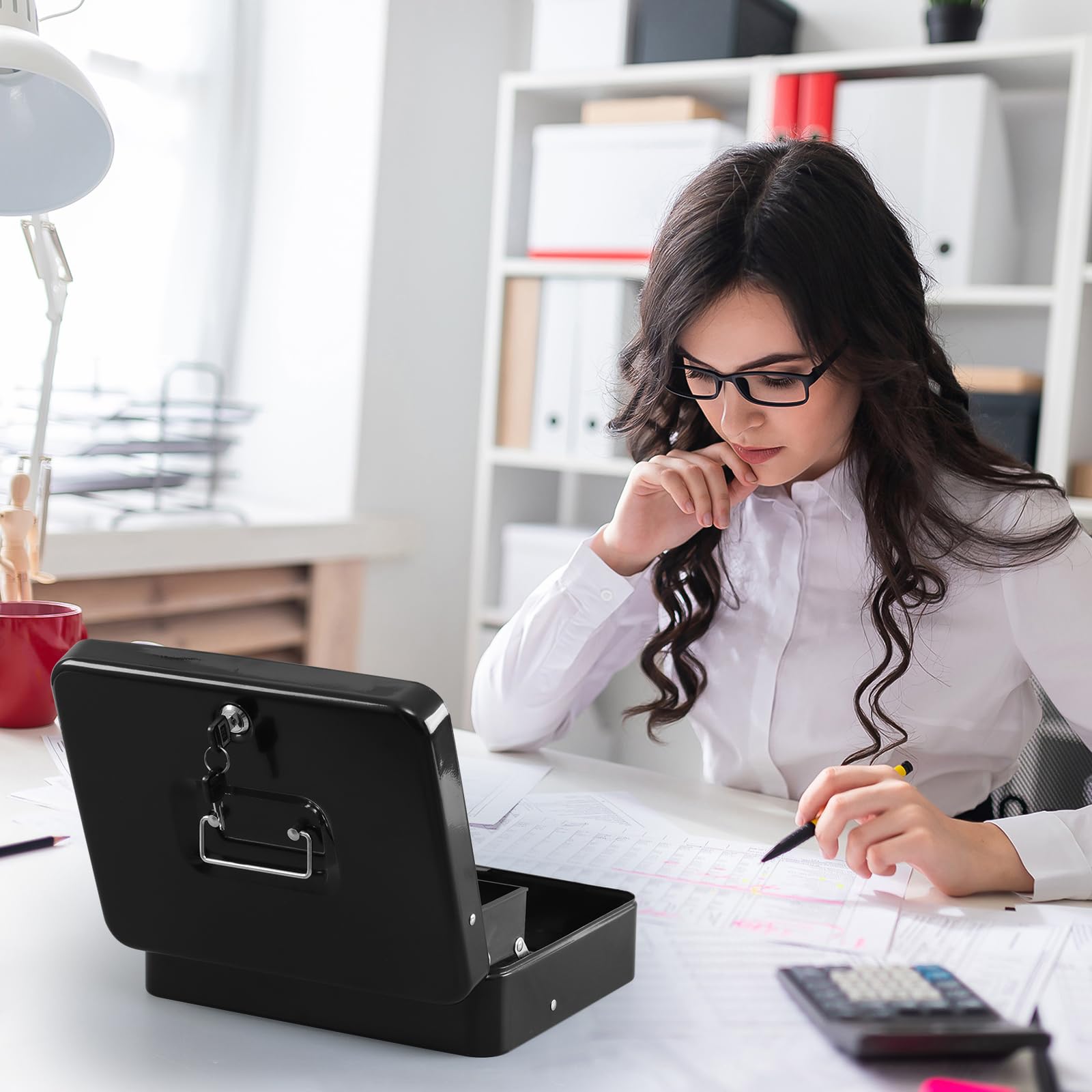 TOP KEY LOCK: Cash boxes has a privacy key lock to keep valuables safe.Top unlock for easy drawer access.Easy to use: The key is easy to operate,can open it no problem with one hand.A widened handle makes for easy storage and transport.