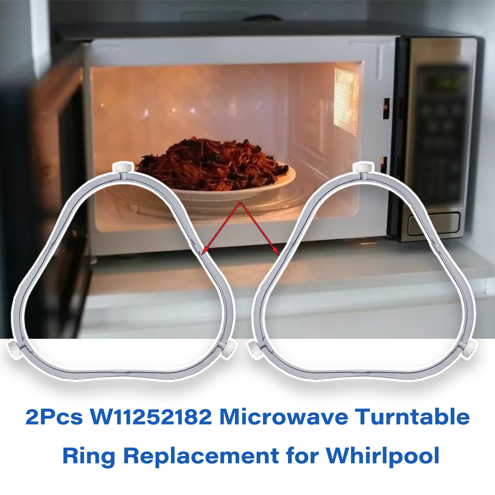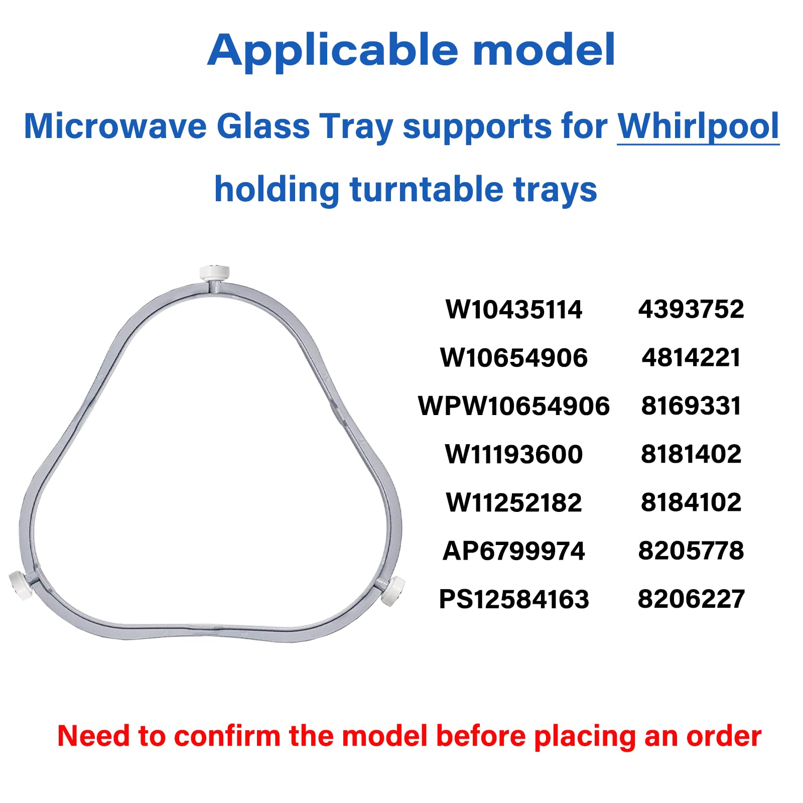 Applicable model: The W11252182 microwave glass tray supports for Whirlpool holding turntable trays, Applicable to W10435114 / W10654906 / WPW10654906 / W11193600 / W11252182/4393752/4814221/8169331/8181402/8184102 / 8205778/8206227 / AP6799974 / PS12584163. Need to confirm the model before placing an order: behind the door, front of the unit/side of the control panel/back of the unit/upper left inside.
