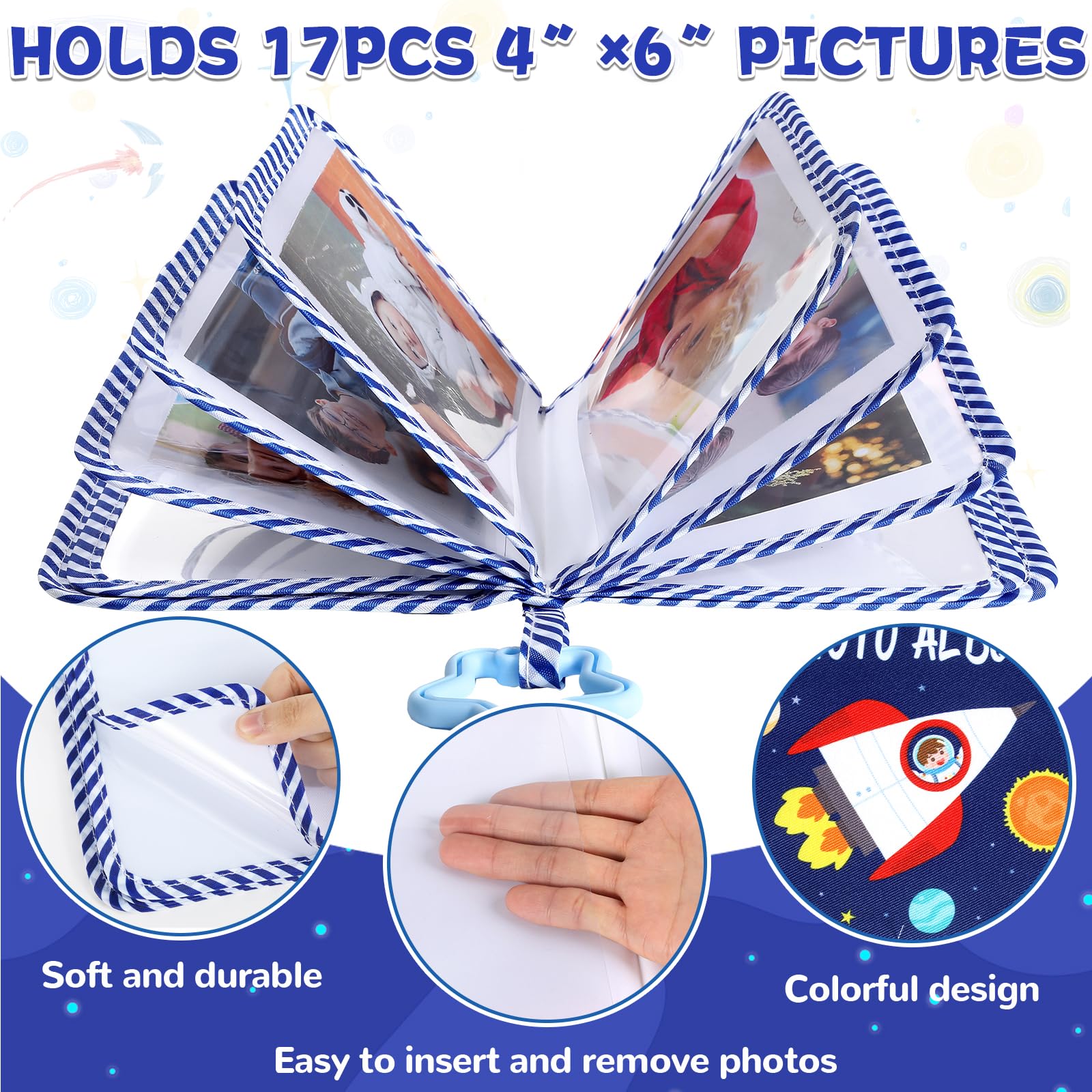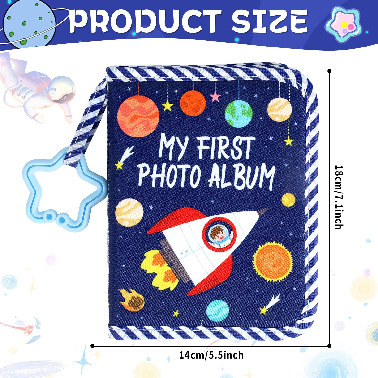 Super Value Pack: Our space first family photo album can hold up to 17 photos sized 4x6 inches, offering plenty of space to capture and cherish your baby’s milestones. A small mirror is included on the back—please remove the protective film before use. The attached star hook makes it easy to hang the solar system baby photo album anywhere you choose.