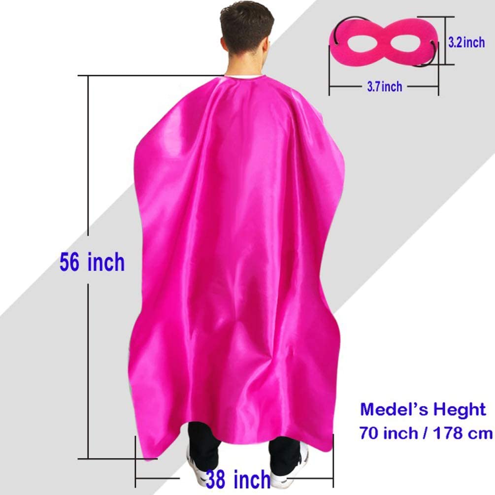 Size:Length 57 x Width 38 inch for capes. Our superhero capes and masks for adult bulk pack, are designed in perfect size after plenty of test; We have round neck hole, which fits better than simply sewed straight fabric with elastic. You can tie a bow with the cord to fit the neck. The masks ensure a snug with elastic but not too tight fit.
