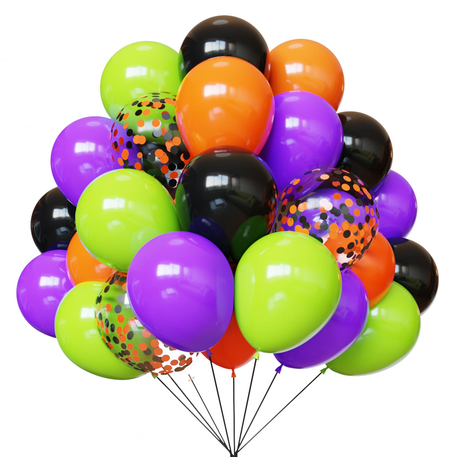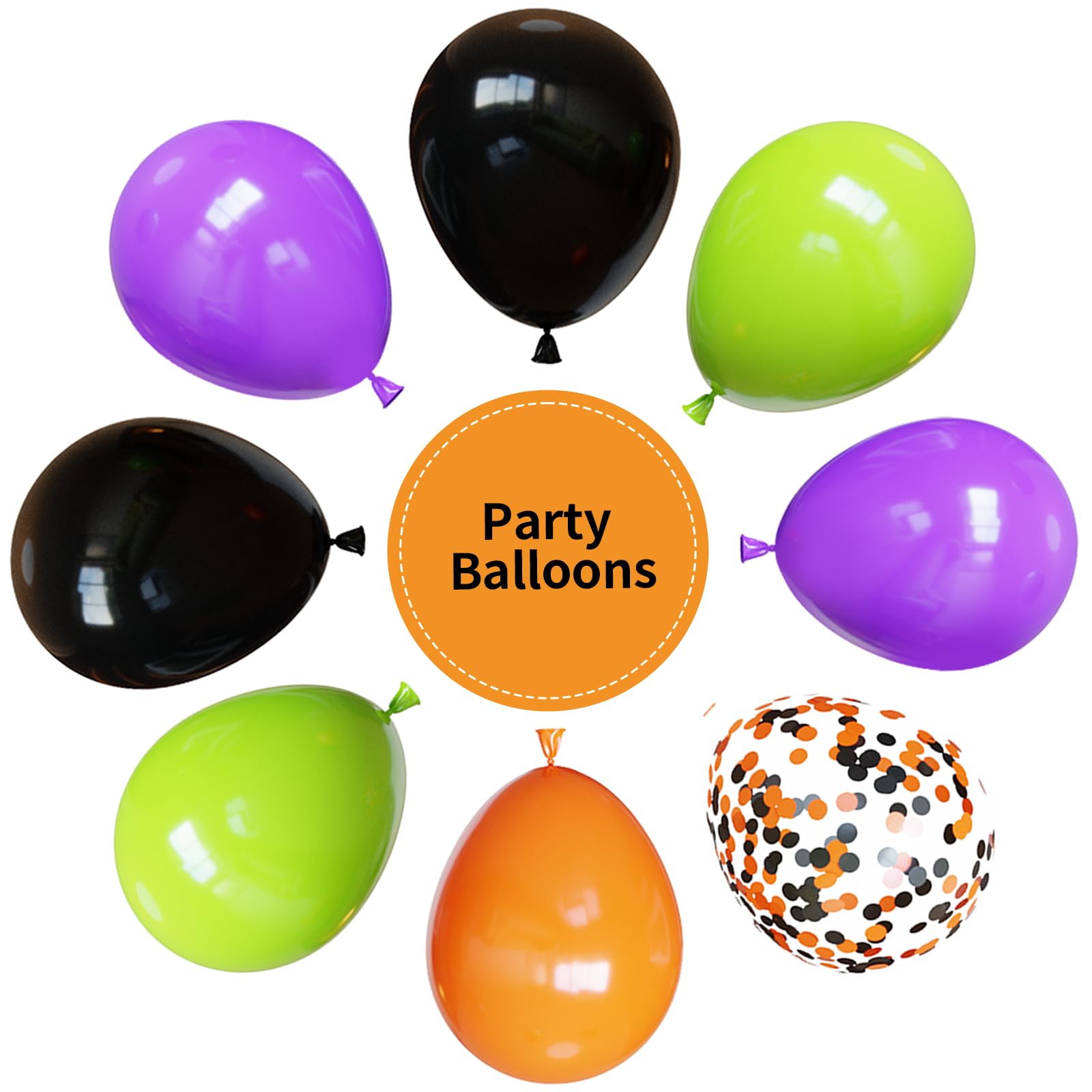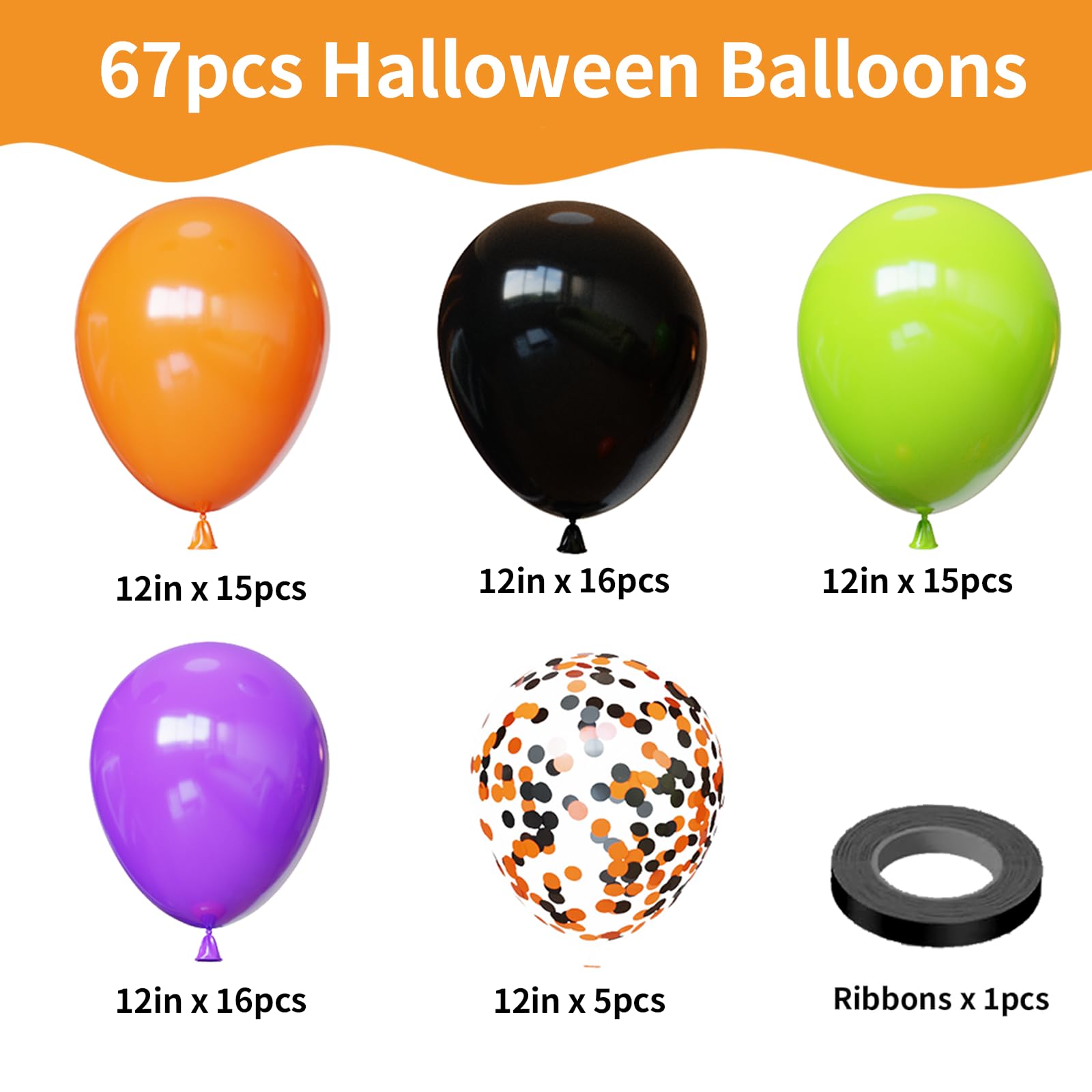 {All-in-One Kit} This Halloween balloons kit includes everything you need to create a stunning decoration, 16pcs black balloons, 16pcs purple balloons, 15pcs orange balloons, 15pcs lime green balloons, 5pcs black orange confetti balloons and 1 roll of black ribbons. The size of the balloon is about 12 inches after inflation. The combination of black and orange adds a touch of glamour to any party.