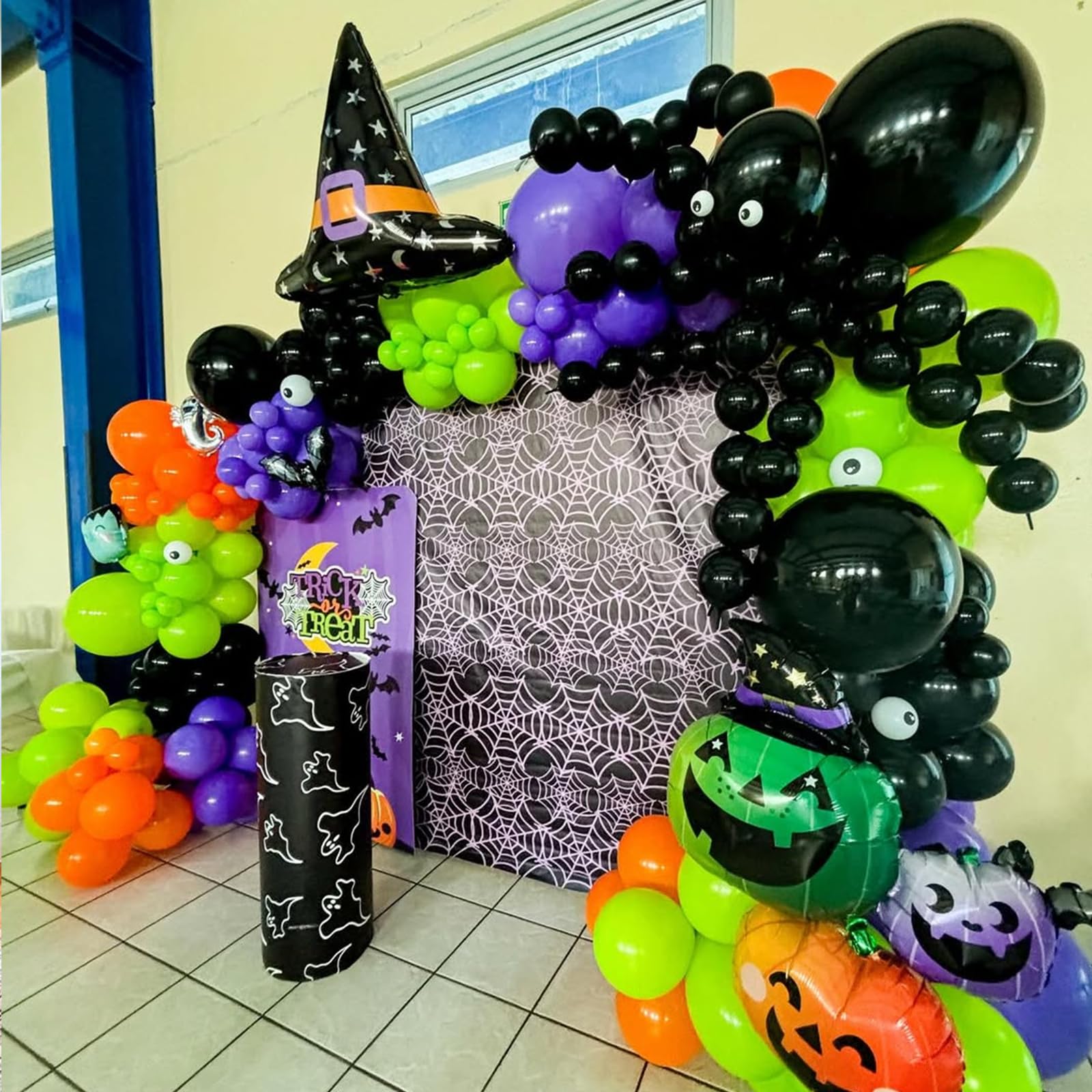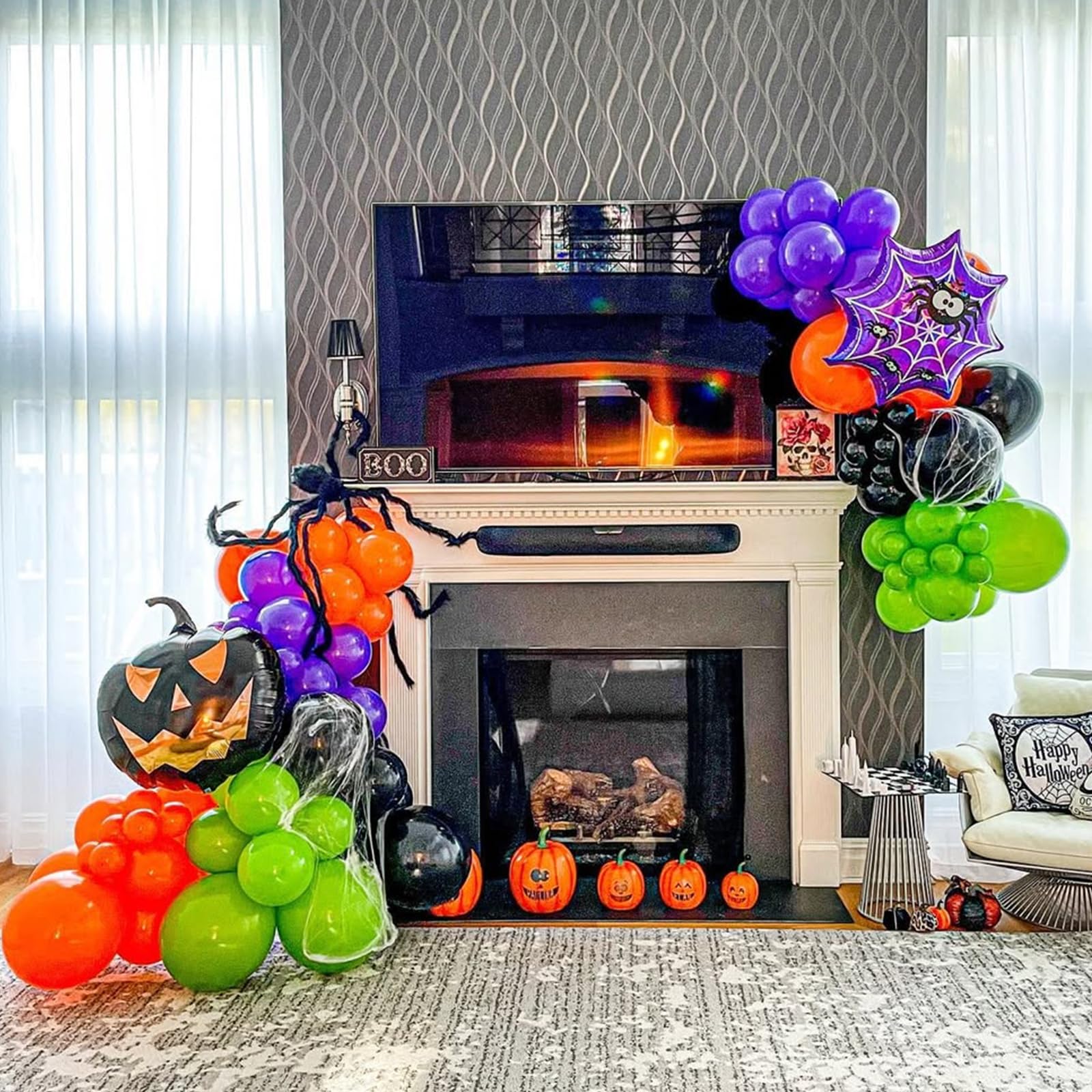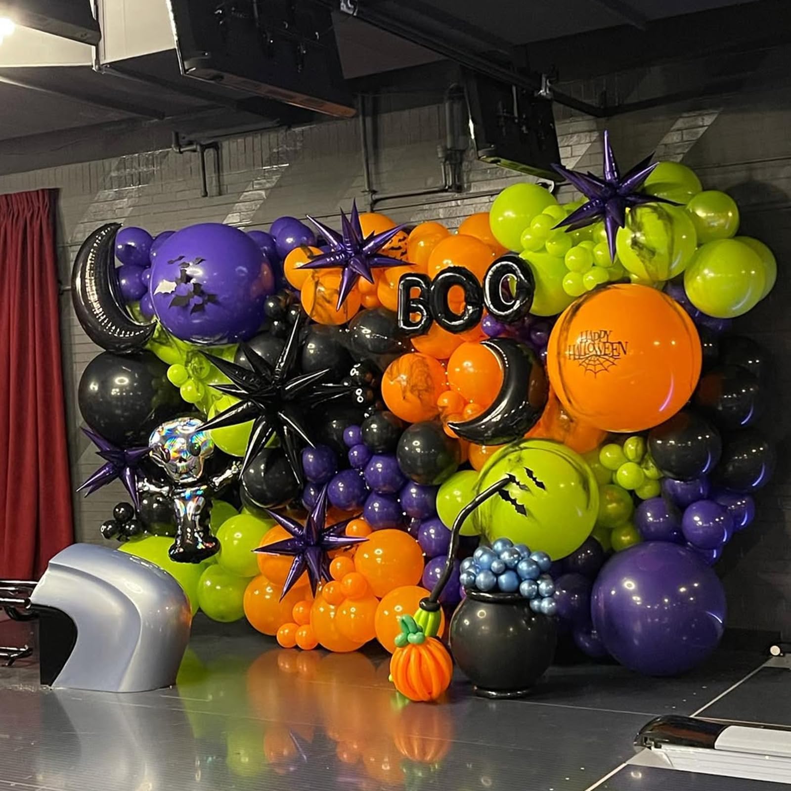 {All-in-One Kit} This Halloween balloons kit includes everything you need to create a stunning decoration, 16pcs black balloons, 16pcs purple balloons, 15pcs orange balloons, 15pcs lime green balloons, 5pcs black orange confetti balloons and 1 roll of black ribbons. The size of the balloon is about 12 inches after inflation. The combination of black and orange adds a touch of glamour to any party.