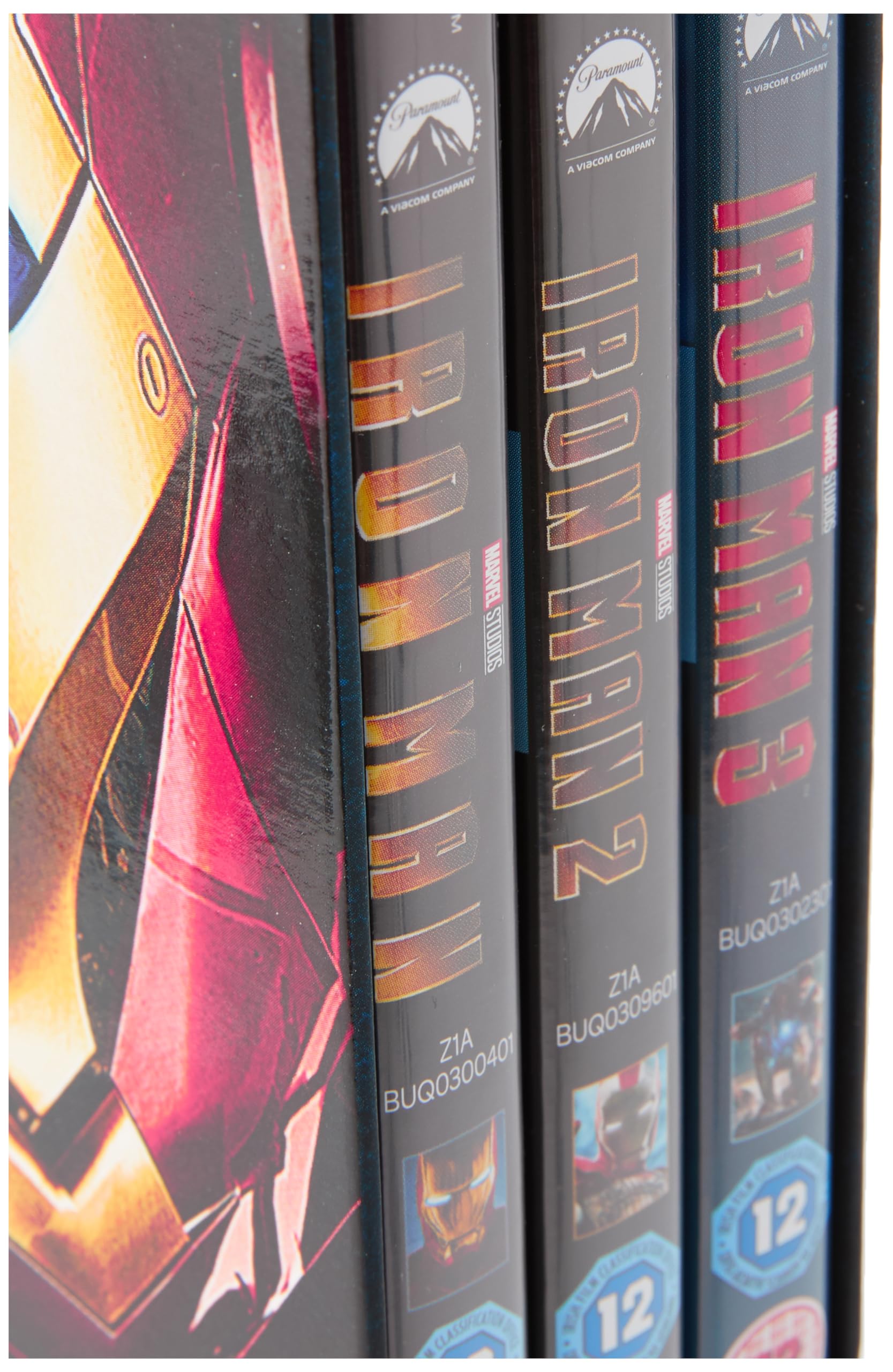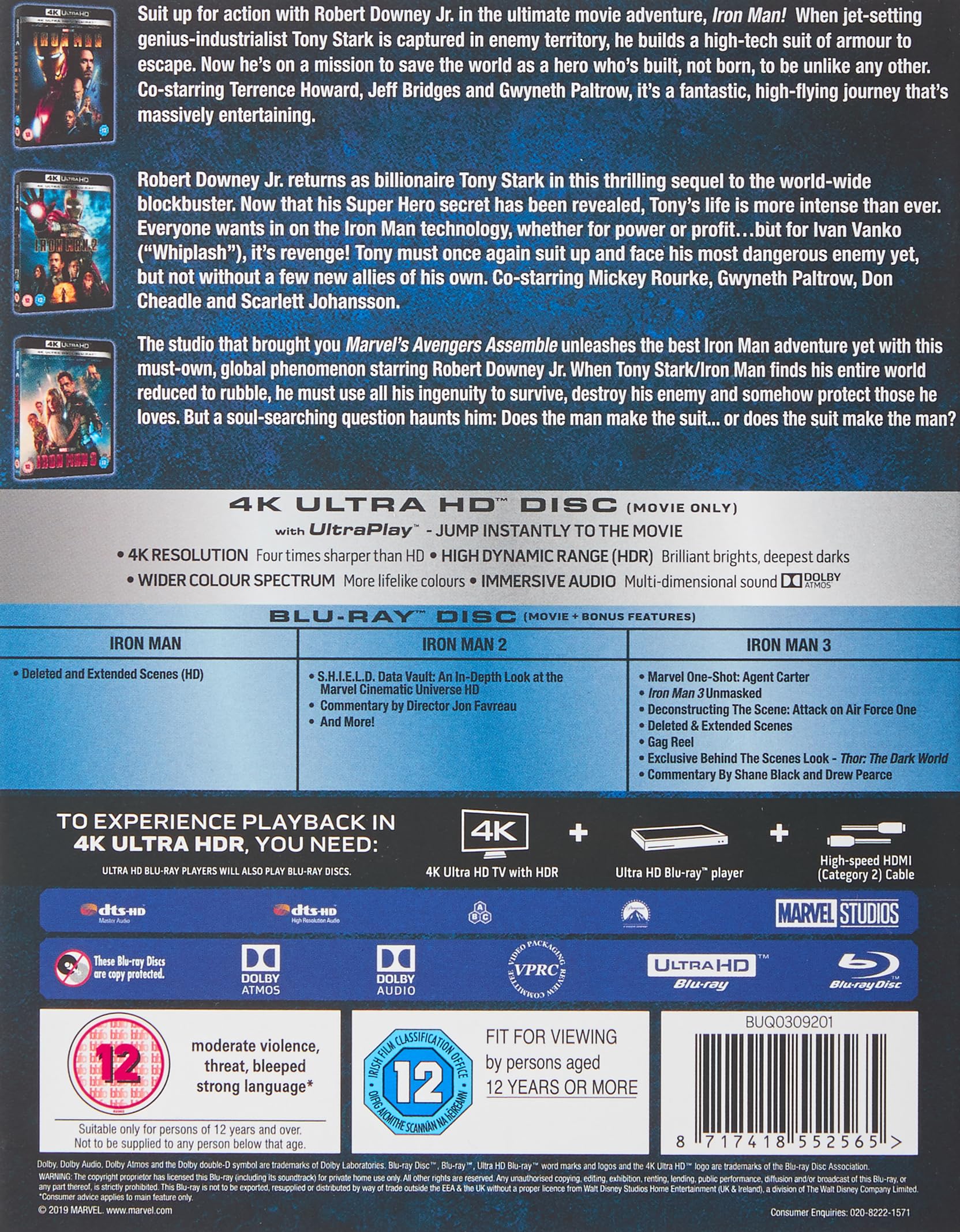 Iron Man (2008) SYNOPSIS Lift off with high-speed, high flying action that takes you inside the suit of Marvel's invincible Super Hero for the ultimate Iron Man experience! After surviving an unexpected attack in enemy territory, jet-setting industrialist Tony Stark builds a high-tech suit of armour and vows to protect the world as Iron Man. Straight for the pages of the legendary comic book, Iron Man is a hero who is built - not born- to be unlike any other! BONUS DELETED AND EXTENDED SCENES Iron Man 2 (2010) SYNOPSIS Robert Downey Jr. returns as billionaire Tony Stark in this thrilling sequel to the worldwide blockbuster. Now that his Super Hero secret has been revealed, Tony's life is more intense than ever. Everyone wants in on the Iron Man technology, whether for power or profit...but for Ivan Vanko ("Whiplash"), it's revenge! Tony must once again suit up and face his most dangerous enemy yet, but not without a few new allies of his own. Co-starring Mickey Rourke, Gwyneth Paltrow, Don Cheadle and Scarlett Johansson, Iron Man 2 is "Even better than the first...it's a complete blast!" BONUS S.H.I.E.L.D. Data Vault: An In-Depth look at the Marvel Cinematic Universe HD Commentary by Director Jon Favreau and more… Iron Man 3 (2013) SYNOPSIS Marvel Studios (Marvel's Avengers Assemble) unleashes the best Iron Man adventure yet with this must own, unprecedented global phenomenon starring Robert Downey Jr. When Tony Stark/Iron Man finds his entire world reduced to rubble, he must use all his ingenuity to survive, destroy his enemy and somehow protect those he loves. But a soul-searching question haunts him: Does the man make the suit...or does the suit make the man? Featuring spectacular special effects, Marvel's Iron Man 3 is a wildly entertaining movie you'll watch again and again. BONUS Marvel One-Shot: Agent Carter Iron Man 3 Unmasked Deconstructing The Scene: Attack on Air Force One Deleted and Extended Scenes Gag Reel Exclusive Behind The Scenes Look - Marvel's Thor: The Dark World Commentary by Shane Black and Drew Pearce