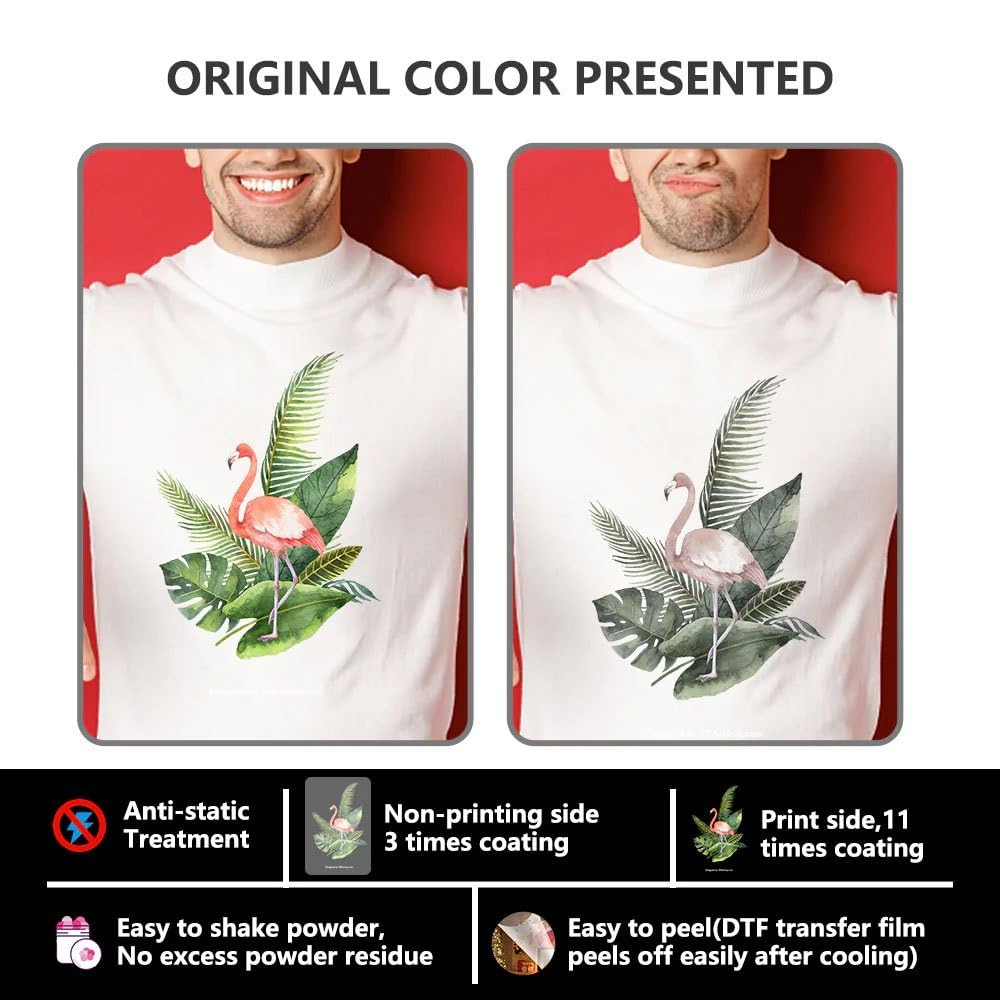 [100% effect] DTF transfer film high transmission rate, obvious printing effect, waterproof printing surface, bright color, clear pattern, washable, no cracking, no fading, soft touch, durable printing pattern.