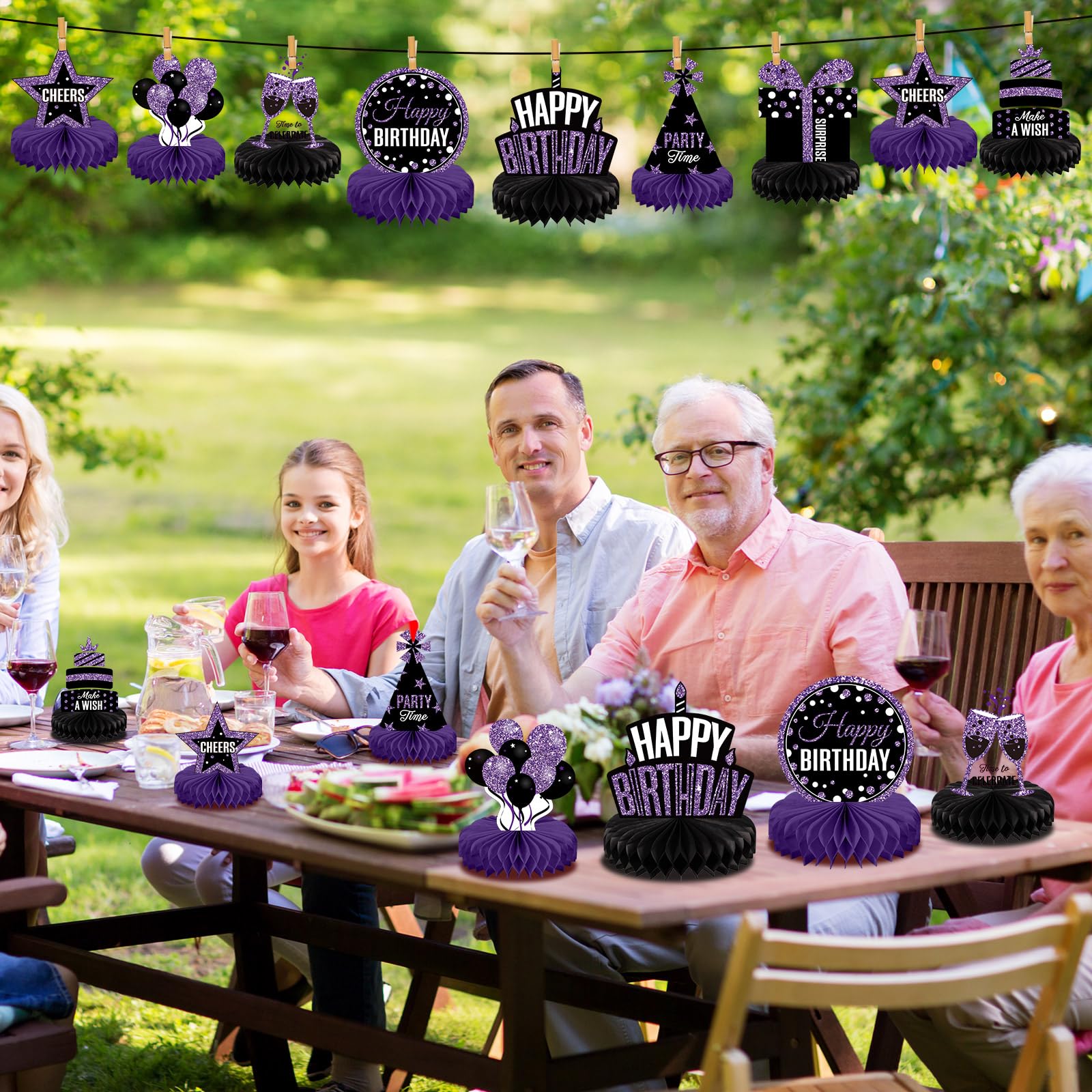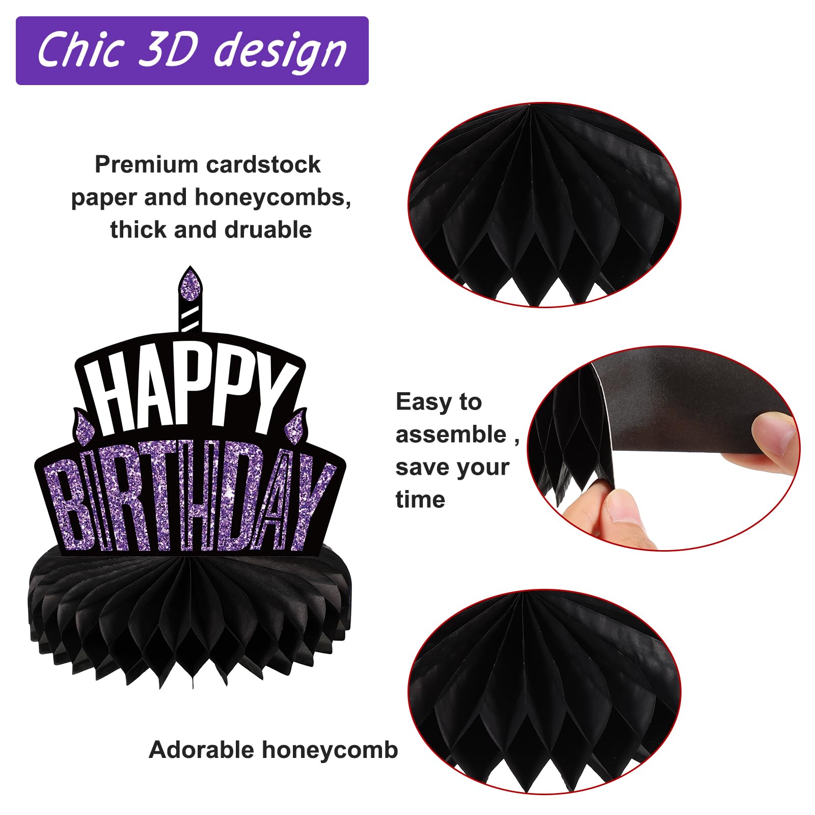 Exquisite Design: distinctive purple and black birthday honeycomb table decorations feature delicate and diverse pattern designs, including cakes, balloons, stars, gift boxes, etc., will make your birthday party more different