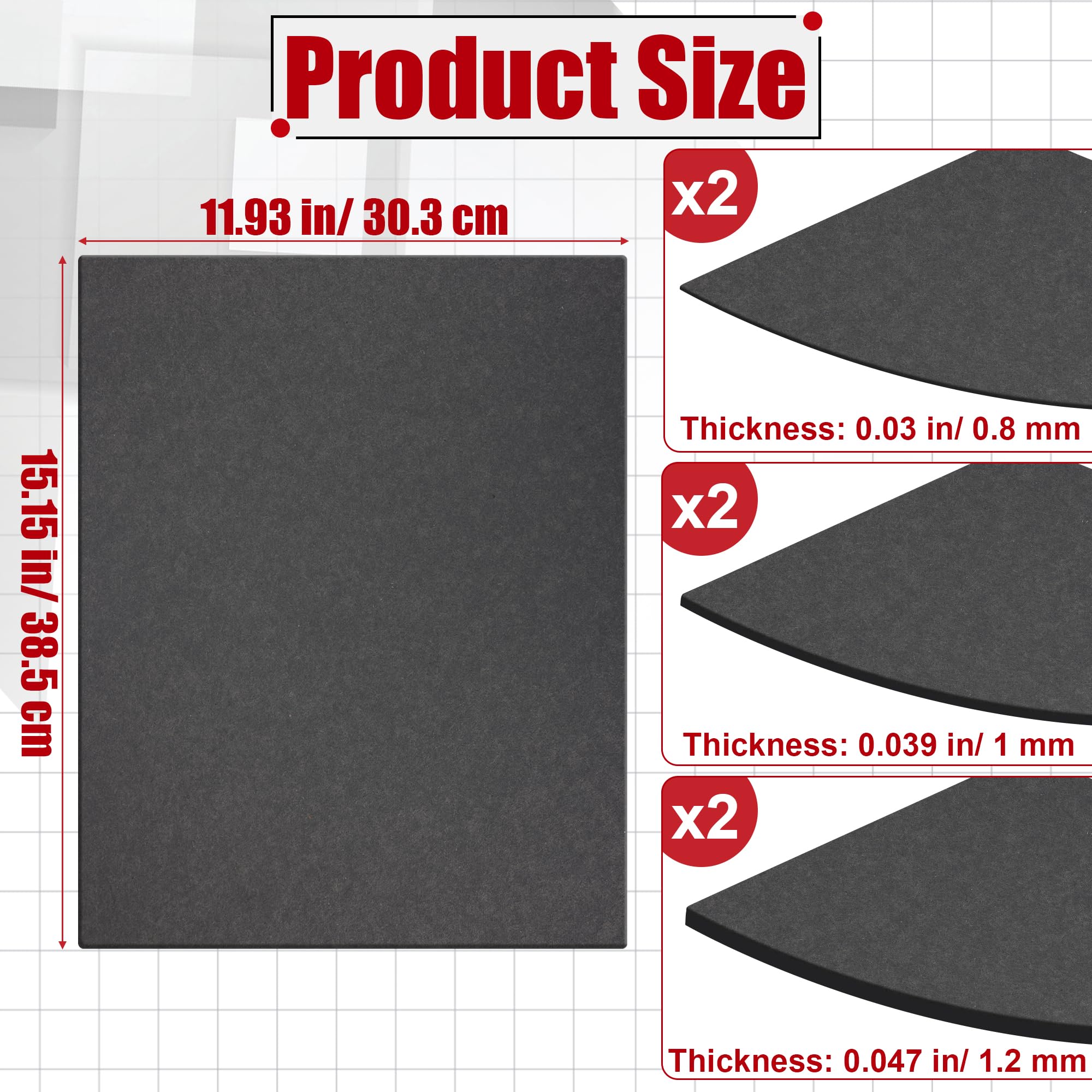 【6PCS in 3 Thickness】: The package includes 6 pieces of gasket material sheet, with a size of 15.15 x 12 inches/ 38.5 x 30.4 cm (L*W), and 3 thicknesses of 0.031 in/ 0.039 in/ 0.047 in (0.8 mm/ 1 mm/ 1.2 mm), 2 pieces of each thickness