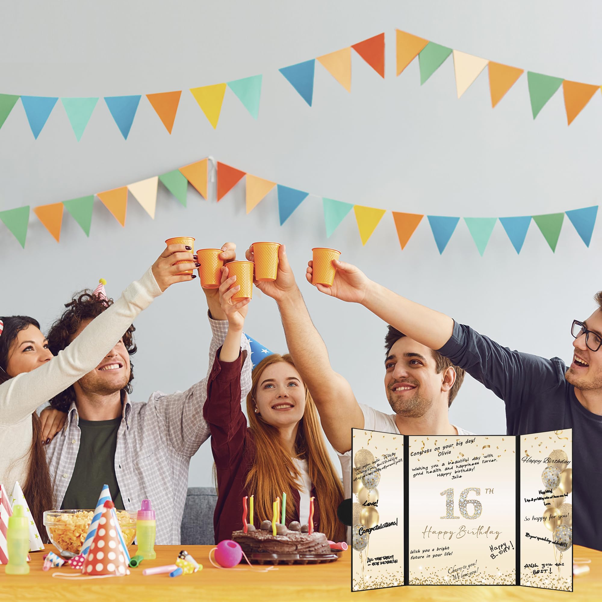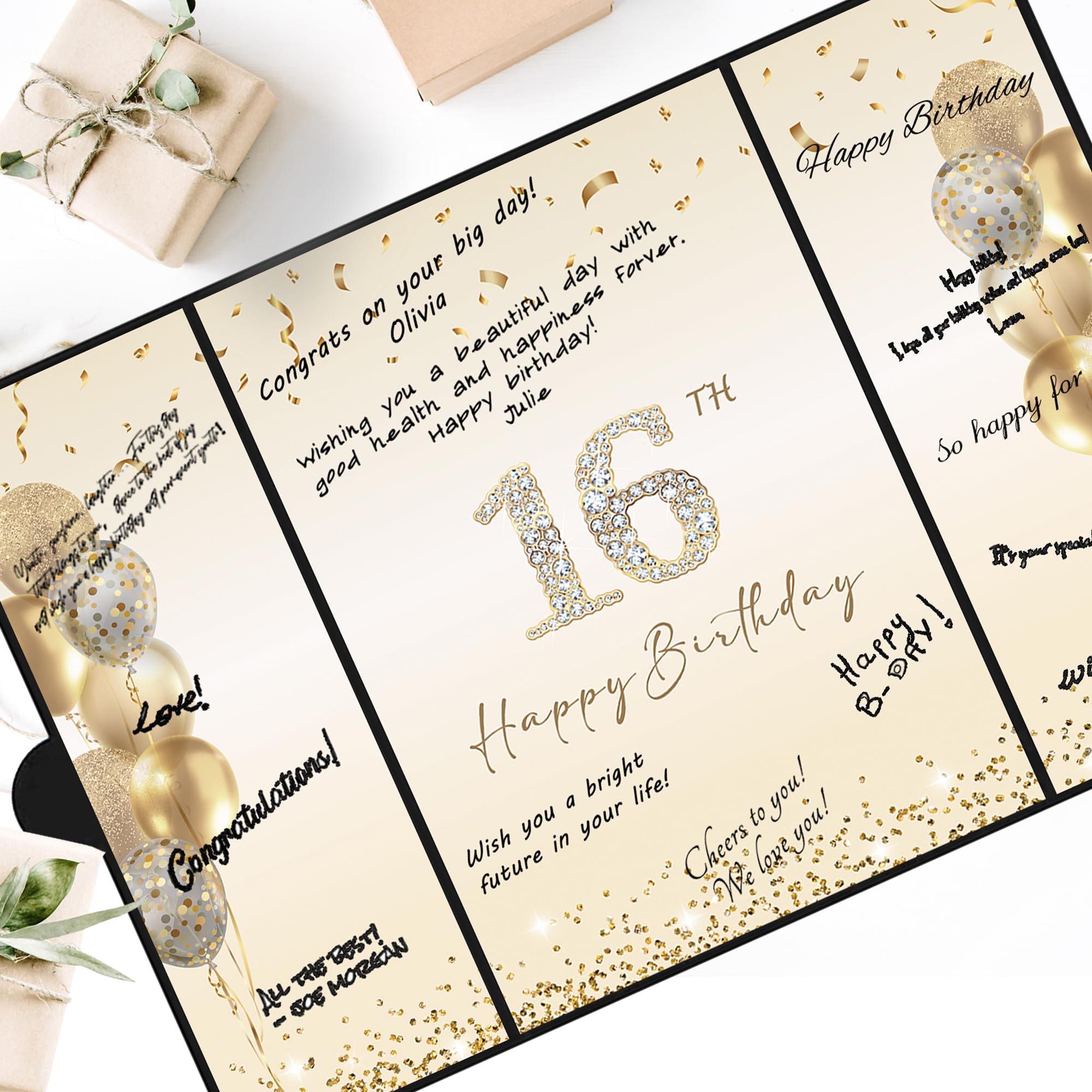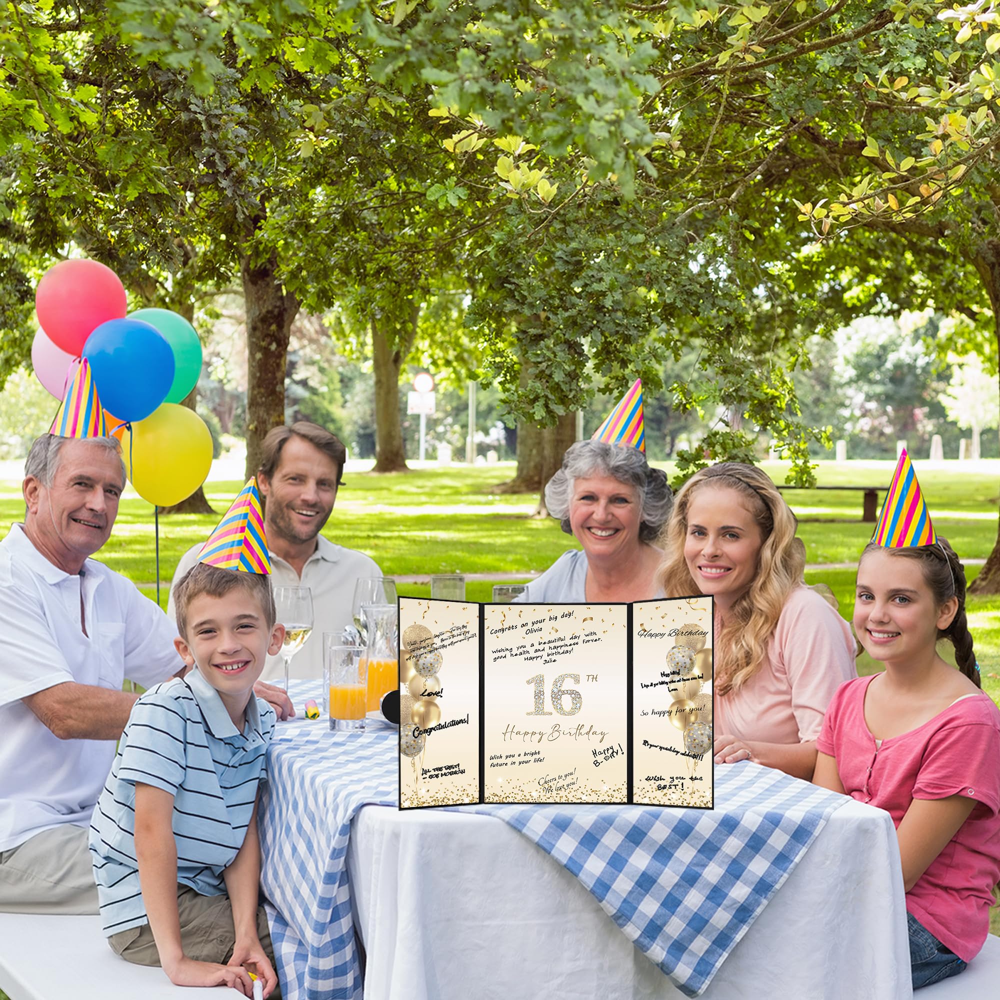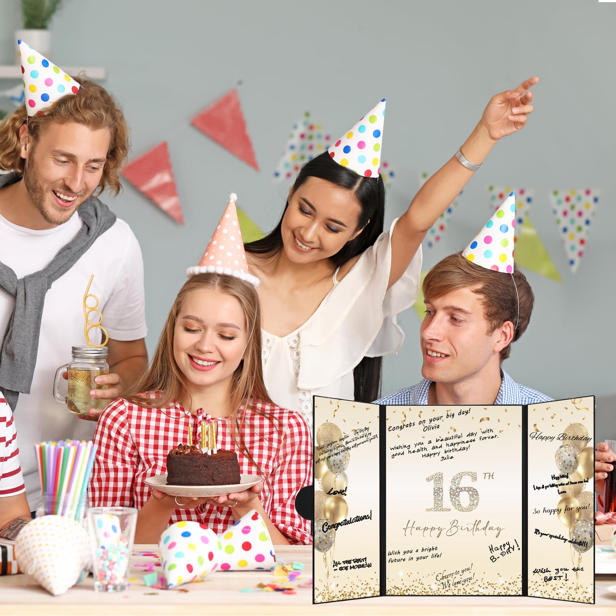 【Perfect Size】 - The cover of Happy 16th Birthday signature sign is approx. 45.6 x 30.6 cm/ 18 x 12inches; the left and right inner page is approx. 10.5 x 30cm/ 4.1 x 11.8inches; the middle inner page: approx. 21.5 x 30 cm/ 8.5 x 11.8inches. It is a fun party decoration idea for the 16th Birthday. You can make your keepsake unique and keep them endlessly.