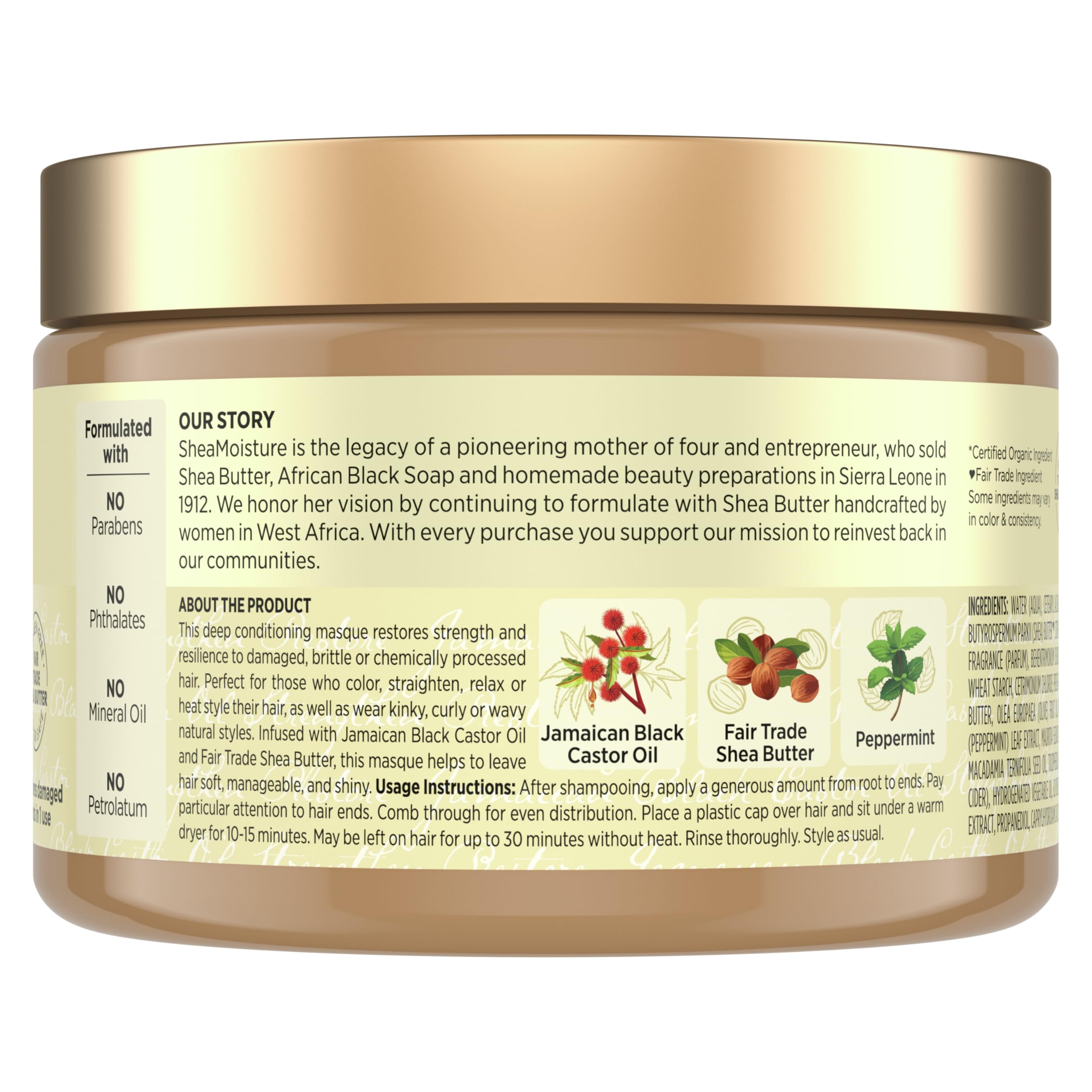 SheaMoisture Jamaican Black Castor Oil Strengthen and Restore Masque is a deep conditioning and hydrating hair mask that helps to strengthen and restore damaged or chemically processed hair. This hair mask and deep conditioner replenishes moisture and softens hair by supporting elasticity, reducing the appearance of breakage and shedding; it's our best hair mask for curls. Our deep conditioning hair mask is perfect for those who regularly color, straighten, perm or heat style their natural hair. Formulated with Jamaican Black Castor Oil and Shea Butter, this deep conditioner hair masque strengthens damaged hair and chemically processed hair. All SheaMoisture hair products are sustainably produced and cruelty-free. This SheaMoisture hair mask is formulated with no silicones, no sulfates, no parabens, no phthalates, or petrolatum. These hair products, including this hair masque by SheaMoisture, have been tested on family and friends for generations and never on animals. Our Story: SheaMoisture is the legacy of Sofi Tucker, a pioneering mother of four and entrepreneur who sold Shea Butter, African Black Soap and homemade beauty preparations in Sierra Leone in 1912. We honor her vision by continuing to formulate with Raw Shea Butter handcrafted by women in Africa. With every purchase you show support of our mission to reinvest back in our communities.