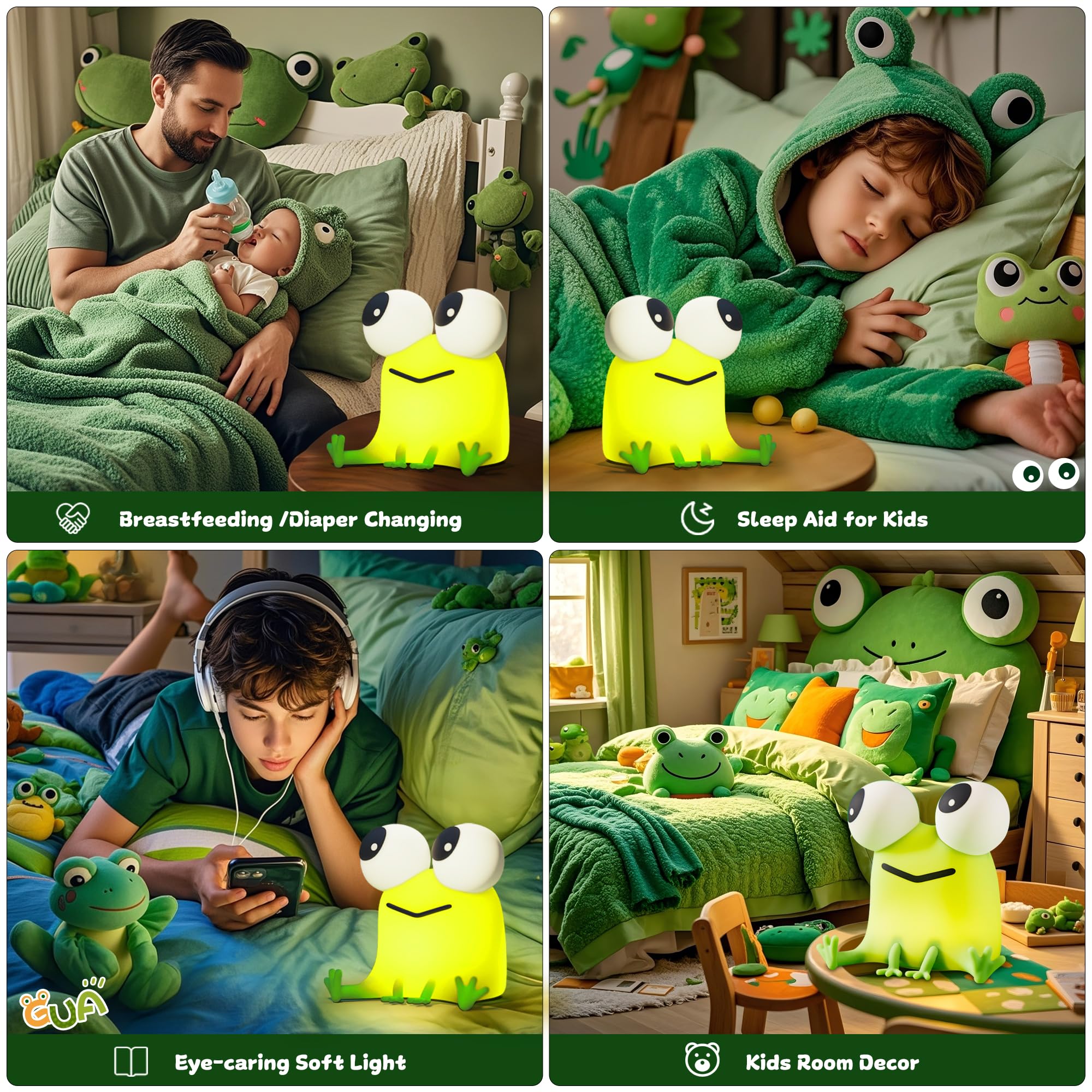 3-Level Brightness Adjustment : The frog nursery night light offers 3 levels of brightness (low, medium, high) to meet different needs. this baby lamp comforts kids at bedtime, easing fear of the dark while serving as a playful companion. Nursing moms use it for midnight feedings or diaper changes. adults enjoy its calming ambiance for remote work. Elderly users loves its portable feature, ensuring safe nighttime navigation to prevent falls. A versatile, heartwarming light for all ages.