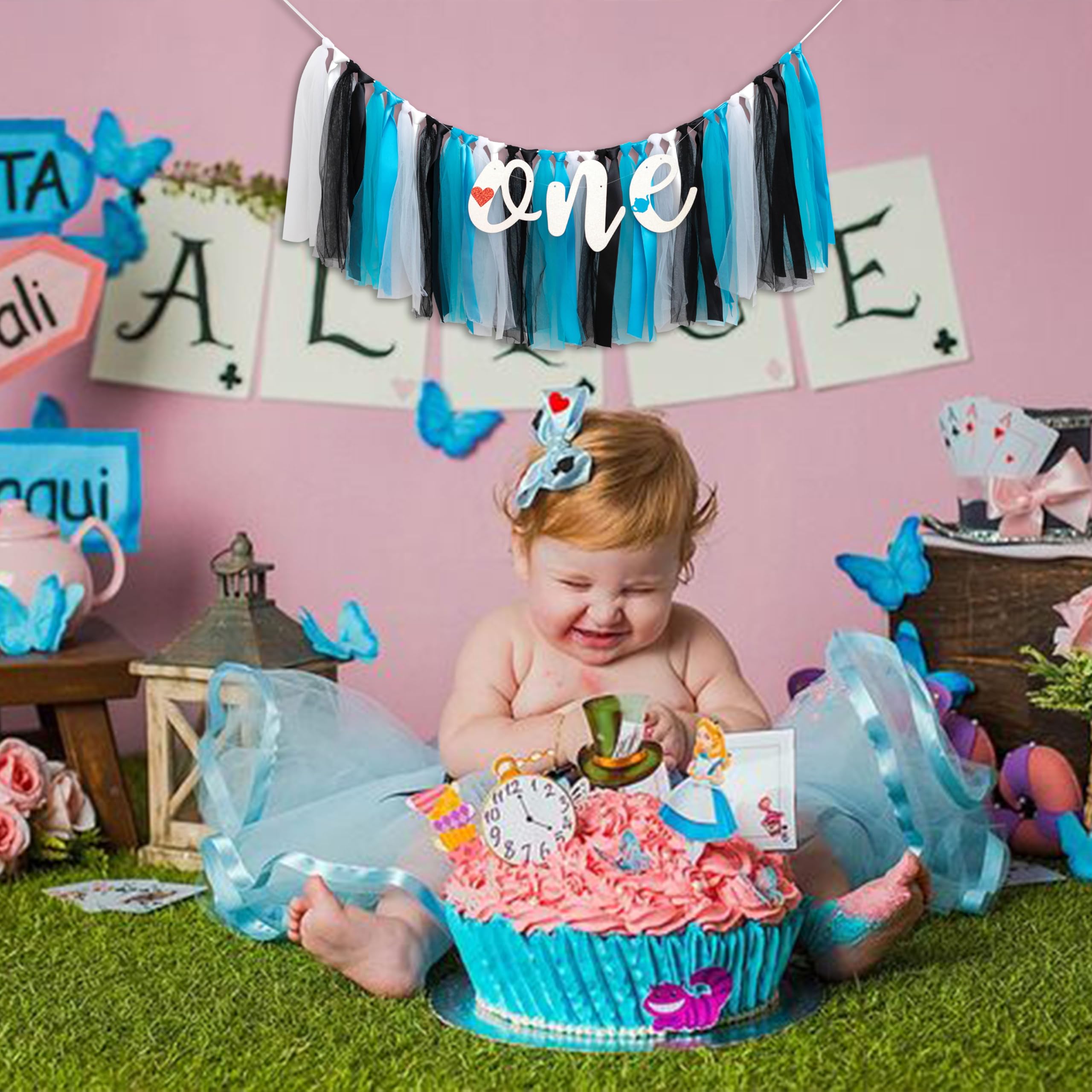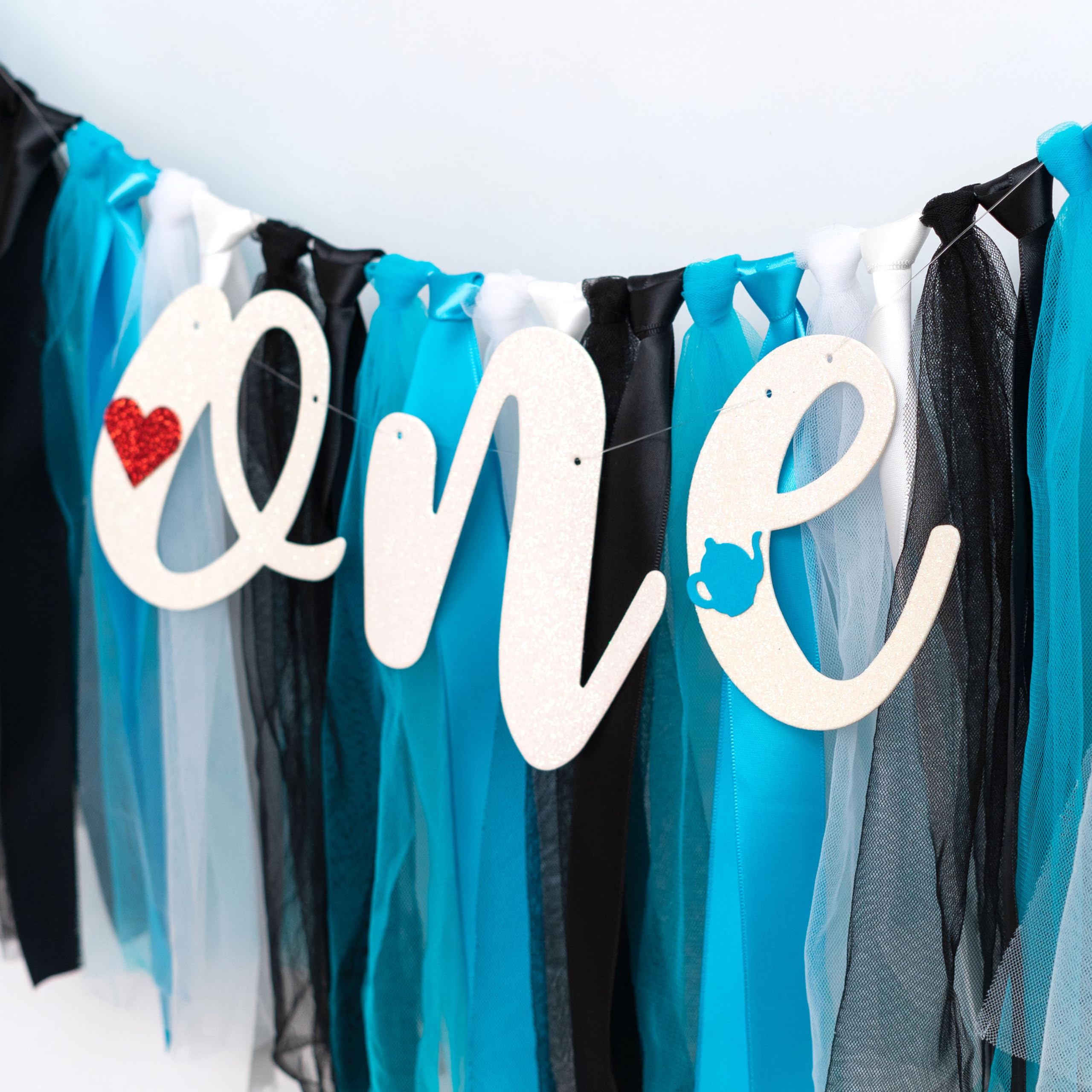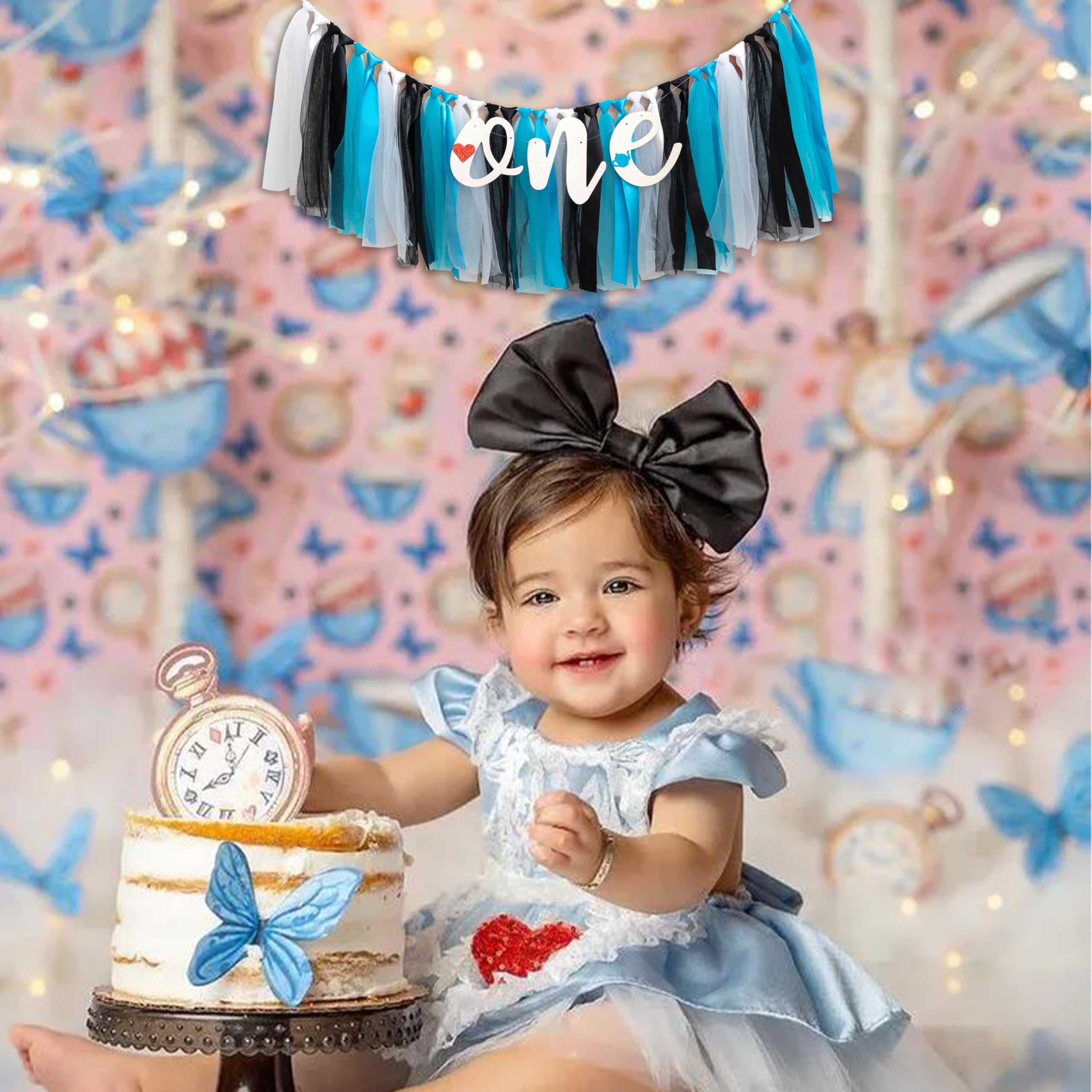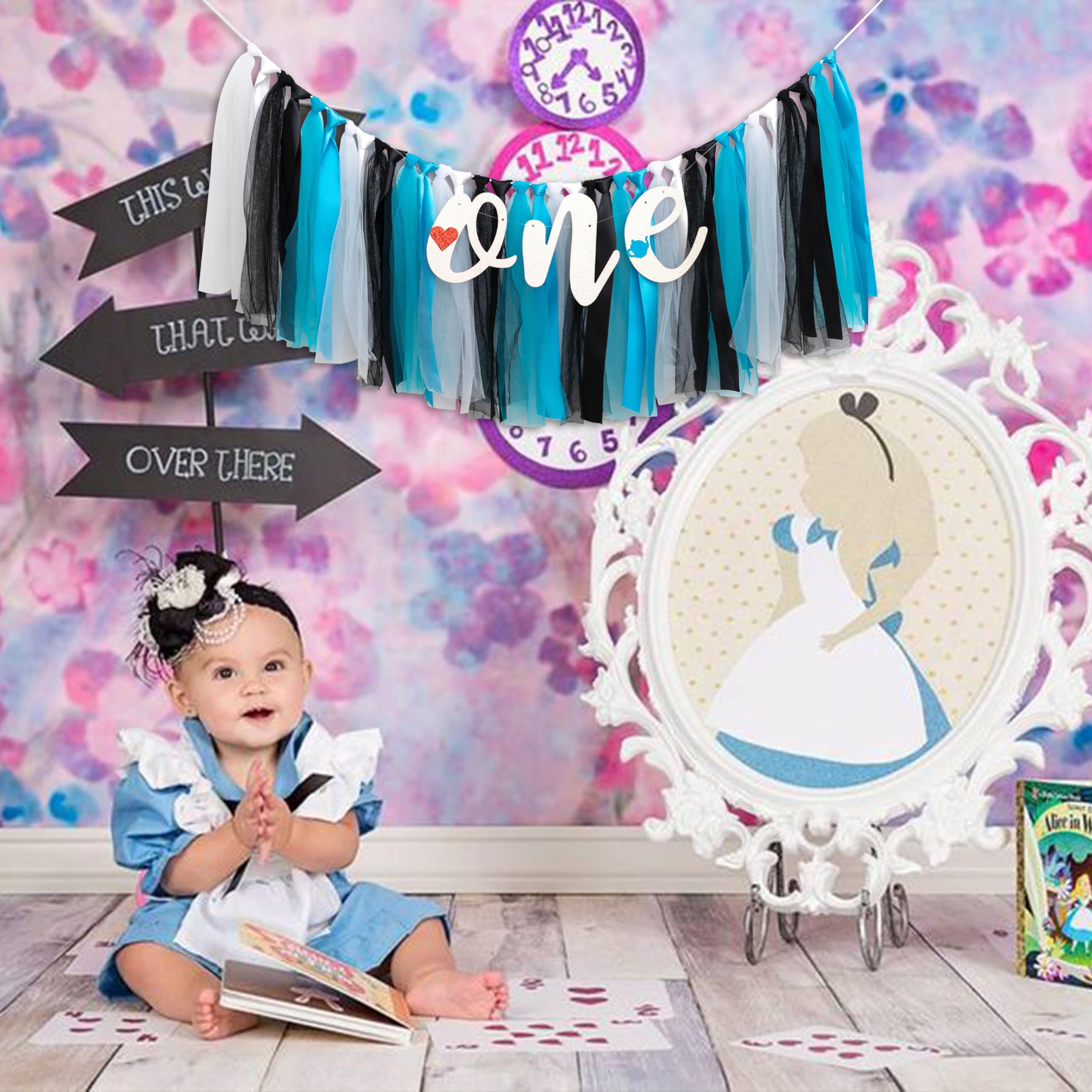 ALICE IN ONEDERLAND DESIGN - Featuring Alice, the teapot, and the iconic red heart, this banner captures the essence of the beloved fairy tale.Create a memorable first milestone with a banner that tells a story of wonder and enchantment.