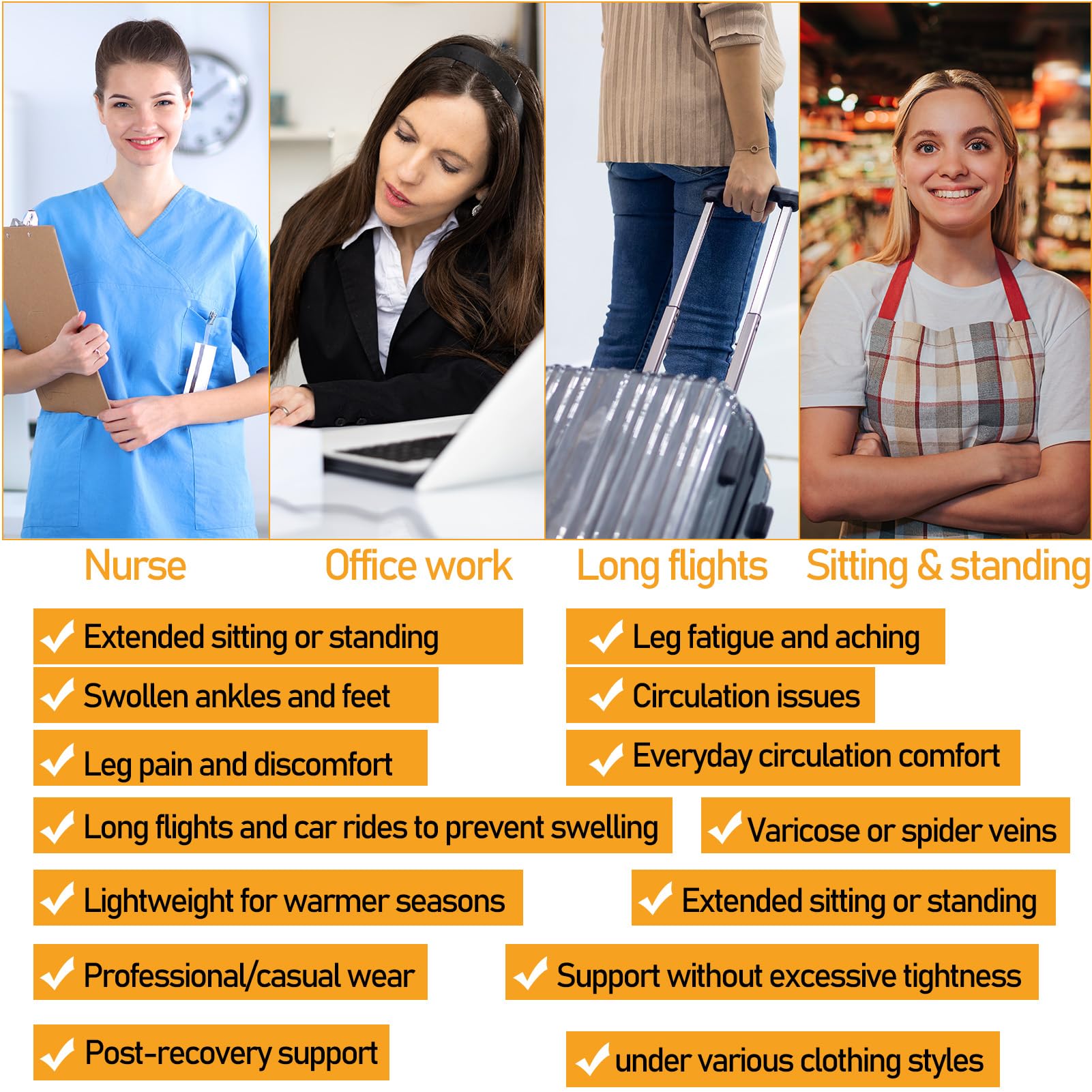 Graduated Compression: Engineered with a 15-20 mmHg graduated compression, these sheer stockings are precision-crafted to boost circulation, reduce fatigue, and alleviate the discomfort of sore aching tired legs, swelling, varicose veins, spider veins, edema, DVT blood, clots and other circulatory issues. They are the ideal companion for frequent travelers, pregnancy, work, office, pregnancy, muscle recovery and professionals who spend long periods standing or sitting.