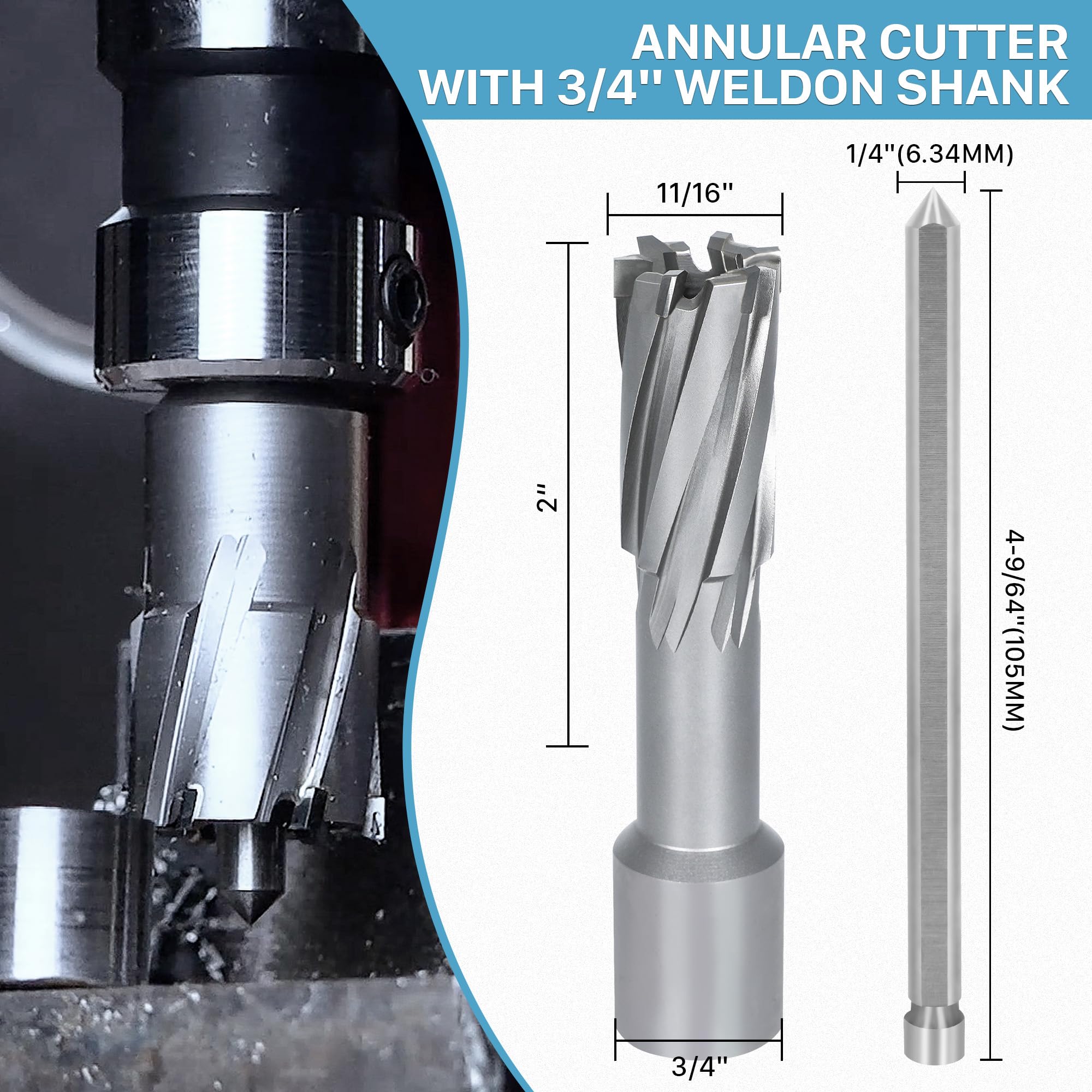 【Specifications】 - KEENTECH Annular Cutter features a premium carbide cutting edge for outstanding durability, making it ideal for drilling harder materials like stainless steel. It offers a 11/16" cutting diameter and a 2" cutting depth, and comes with a free pilot pin. The 3/4" weldon shank design is compatible with various magnetic drills, including but not limited to Alfra, Evolution, Dewalt, Vevor, Zelcan and Hougen.
