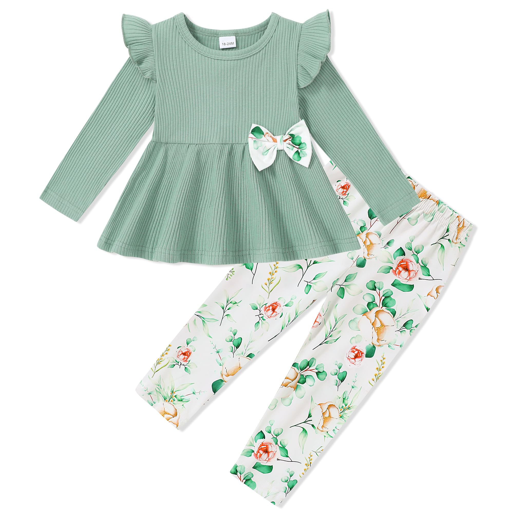 CUTE GIRLS CLOTHING: Cute Little toddler girls Bow-front High low top with Little Daisy Print pant set, adorable girls fall & Winter Two Piece Set.
