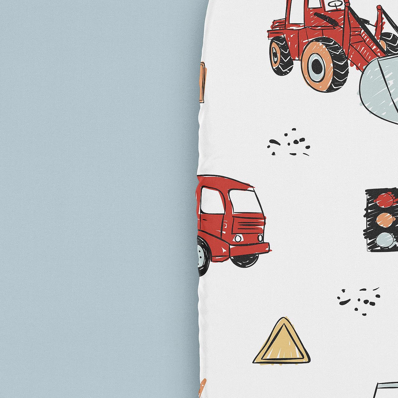 Pack of 2 Brushed Microfiber Sheets Set - (1) Solid Slate Blue paired with (1) Red Blue and Grey Yellow and Orange Construction Truck Transportation Brown Black and White Bulldozer Tractor Cement Mixer Crane Print
