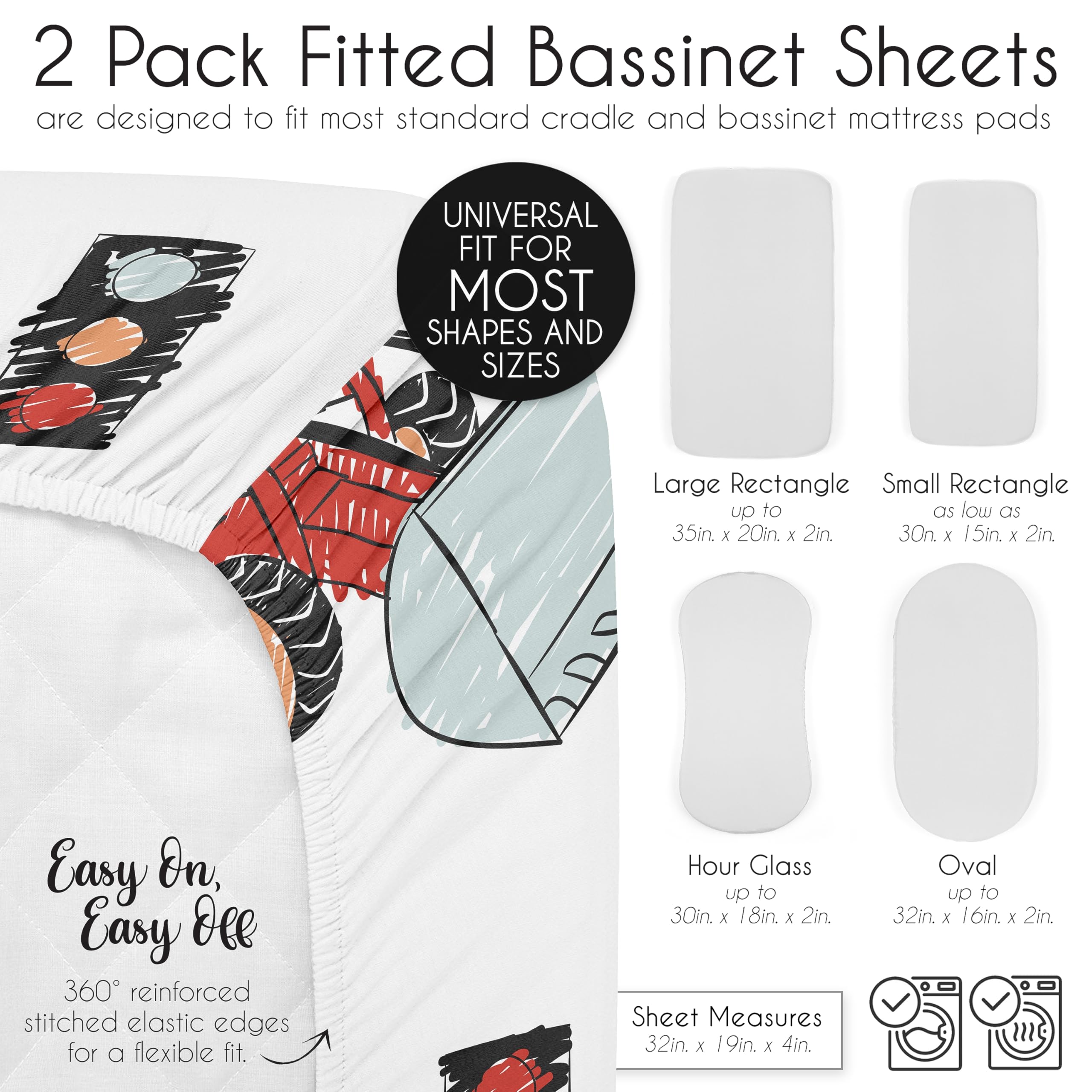 2 Pack Bassinet Sheet Set: 32in. x 19in. x 4in. each. WILL NOT FIT STANDARD SIZE OR MINI CRIBS