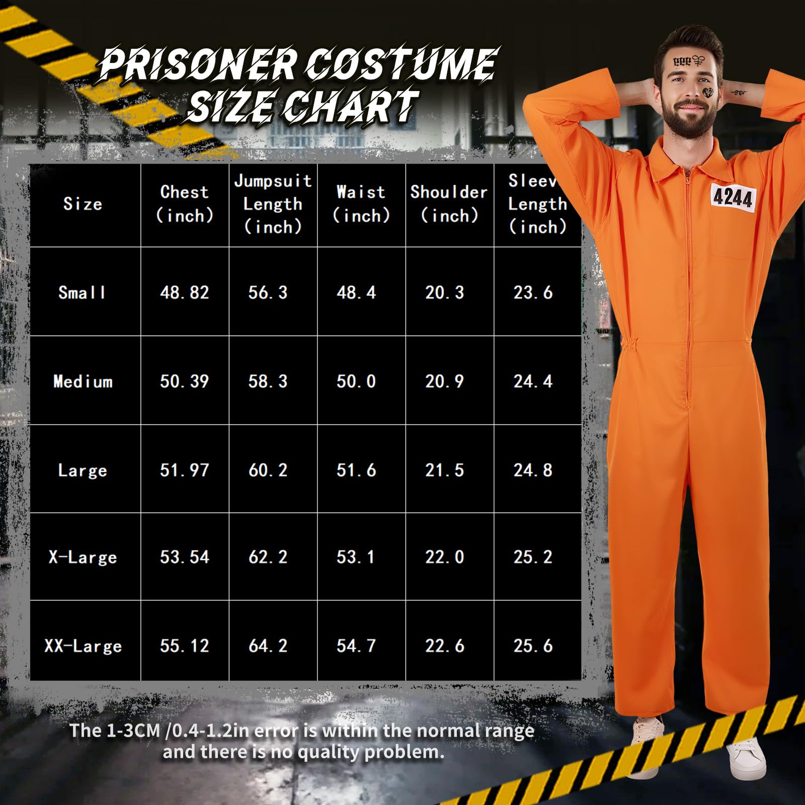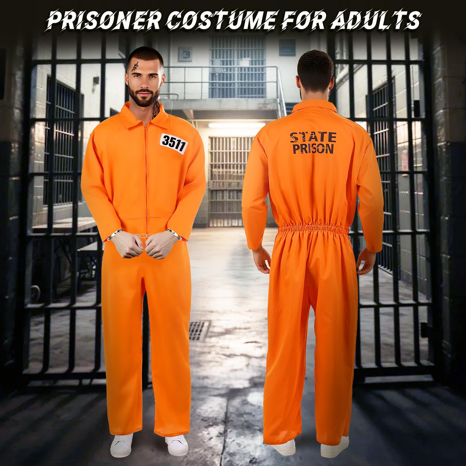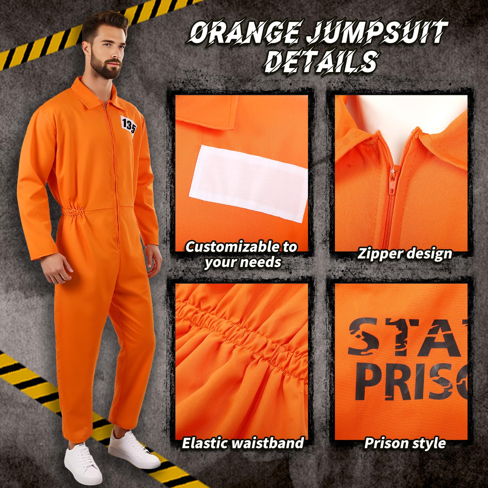 Prisoner Costume Design: Our prisoner jumpsuit for adults has a zipper design that is easy to put on or take off, with "STATE PRISON" printed on the back, the chest part of this prisoner suit is not printed, so you can DIY it yourself, the orange jumpsuit features a back elastic waistband that ensures a comfortable fit for all body types